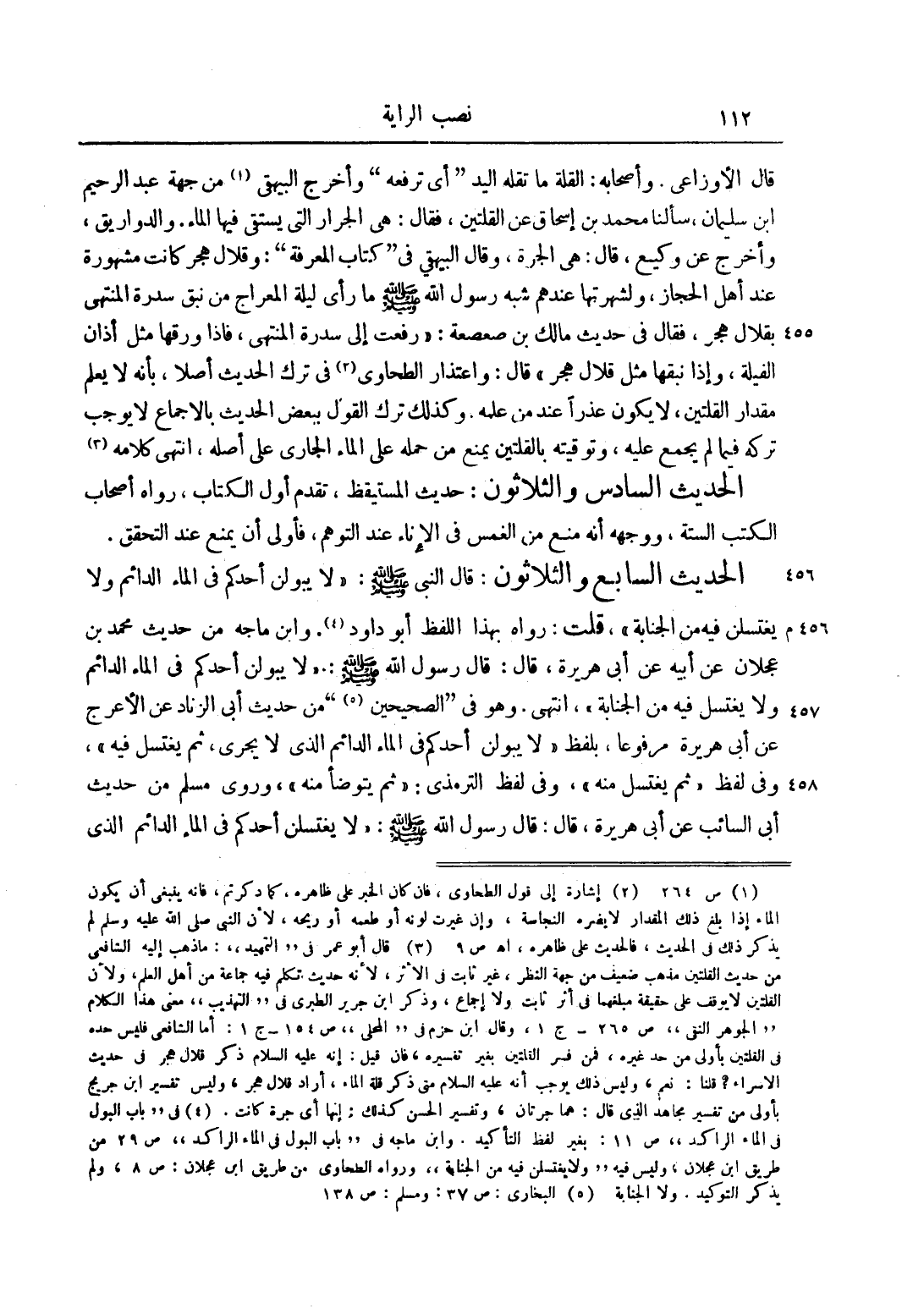 الْحَدِيثُ السَّابِعُ وَالثَّلَاثُونَ: قَالَ النَّبِيُّ صَلَّى اللَّهُ عَلَيْهِ وَسَلَّمَ: "لَا يَبُولَنَّ أَحَدُكُمْ فِي الْمَاءِ الدَّائِمِ وَلَا يَغْتَسِلَنَّ فِيهِ مِنْ الْجَنَابَةِ"، قُلْت: رَوَاهُ بِهَذَا اللَّفْظِ أَبُو دَاوُد4. وَابْنُ مَاجَهْ مِنْ حَدِيثِ مُحَمَّدِ بْنِ عَجْلَانَ عَنْ أَبِيهِ عَنْ أَبِي هُرَيْرَةَ، قَالَ: قَالَ رَسُولُ اللَّهِ صَلَّى اللَّهُ عَلَيْهِ وَسَلَّمَ: "لَا يَبُولَنَّ أَحَدُكُمْ فِي الْمَاءِ الدَّائِمِ وَلَا يَغْتَسِلْ فِيهِ مِنْ الْجَنَابَةِ"، انْتَهَى. وَهُوَ فِي الصَّحِيحَيْنِ5 مِنْ حَدِيثِ أَبِي الزِّنَادِ عَنْ الْأَعْرَجِ عَنْ أَبِي هُرَيْرَةَ مَرْفُوعًا، بِلَفْظِ لَا يَبُولَنَّ أَحَدُكُمْ فِي الْمَاءِ الدَّائِمِ الَّذِي لَا يَجْرِي، ثُمَّ يَغْتَسِلُ فِيهِ، وَفِي لَفْظٍ ثُمَّ يَغْتَسِلُ مِنْهُ، وَفِي لَفْظِ التِّرْمِذِيِّ: ثُمَّ يَتَوَضَّأُ مِنْهُ، وَرَوَى مُسْلِمٌ مِنْ حَدِيثِ أَبِي السَّائِبِ عَنْ أَبِي هُرَيْرَةَ، قَالَ: قَالَ رَسُولُ اللَّهِ صَلَّى اللَّهُ عَلَيْهِ وَسَلَّمَ "لَا يَغْتَسِلَنَّ أَحَدُكُمْ فِي الْمَاءِ الدَّائِمِ الَّذِي