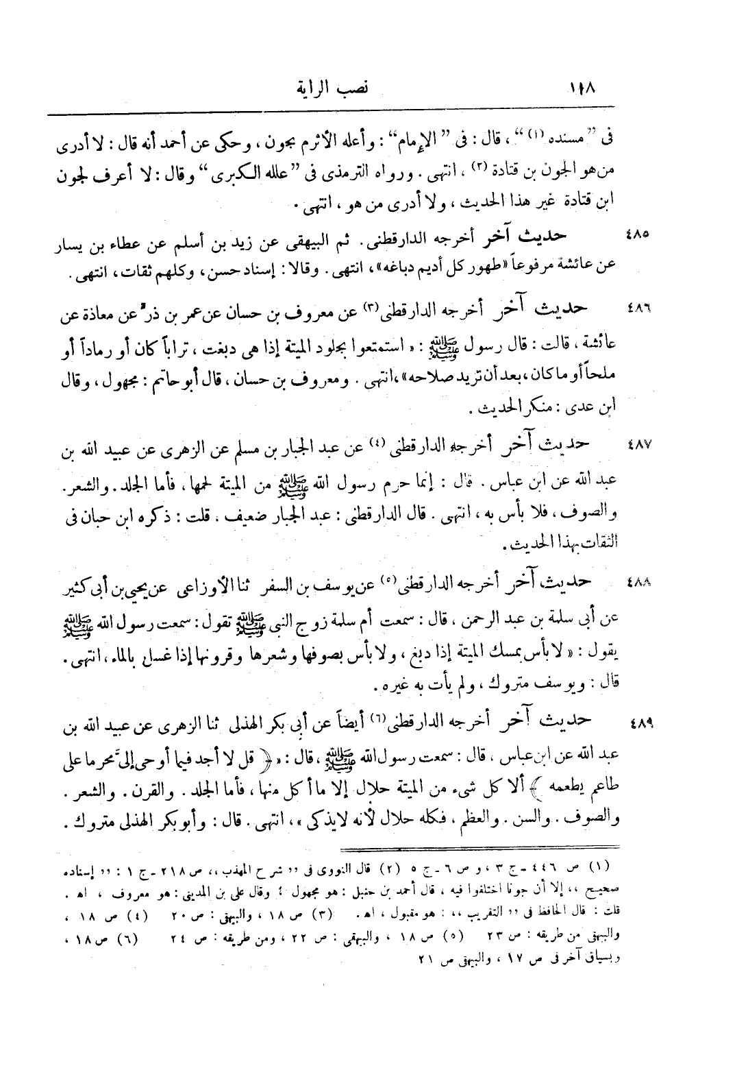 حَدِيثٌ آخَرُ أَخْرَجَهُ الدَّارَقُطْنِيُّ3 عَنْ مَعْرُوفِ بْنِ حَسَّانَ عَنْ عُمَرَ بْنِ ذَرٍّ عَنْ مُعَاذَةَ عَنْ عَائِشَةَ، قَالَتْ: قَالَ رَسُولُ اللَّهِ صَلَّى اللَّهُ عَلَيْهِ وَسَلَّمَ: "اسْتَمْتِعُوا بِجُلُودِ الْمَيْتَةِ إذَا هِيَ دُبِغَتْ، تُرَابًا كَانَ أَوْ رَمَادًا أَوْ مِلْحًا أَوْ مَا كَانَ بَعْدَ أَنْ يَزِيدَ صَلَاحُهُ"، انْتَهَى. وَمَعْرُوفُ بْنُ حَسَّانَ، قَالَ أَبُو حَاتِمٍ: مَجْهُولٌ، وَقَالَ ابْنُ عَدِيٍّ: مُنْكَرُ الْحَدِيثِ.