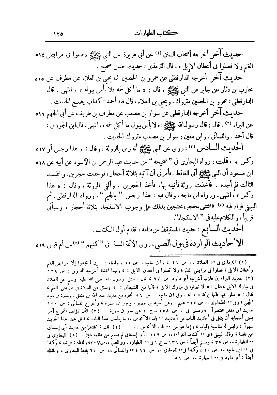2 حديث البراء بن عازب أخرجه أبو داود ص 77، قال: سئل رسول الله صَلَّى اللَّهُ عَلَيْهِ وَسَلَّمَ عن الصلاة في مبارك الإبل، فقال: "لا تصلوا في مبارك الإبل، فإنها من الشيطان"، وسئل عن الصلاة في مرابض الغنم، فقال: "صلوا فيها فإنها بركة"، اهـ. وفي ابن ماجه: ص 56 نحوه من حديث عبد الله بن مغفل. وسبرة بن معبد الجهني، وفي الطحاوي ص 224 عنهم. وعن أسيد بن حضير. وجابر بن سمرة، وأخرجه النسائي: ص 120 حديث ابن مغفل مختصراً ومسلم في: ص 158 - ج 1 عن جابر بن سمرة.