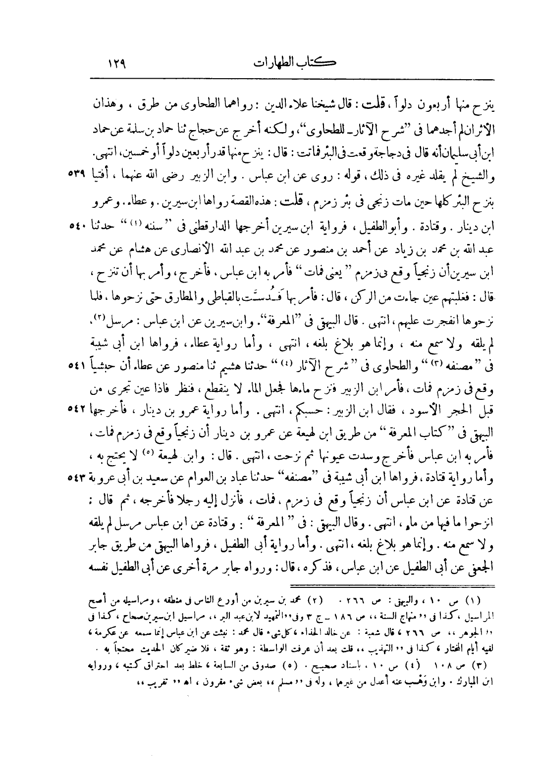 يُنْزَحُ مِنْهَا أرعون دَلْوًا، قُلْتُ: قَالَ شَيْخُنَا عَلَاءُ الدِّينِ: رَوَاهُمَا الطَّحَاوِيُّ مِنْ طُرُقٍ، وَهَذَانِ الْأَثَرَانِ لَمْ أَجِدْهُمَا فِي شَرْحِ الْآثَارِ - لِلطَّحَاوِيِّ، وَلَكِنَّهُ أَخْرَجَ عَنْ حَجَّاجٍ ثَنَا حَمَّادُ بْنُ سَلَمَةَ عَنْ حَمَّادِ بْنِ أَبِي سُلَيْمَانَ أَنَّهُ قَالَ فِي دَجَاجَةٍ وَقَعَتْ فِي الْبِئْرِ فَمَاتَتْ، قَالَ: ينزح منها قد أَرْبَعِينَ دَلْوًا أَوْ خَمْسِينَ، انْتَهَى. وَالشَّيْخُ لَمْ يُقَلِّدْ غَيْرَهُ فِي ذَلِكَ، قَوْلُهُ: رُوِيَ عَنْ ابْنِ عَبَّاسٍ. وَابْنِ الزُّبَيْرِ رضي الله عنهما، أَفْتَيَا بِنَزْحِ الْبِئْرِ كُلِّهَا حِينَ مَاتَ زِنْجِيٌّ فِي بِئْرِ زَمْزَمَ، قُلْتُ: هَذِهِ الْقِصَّةُ رَوَاهَا ابْنُ سِيرِينَ. وَعَطَاءٌ. وَعَمْرُو بْنُ دِينَارٍ. وَقَتَادَةُ. وَأَبُو الطُّفَيْلِ، فَرِوَايَةُ ابْنِ سِيرِينَ أَخْرَجَهَا الدَّارَقُطْنِيُّ فِي سُنَنِهِ1 حَدَّثَنَا عَبْدُ اللَّهِ بْنُ مُحَمَّدِ بْنِ زِيَادٍ عَنْ أَحْمَدَ بْنِ مَنْصُورٍ عَنْ مُحَمَّدِ بْنِ عَبْدِ اللَّهِ الْأَنْصَارِيِّ عَنْ هِشَامٍ عَنْ مُحَمَّدِ بْنِ سِيرِينَ أَنَّ زِنْجِيًّا وَقَعَ فِي زَمْزَمَ يَعْنِي فَمَاتَ فَأَمَرَ بِهِ ابْنُ عَبَّاسٍ، فَأُخْرِجَ، وَأَمَرَ بِهَا أَنْ تُنْزَحَ، قَالَ: فَغَلَبَتْهُمْ عَيْنٌ جَاءَتْ مِنْ الرُّكْنِ، قَالَ: فَأَمَرَ بِهَا فَدُسَّتْ بالقباطي والمطارق حتى نزحزها، فَلَمَّا نَزَحُوهَا انْفَجَرَتْ عَلَيْهِمْ، انْتَهَى. قَالَ الْبَيْهَقِيُّ فِي الْمَعْرِفَةِ: وَابْنُ سِيرِينَ عَنْ ابْنِ عَبَّاسٍ: مُرْسَلٌ2 لَمْ يَلْقَهُ وَلَا سَمِعَ مِنْهُ، وَإِنَّمَا هُوَ بَلَاغٌ بَلَغَهُ، انْتَهَى. وَأَمَّا رِوَايَةُ عَطَاءٍ، فَرَوَاهَا ابْنُ أَبِي شَيْبَةَ فِي مُصَنَّفِهِ3 وَالطَّحَاوِيُّ فِي شَرْحِ الْآثَارِ4 حَدَّثَنَا هُشَيْمِ ثَنَا مَنْصُورٌ عَنْ عَطَاءٍ أَنَّ حَبَشِيًّا وَقَعَ فِي زَمْزَمَ فَمَاتَ، فَأَمَرَ ابْنُ الزبير فنزح ماءها فَجَعَلَ الْمَاءُ لَا يَنْقَطِعُ، فَنُظِرَ فَإِذَا عَيْنٌ تَجْرِي مِنْ قِبَلِ الْحَجَرِ الْأَسْوَدِ، فَقَالَ ابْنُ الزُّبَيْرِ: حَسْبُكُمْ، انْتَهَى. وَأَمَّا رِوَايَةُ عَمْرِو بْنِ دِينَارٍ، فَأَخْرَجَهَا الْبَيْهَقِيُّ فِي كِتَابِ الْمَعْرِفَةِ مِنْ طَرِيقِ ابْنِ لَهِيعَةَ عَنْ عَمْرِو بْنِ دِينَارٍ أَنَّ زِنْجِيًّا وَقَعَ فِي زَمْزَمَ فَمَاتَ، فَأَمَرَ بِهِ ابْنُ عَبَّاسٍ فَأُخْرِجَ وَسُدَّتْ عُيُونُهَا ثُمَّ نُزِحَتْ، انْتَهَى. قَالَ: وَابْنُ لَهِيعَةَ5 لَا يُحْتَجُّ بِهِ، وَأَمَّا رِوَايَةُ قَتَادَةَ، فَرَوَاهَا ابْنُ أَبِي شَيْبَةَ في مصنفه ثنا عبد بْنُ الْعَوَّامِ عَنْ سَعِيدِ بْنِ أَبِي عَرُوبَةَ عَنْ قَتَادَةَ عَنْ ابْنِ عَبَّاسٍ أَنَّ زِنْجِيًّا وَقَعَ فِي زَمْزَمَ، فَمَاتَ، فَأَنْزَلَ إلَيْهِ رَجُلًا فَأَخْرَجَهُ، ثُمَّ قَالَ: انْزَحُوا مَا فِيهَا مِنْ مَاءٍ، انْتَهَى. وَقَالَ الْبَيْهَقِيُّ: فِي الْمَعْرِفَةِ: وَقَتَادَةُ عَنْ ابْنِ عَبَّاسٍ مُرْسَلٌ لَمْ يَلْقَهُ وَلَا سَمِعَ مِنْهُ. وإنما هُوَ بَلَاغٌ بَلَغَهُ، انْتَهَى. وَأَمَّا رِوَايَةُ أَبِي الطُّفَيْلِ، فَرَوَاهَا الْبَيْهَقِيُّ مِنْ طَرِيقِ جَابِرٍ الْجُعْفِيِّ عَنْ أَبِي الطُّفَيْلِ عَنْ ابْنِ عَبَّاسٍ، فَذَكَرَهُ، قَالَ: وَرَوَاهُ جَابِرٌ مَرَّةً أُخْرَى عَنْ أَبِي الطُّفَيْلِ نَفْسِهِ
