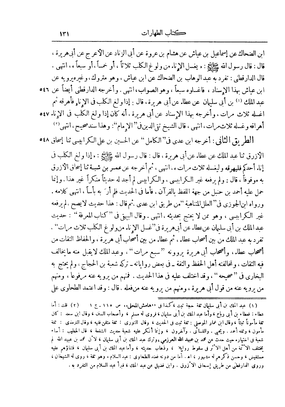 بْنِ الضَّحَّاكِ عَنْ إسْمَاعِيلَ بْنِ عَيَّاشٍ عَنْ هِشَامِ بْنِ عُرْوَةَ عَنْ أَبِي الزِّنَادِ عَنْ الْأَعْرَجِ عَنْ أَبِي هُرَيْرَةَ، قَالَ: قَالَ رَسُولُ اللَّهِ صَلَّى اللَّهُ عَلَيْهِ وَسَلَّمَ: "يُغْسَلُ الْإِنَاءُ مِنْ وُلُوغِ الْكَلْبِ ثَلَاثًا، أَوْ خَمْسًا، أَوْ سَبْعًا"، انْتَهَى. قَالَ الدَّارَقُطْنِيُّ: تَفَرَّدَ بِهِ عَبْدُ الْوَهَّابِ بْنُ الضَّحَّاكِ عَنْ ابْنِ عَيَّاشٍ، وَهُوَ مَتْرُوكٌ، وَغَيْرُهُ يَرْوِيهِ عَنْ ابْنِ عَيَّاشٍ بِهَذَا الْإِسْنَادِ، فَاغْسِلُوهُ سَبْعًا، وَهُوَ الصَّحِيحُ، انْتَهَى. وَأَخْرَجَهُ الدَّارَقُطْنِيُّ أَيْضًا عَنْ عَبْدِ الْمَلِكِ1 بْنِ سُلَيْمَانَ عَنْ عَطَاءٍ عَنْ أَبِي هُرَيْرَةَ، قَالَ: إذَا وَلَغَ الْكَلْبُ فِي الْإِنَاءِ فَأَهْرِقْهُ ثُمَّ اغْسِلْهُ ثَلَاثَ مَرَّاتٍ، وَأَخْرَجَهُ بِهَذَا الْإِسْنَادِ عَنْ أَبِي هُرَيْرَةَ، أَنَّهُ كَانَ إذَا وَلَغَ الْكَلْبُ في الإناء أهراقه وَغَسَلَهُ ثَلَاثَ مَرَّاتٍ، انْتَهَى. قَالَ الشَّيْخُ تَقِيُّ الدِّينِ فِي الْإِمَامِ: وَهَذَا سَنَدٌ صَحِيحٌ، انْتَهَى2.