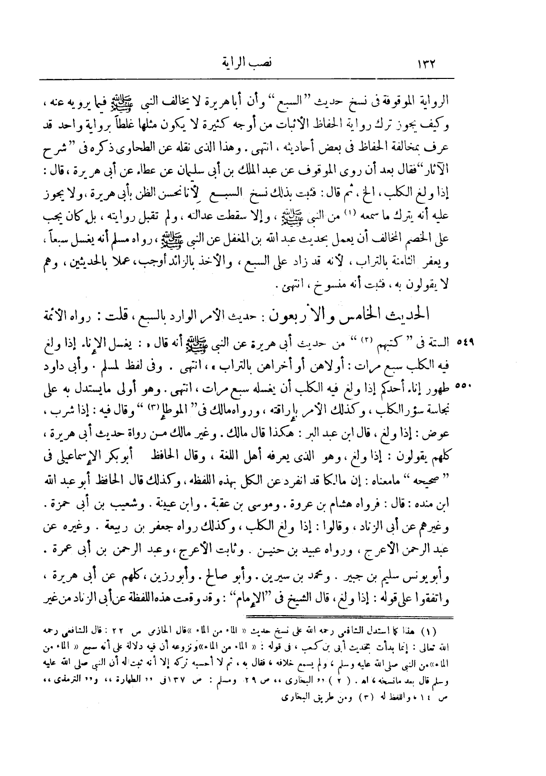 الرِّوَايَةِ الْمَوْقُوفَةِ فِي نَسْخِ حَدِيثِ السَّبْعِ وَأَنَّ أَبَا هُرَيْرَةَ لَا يُخَالِفُ النَّبِيَّ صَلَّى اللَّهُ عَلَيْهِ وَسَلَّمَ فِيمَا يَرْوِيه عَنْهُ، وَكَيْفَ يَجُوزُ تَرْكُ رِوَايَةِ الْحُفَّاظِ الْأَثْبَاتِ مِنْ أَوْجُهٍ كَثِيرَةٍ لَا يَكُونُ مِثْلُهَا غَلَطًا بِرِوَايَةِ وَاحِدٍ قَدْ عُرِفَ بِمُخَالَفَةِ الْحُفَّاظِ فِي بَعْضِ أَحَادِيثِهِ، انْتَهَى. وَهَذَا الَّذِي نَقَلَهُ عَنْ الطَّحَاوِيِّ ذَكَرَهُ فِي شَرْحِ الْآثَارِ فَقَالَ بَعْدَ أَنْ رَوَى الْمَوْقُوفَ عَنْ عَبْدِ الْمَلِكِ بْنِ أَبِي سُلَيْمَانَ عَنْ عَطَاءٍ عَنْ أَبِي هُرَيْرَةَ، قَالَ: إذَا وَلَغَ الْكَلْبُ، إلَخْ، ثُمَّ قَالَ: فَثَبَتَ بِذَلِكَ نَسْخُ السَّبْعِ لِأَنَّا نُحْسِنُ الظَّنَّ بِأَبِي هُرَيْرَةَ، وَلَا يَجُوزُ عَلَيْهِ أَنَّهُ يَتْرُكُ مَا سَمِعَهُ1 مِنْ النَّبِيِّ صَلَّى اللَّهُ عَلَيْهِ وَسَلَّمَ، وَإِلَّا سَقَطَتْ عَدَالَتُهُ، وَلَمْ يُقْبَلْ رِوَايَتُهُ، بَلْ كَانَ يَجِبُ عَلَى الْخَصْمِ الْمُخَالِفِ أَنْ يَعْمَلَ بِحَدِيثِ عَبْدِ اللَّهِ بْنِ الْمُغَفَّلِ عَنْ النَّبِيِّ صَلَّى اللَّهُ عَلَيْهِ وَسَلَّمَ، رَوَاهُ مُسْلِمٌ أَنَّهُ يُغْسَلُ يسبعاً، وَيُعَفِّرُ الثَّامِنَةَ بِالتُّرَابِ، لِأَنَّهُ قَدْ زَادَ عَلَى السَّبْعِ، وَالْأَخْذُ بِالزَّائِدِ أَوْجَبُ عَمَلًا بِالْحَدِيثَيْنِ، وَهُمْ لَا يَقُولُونَ بِهِ، فَثَبَتَ أَنَّهُ مَنْسُوخٌ، انْتَهَى.