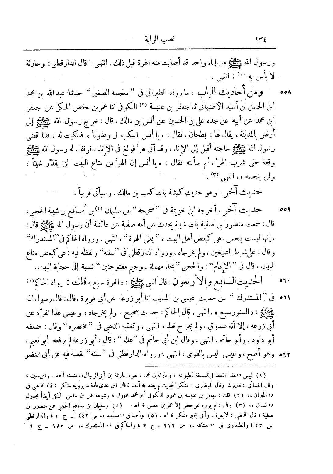 حَدِيثٌ آخَرُ، أَخْرَجَهُ ابْنُ خُزَيْمَةَ فِي صَحِيحِهِ عَنْ سُلَيْمَانَ4 بْنِ مُسَافِعِ بْنِ شَيْبَةَ الْحَجَبِيِّ، قَالَ: سَمِعْتُ مَنْصُورَ بْنَ صَفِيَّةَ بِنْتِ شَيْبَةَ يُحَدِّثُ عَنْ أُمِّهِ صَفِيَّةَ عَنْ عَائِشَةَ أَنَّ رَسُولَ اللَّهِ صَلَّى اللَّهُ عَلَيْهِ وَسَلَّمَ قَالَ: "إنَّهَا لَيْسَتْ بِنَجَسٍ، هِيَ كَبَعْضِ أَهْلِ الْبَيْتِ يَعْنِي الْهِرَّةَ"، انْتَهَى. وَرَوَاهُ الْحَاكِمُ فِي الْمُسْتَدْرَكِ وَقَالَ: عَلَى شَرْطِ الشَّيْخَيْنِ، وَلَمْ يُخَرِّجَاهُ، وَرَوَاهُ الدَّارَقُطْنِيُّ فِي سُنَنِهِ وَلَفْظُهُ فِيهِ: هِيَ كَبَعْضِ مَتَاعِ الْبَيْتِ، قَالَ فِي الْإِمَامِ: وَالْحَجَبِيُّ بِحَاءٍ مُهْمَلَةٍ. وَجِيمٍ مَفْتُوحَتَيْنِ نِسْبَتُهُ إلَى حِجَابَةِ الْبَيْتِ.