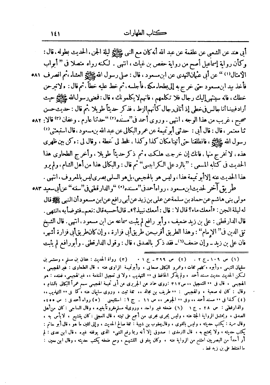 أَبِي هِنْدٍ عَنْ الشَّعْبِيِّ عَنْ عَلْقَمَةَ عَنْ عَبْدِ اللَّهِ أَنَّهُ كَانَ مَعَ النَّبِيِّ صَلَّى اللَّهُ عَلَيْهِ وَسَلَّمَ لَيْلَةَ الْجِنِّ، الْحَدِيثُ بِطُولِهِ، قَالَ: وَكَأَنَّ رِوَايَةَ إسْمَاعِيلَ أَصَحُّ مِنْ رِوَايَةِ حَفْصِ بْنِ غِيَاثٍ، انْتَهَى. لَكِنَّهُ رَوَاهُ مُتَّصِلًا فِي أَبْوَابِ الْأَمْثَالِ1 عَنْ أَبِي عُثْمَانَ النَّهْدِيِّ عَنْ ابْنِ مَسْعُودٍ، قَالَ: صَلَّى رَسُولُ اللَّهِ صَلَّى اللَّهُ عَلَيْهِ وَسَلَّمَ الْعِشَاءَ، ثُمَّ انْصَرَفَ فَأَخَذَ بِيَدِ ابْنِ مَسْعُودٍ حَتَّى خَرَجَ بِهِ إلَى بَطْحَاءِ مَكَّةَ، فَأَجْلَسَهُ، ثُمَّ خَطَّ عَلَيْهِ خَطًّا، ثُمَّ قَالَ: "لا تبرحن مخطك، فَإِنَّهُ سَيَنْتَهِي إلَيْكَ رِجَالٌ لا تُكَلِّمْهُمْ، فَإِنَّهُمْ لَا يُكَلِّمُونَكَ" قَالَ: فَمَضَى رَسُولُ اللَّهِ صَلَّى اللَّهُ عَلَيْهِ وَسَلَّمَ حَيْثُ أَرَادَ بَيْنَمَا أَنَا جالس في خطي إذ أَتَانِي رِجَالٌ كَأَنَّهُمْ الزُّطُّ، فَذَكَرَ حَدِيثًا طَوِيلًا، ثُمَّ قَالَ: حَدِيثٌ حَسَنٌ صَحِيحٌ، غَرِيبٌ مِنْ هَذَا الْوَجْهِ، انْتَهَى. وَرَوَى أَحْمَدُ فِي مُسْنَدِهِ2 حَدَّثَنَا عَارِمٌ. وَعَفَّانُ 3 قَالَا: ثَنَا مُعْتَمِرٌ، قَالَ: قال أبي: حددثني أَبُو تَمِيمَةَ عَنْ عَمْرٍو الْبِكَالِيِّ عَنْ عَبْدِ اللَّهِ بْنِ مَسْعُودٍ، قَالَ: اسْتَبْعَثَنِي4 رَسُولُ اللَّهِ صَلَّى اللَّهُ عَلَيْهِ وَسَلَّمَ، فَانْطَلَقْنَا حَتَّى أَتَيْنَا مَكَانَ كَذَا وَكَذَا، فَخَطَّ لِي خِطَّةً، وَقَالَ لِي: "كُنْ بَيْنَ ظَهْرَيْ هَذِهِ، لَا تَخْرُجْ مِنْهَا، فَإِنَّكَ إنْ خَرَجْتَ هَلَكْتَ" ثُمَّ ذَكَرَ حَدِيثًا طَوِيلًا، وَأَخْرَجَ الطَّحَاوِيُّ هَذَا الْحَدِيثَ فِي كِتَابِهِ الْمُسَمَّى: بِالرَّدِّ عَلَى الْكَرَابِيسِيِّ ثُمَّ قَالَ: وَالْبُكَالِيُّ هَذَا مِنْ أَهْلِ الشَّامِ، وَلَمْ يَرْوِ هَذَا الْحَدِيثَ عَنْهُ إلَّا أَبُو تَمِيمَةَ هَذَا وَلَيْسَ هُوَ بِالْهُجَيْمِيِّ، بَلْ هُوَ السُّلَمِيُّ بَصْرِيٌّ لَيْسَ بِالْمَعْرُوفِ، انْتَهَى.