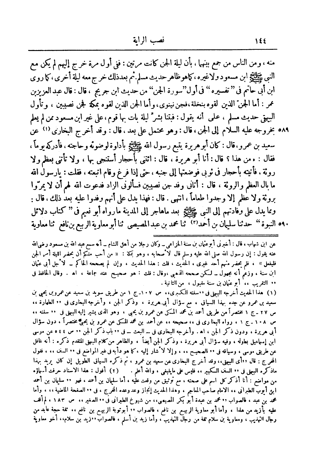 مِنْهُ، وَمِنْ النَّاسِ مَنْ جَمَعَ بَيْنَهُمَا، بِأَنَّ لَيْلَةَ الْجِنِّ كَانَتْ مَرَّتَيْنِ: فَفِي أَوَّلِ مَرَّةٍ خَرَجَ إلَيْهِمْ لَمْ يَكُنْ مَعَ النَّبِيِّ صَلَّى اللَّهُ عَلَيْهِ وَسَلَّمَ ابْنُ مَسْعُودٍ وَلَا غَيْرُهُ، كَمَا هُوَ ظَاهِرُ حَدِيثِ مُسْلِمٍ. ثُمَّ بَعْدَ ذَلِكَ خَرَجَ مَعَهُ لَيْلَةً أُخْرَى، كَمَا رَوَى ابْنُ أَبِي حَاتِمٍ في تفسيره من أَوَّلِ سُورَةِ الْجِنِّ مِنْ حَدِيثِ ابْنِ جُرَيْجٍ، قَالَ: قَالَ عَبْدُ الْعَزِيزِ بْنُ عُمَرَ: أَمَّا الْجِنُّ الَّذِينَ لَقُوهُ بِنَخْلَةٍ، فَمِنْ نِينَوَى، وَأَمَّا الْجِنُّ الَّذِينَ لَقُوهُ بمكة فمن نَصِيبِينَ، وَتَأَوَّلَ الْبَيْهَقِيُّ حَدِيثَ مُسْلِمٍ، قَالَ: إنَّهُ يَقُولُ: فَبِتْنَا بِشَرِّ لَيْلَةٍ بَاتَ بِهَا قَوْمٌ، عَلَى غَيْرِ ابْنِ مَسْعُودٍ مِمَّنْ لَمْ يَعْلَمْ بِخُرُوجِهِ عليه السلام إلَى الْجِنِّ، قَالَ: وَهُوَ مُحْتَمِلٌ عَلَى بُعْدٍ، قَالَ: وَقَدْ أَخْرَجَ الْبُخَارِيُّ1 عَنْ سَعِيدِ بْنِ عَمْرٍو، قَالَ: كَانَ أَبُو هُرَيْرَةَ يَتْبَعُ رَسُولَ اللَّهِ صَلَّى اللَّهُ عَلَيْهِ وَسَلَّمَ بِإِدَاوَةٍ لِوُضُوئِهِ وَحَاجَتِهِ، فَأَدْرَكَهُ يَوْمًا، فَقَالَ: " مَنْ هَذَا؟ " قَالَ أَنَا أَبُو هُرَيْرَةَ، قَالَ: "ائْتِنِي بِأَحْجَارٍ أَسْتَنْجِي بِهَا، وَلَا تَأْتِنِي بِعَظْمٍ وَلَا رَوْثَةٍ"، فَأَتَيْتُهُ بِأَحْجَارٍ فِي ثَوْبِي فَوَضَعْتُهَا إلَى جَنْبِهِ، حَتَّى إذَا فَرَغَ وَقَامَ اتَّبَعْتُهُ، فَقُلْتُ: يَا رَسُولَ اللَّهِ مَا بَالُ الْعَظْمِ وَالرَّوْثَةِ، قَالَ: "أَتَانِي وَفْدُ جِنِّ نَصِيبِينَ فَسَأَلُونِي الزَّادَ فَدَعَوْتُ اللَّهَ لَهُمْ أَنْ لَا يَمُرُّوا بِرَوْثَةٍ وَلَا عَظْمٍ إلَّا وَجَدُوا طَعَامًا"، انْتَهَى. قَالَ: فَهَذَا يَدُلُّ عَلَى أَنَّهُمْ وَفَدُوا عَلَيْهِ بَعْدَ ذَلِكَ، قَالَ: وَمِمَّا يَدُلُّ عَلَى وِفَادَتِهِمْ إلَى النَّبِيِّ صَلَّى اللَّهُ عَلَيْهِ وَسَلَّمَ بَعْدَ مَا هَاجَرَ إلَى الْمَدِينَةِ مَا رَوَاهُ أَبُو نُعَيْمٍ فِي كِتَابِ دَلَائِلِ النُّبُوَّةِ حَدَّثَنَا سُلَيْمَانُ بْنُ أَحْمَدَ2 ثَنَا مُحَمَّدُ بْنُ عبد المصيصي ثنا أبو معاوية الرَّبِيعُ بْنُ نَافِعٍ ثَنَا معاوية