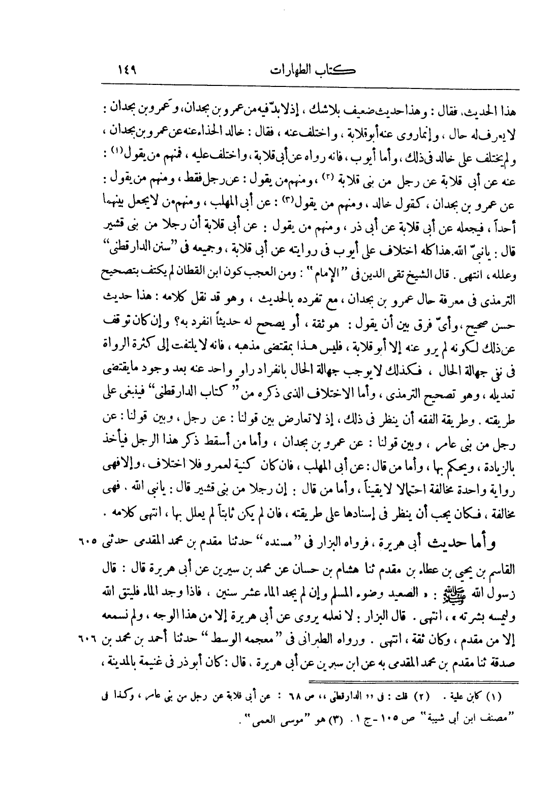 هَذَا الْحَدِيثَ، فَقَالَ: وَهَذَا حَدِيثٌ ضَعِيفٌ بِلَا شَكٍّ، إذْ لَا بُدَّ فِيهِ مِنْ عَمْرِو بْنِ بُجْدَانَ، وَعَمْرُو بْنُ بُجْدَانَ: لَا يُعْرَفُ لَهُ حَالٌ، وَإِنَّمَا رَوَى عَنْهُ أَبُو قِلَابَةَ، وَاخْتُلِفَ عَنْهُ، فَقَالَ: خَالِدٌ الْحَذَّاءُ عَنْهُ عَنْ عَمْرِو بْنِ بُجْدَانَ، وَلَمْ يُخْتَلَفْ عَلَى خَالِدٍ فِي ذَلِكَ، وَأَمَّا أَيُّوبُ، فَإِنَّهُ رَوَاهُ عَنْ أَبِي قِلَابَةَ، وَاخْتُلِفَ عَلَيْهِ، فَمِنْهُمْ مَنْ يَقُولُ:1عَنْهُ عَنْ أَبِي قِلَابَةَ عَنْ رَجُلٍ مِنْ بَنِي قِلَابَةَ2 وَمِنْهُمْ مَنْ يَقُولُ: عَنْ رَجُلٍ فَقَطْ، وَمِنْهُمْ مَنْ يَقُولُ: عَنْ عَمْرِو بْنِ بُجْدَانَ، كَقَوْلِ خَالِدٍ، وَمِنْهُمْ مَنْ يَقُولُ3: عَنْ أَبِي الْمُهَلَّبِ، وَمِنْهُمْ مَنْ لَا يَجْعَلُ بَيْنَهُمَا أَحَدًا، فَيَجْعَلُهُ عَنْ أَبِي قِلَابَةَ عَنْ أَبِي ذَرٍّ، وَمِنْهُمْ مَنْ يَقُولُ: عَنْ أَبِي قِلَابَةَ أَنَّ رَجُلًا مِنْ بَنِي قُشَيْرٍ قَالَ: يَا نَبِيَّ اللَّهِ. هَذَا كُلُّهُ اخْتِلَافٌ عَلَى أَيُّوبَ فِي رِوَايَتِهِ عَنْ أَبِي قِلَابَةَ، وَجَمِيعُهُ فِي سُنَنِ الدَّارَقُطْنِيِّ وَعَلَّلَهُ، انْتَهَى. قَالَ الشَّيْخُ تَقِيُّ الدِّينِ فِي الْإِمَامِ: وَمِنْ العجب كون الْقَطَّانِ لَمْ يَكْتَفِ بِتَصْحِيحِ التِّرْمِذِيِّ فِي مَعْرِفَةِ حَالِ عَمْرِو بْنِ بُجْدَانَ، مَعَ تَفَرُّدِهِ بِالْحَدِيثِ، وَهُوَ قَدْ تقل كَلَامَهُ: هَذَا حَدِيثٌ حَسَنٌ صَحِيحٌ، وَأَيُّ فَرْقٍ بَيْنَ أَنْ يَقُولَ: هُوَ ثِقَةٌ، أَوْ يُصَحَّحَ لَهُ حَدِيثٌ انْفَرَدَ بِهِ؟ وَإِنْ كَانَ تَوَقَّفَ عَنْ ذَلِكَ لِكَوْنِهِ لَمْ يَرْوِ عَنْهُ إلَّا أَبُو قِلَابَةَ، فَلَيْسَ هَذَا: بِمُقْتَضَى مَذْهَبِهِ، فَإِنَّهُ لَا يَلْتَفِتُ إلَى كَثْرَةِ الرُّوَاةِ فِي نَفْيِ جَهَالَةِ الْحَالِ، فَكَذَلِكَ لَا يُوجِبُ جَهَالَةَ الْحَالِ بِانْفِرَادِ رَاوٍ وَاحِدٍ عَنْهُ بَعْدَ وُجُودِ مَا يَقْتَضِي تَعْدِيلَهُ، وَهُوَ تَصْحِيحُ التِّرْمِذِيِّ، وَأَمَّا الِاخْتِلَافُ الَّذِي ذَكَرَهُ مِنْ كِتَابِ الدَّارَقُطْنِيِّ فَيَنْبَغِي عَلَى طَرِيقَتِهِ. وَطَرِيقَةُ الْفِقْهِ أَنْ يُنْظَرَ فِي ذَلِكَ، إذْ لَا تَعَارُضَ بَيْنَ قَوْلِنَا: عَنْ رَجُلٍ، وَبَيْنَ قَوْلِنَا: عَنْ رَجُلٍ من بين عَامِرٍ، وَبَيْنَ قَوْلِنَا عَنْ عَمْرِو بْنِ بُجْدَانَ، وَأَمَّا مَنْ أَسْقَطَ ذِكْرَ هَذَا الرَّجُلِ فَيَأْخُذُ بِالزِّيَادَةِ، وَيَحْكُمُ به، وَأَمَّا مَنْ قَالَ: عَنْ أَبِي الْمُهَلَّبِ، فَإِنْ كَانَ كُنْيَةً لِعَمْرٍو فَلَا اخْتِلَافَ، وَإِلَّا فَهِيَ رِوَايَةٌ وَاحِدَةٌ مُخَالِفَةٌ احْتِمَالًا لَا يَقِينًا، وَأَمَّا مَنْ قَالَ: إنَّ رَجُلًا مِنْ بَنِي قُشَيْرٍ قَالَ: يَا نَبِيَّ اللَّهِ، فَهِيَ مُخَالِفَةٌ، فَكَانَ يَجِبُ أَنْ يَنْظُرَ فِي إسْنَادِهَا عَلَى طَرِيقَتِهِ، فَإِنْ لَمْ يَكُنْ ثَابِتًا لَمْ يُعَلِّلْ بِهَا، انْتَهَى كَلَامُهُ.