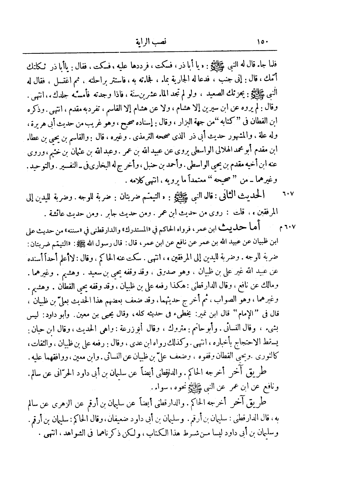 أَمَّا حَدِيثُ ابْنِ عُمَرَ، فَرَوَاهُ فِي الْمُسْتَدْرَكِ والدارقطني فِي سُنَنِهِ مِنْ حَدِيثِ عَلِيِّ بْنِ ظَبْيَانِ عَنْ عبد اللَّهِ بْنِ عُمَرَ عَنْ نَافِعٍ عَنْ ابْنِ عُمَرَ، قَالَ: قَالَ رَسُولُ اللَّهِ صَلَّى اللَّهُ عَلَيْهِ وَسَلَّمَ: "التَّيَمُّمُ ضَرْبَتَانِ: ضَرْبَةٌ لِلْوَجْهِ، وَضَرْبَةٌ لِلْيَدَيْنِ إلَى الْمِرْفَقَيْنِ"، انْتَهَى. سَكَتَ عَنْهُ الْحَاكِمُ، وَقَالَ: لَا أَعْلَمُ أَحَدًا أَسْنَدَهُ عَنْ عُبَيْدِ اللَّهِ غَيْرَ عَلِيِّ بْنِ ظَبْيَانِ، وَهُوَ صَدُوقٌ، وَقَدْ وَقَّفَهُ يَحْيَى بْنُ سَعِيدٍ. وَهُشَيْمٌ. وَغَيْرُهُمَا. وَمَالِكٌ عَنْ نَافِعٍ، وَقَالَ الدَّارَقُطْنِيُّ: هَكَذَا رَفَعَهُ عَلِيُّ بْنُ ظَبْيَانِ، وَقَدْ وقفه يحيى الْقَطَّانِ. وَهُشَيْمٌ. وَغَيْرُهُمَا، وَهُوَ الصَّوَابُ، ثُمَّ أَخْرَجَ حَدِيثَهُمَا، وَقَدْ ضَعَّفَ بَعْضُهُمْ هَذَا الْحَدِيثَ بِعَلِيِّ بْنِ ظَبْيَانِ، قَالَ فِي الْإِمَامِ قَالَ: ابْنُ نُمَيْرٍ يُخْطِئُ فِي حَدِيثِهِ كُلِّهِ، وَقَالَ يَحْيَى بْنُ سَعِيدٍ. أَوْ أَبُو دَاوُد: لَيْسَ بِشَيْءٍ، وَقَالَ النَّسَائِيّ. وَأَبُو حَاتِمٍ: مَتْرُوكٌ، وَقَالَ أَبُو زُرْعَةَ: وَاهِي الْحَدِيثِ، وَقَالَ ابْنُ حِبَّانَ: يَسْقُطُ الِاحْتِجَاجُ بِأَخْبَارِهِ، انْتَهَى. وَكَذَلِكَ رَوَاهُ ابْنُ عَدِيٍّ، وَقَالَ: رَفَعَهُ عَلِيُّ بْنُ ظَبْيَانِ، وَالثِّقَاتُ، كَالثَّوْرِيِّ. وَيَحْيَى القطان وقفوه، وضعف عَلِيُّ بْن ظَبْيَانِ عَنْ النَّسَائِيّ. وَابْنِ مَعِينٍ، وَوَافَقَهُمَا عَلَيْهِ.