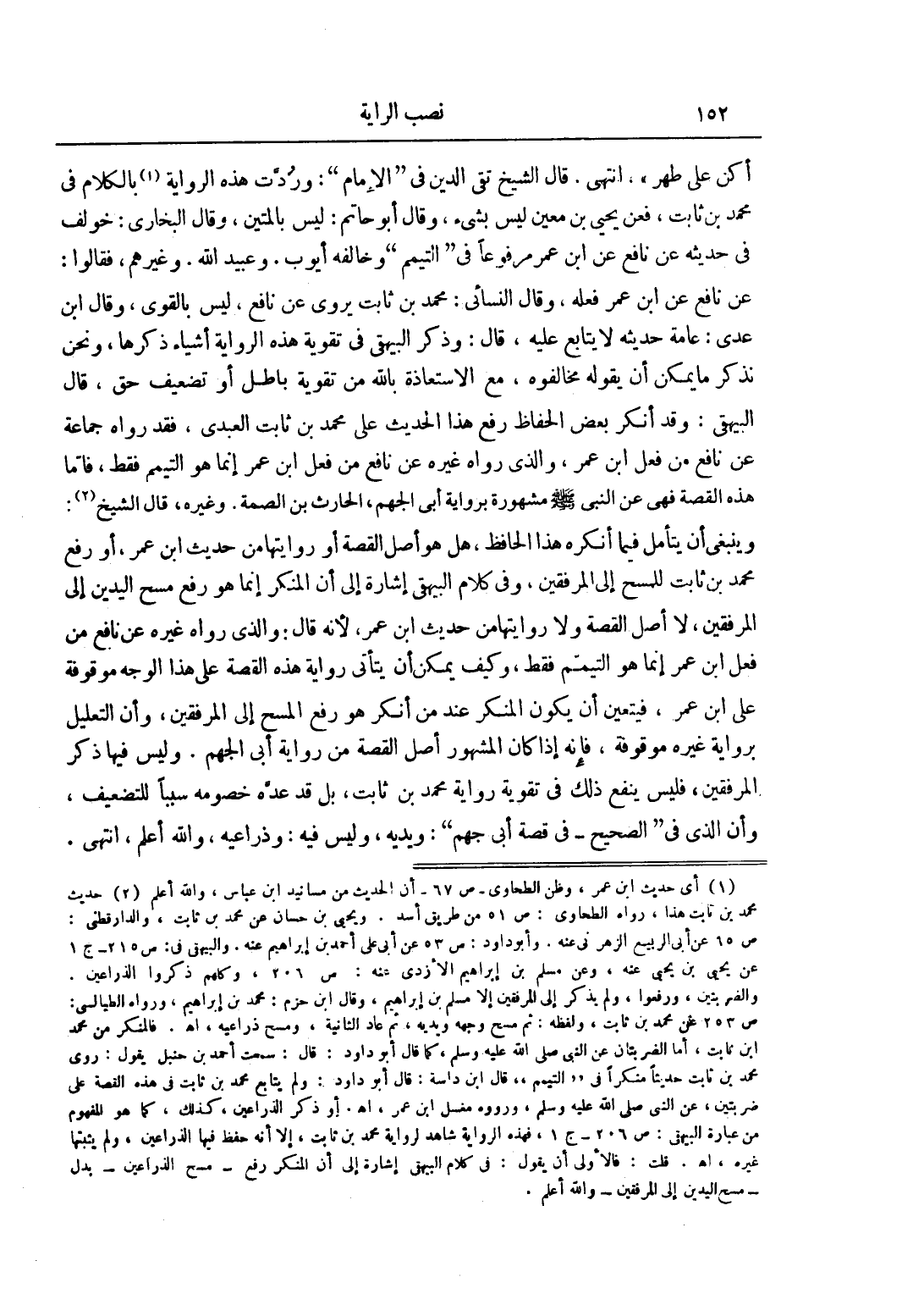 أَكُنْ عَلَى طُهْرٍ"، انْتَهَى. قَالَ الشَّيْخُ تَقِيُّ الدِّينِ فِي الإمام: ورُدَّت هذه الراوية1 بِالْكَلَامِ فِي مُحَمَّدِ بْنِ ثَابِتٍ، فَعَنْ يَحْيَى بْنِ مَعِينٍ لَيْسَ بِشَيْءٍ، وَقَالَ أَبُو حَاتِمٍ: لَيْسَ بِالْمَتِينِ، وَقَالَ الْبُخَارِيُّ: خُولِفَ فِي حَدِيثِهِ عَنْ نَافِعٍ عَنْ ابْنِ عُمَرَ مَرْفُوعًا فِي التَّيَمُّمِ وَخَالَفَهُ أَيُّوبُ. وَعُبَيْدُ اللَّهِ. وَغَيْرُهُمْ، فَقَالُوا: عَنْ نَافِعٍ عَنْ ابْنِ عُمَرَ فَعَلَهُ، وَقَالَ النَّسَائِيّ: مُحَمَّدُ بْنُ ثَابِتٍ يَرْوِي عَنْ نَافِعٍ، لَيْسَ بِالْقَوِيِّ، وَقَالَ ابْنُ عَدِيٍّ: عَامَّةُ حَدِيثِهِ لَا يُتَابَعُ عَلَيْهِ، قَالَ: وَذَكَرَ الْبَيْهَقِيُّ فِي تَقْوِيَةِ هَذِهِ الرِّوَايَةِ أَشْيَاءَ ذَكَرَهَا، وَنَحْنُ نَذْكُرُ مَا يُمْكِنُ أَنْ يَقُولَهُ مُخَالِفُوهُ، مَعَ الِاسْتِعَاذَةِ بِاَللَّهِ مِنْ تَقْوِيَةِ الْبَاطِلِ أَوْ تَضْعِيفِ حَقٍّ، قَالَ الْبَيْهَقِيُّ: وَقَدْ أَنْكَرَ بَعْضُ الْحُفَّاظِ رَفْعَ هَذَا الْحَدِيثِ عَلَى مُحَمَّدِ بْنِ ثلبت العبدي، فققد رَوَاهُ جَمَاعَةٌ عَنْ نَافِعٍ مِنْ فِعْلِ ابْنِ عُمَرَ، وَاَلَّذِي رَوَاهُ غَيْرُهُ عَنْ نَافِعٍ مِنْ فِعْلِ ابْنِ عُمَرَ إنَّمَا هُوَ التَّيَمُّمُ فَقَطْ، فَأَمَّا هَذِهِ الْقِصَّةُ فَهِيَ عَنْ النَّبِيِّ صَلَّى اللَّهُ عَلَيْهِ وَسَلَّمَ مَشْهُورَةٌ بِرِوَايَةِ أَبِي الْجَهْمِ، الْحَرْبِ بْنِ الصِّمَّةِ، وَغَيْرِهِ، قَالَ الشَّيْخُ2: وَيَنْبَغِي أَنْ يُتَأَمَّلَ فِيمَا أَنْكَرَهُ هَذَا الْحَافِظُ، هَلْ هُوَ أَصْلُ الْقِصَّةِ أَوْ رِوَايَتُهَا مِنْ حَدِيثِ ابْنِ عُمَرَ، أَوْ رَفْعُ مُحَمَّدِ بْنِ ثَابِتٍ لِلْمَسْحِ إلَى الْمِرْفَقَيْنِ، وَفِي كَلَامِ الْبَيْهَقِيّ إشَارَةٌ إلَى أَنَّ الْمُنْكَرَ إنَّمَا هُوَ رَفْعُ مَسْحِ الْيَدَيْنِ إلَى الْمِرْفَقَيْنِ، لَا أَصْلَ الْقِصَّةِ وَلَا رِوَايَتَهَا مِنْ حَدِيثِ ابْنِ عُمَرَ، لِأَنَّهُ قَالَ: وَاَلَّذِي رَوَاهُ غَيْرُهُ عَنْ نَافِعٍ مِنْ فِعْلِ ابْنِ عُمَرَ إنَّمَا هُوَ التَّيَمُّمُ فَقَطْ، وَكَيْفَ يُمْكِنُ أَنْ يَتَأَتَّى رِوَايَةُ هَذِهِ الْقِصَّةِ عَلَى هَذَا الْوَجْهِ مَوْقُوفَةً عَلَى ابْنِ عُمَرَ، فَيَتَعَيَّنُ أَنْ يَكُونَ الْمُنْكَرُ عِنْدَ مَنْ أَنْكَرَ هُوَ رَفْعَ الْمَسْحِ إلَى الْمِرْفَقَيْنِ، وَأَنَّ التَّعْلِيلَ بِرِوَايَةِ غَيْرِهِ مَوْقُوفَةً، فَإِنَّهُ إذَا كَانَ الْمَشْهُورُ أَصْلَ الْقِصَّةِ مِنْ رِوَايَةِ أَبِي الْجَهْمِ. وَلَيْسَ فِيهَا ذِكْرُ الْمِرْفَقَيْنِ، فَلَيْسَ يَنْفَعُ ذَلِكَ فِي تَقْوِيَةِ رِوَايَةِ مُحَمَّدِ بْنِ ثَابِتٍ، بَلْ قَدْ عَدَّهُ خُصُومُهُ سَبَبًا لِلتَّضْعِيفِ، وَأَنَّ الَّذِي فِي الصَّحِيحِ - فِي قِصَّةِ أَبِي جَهْمٍ: وَيَدَيْهِ، وَلَيْسَ فِيهِ: وَذِرَاعَيْهِ، وَاَللَّهُ أَعْلَمُ، انْتَهَى.