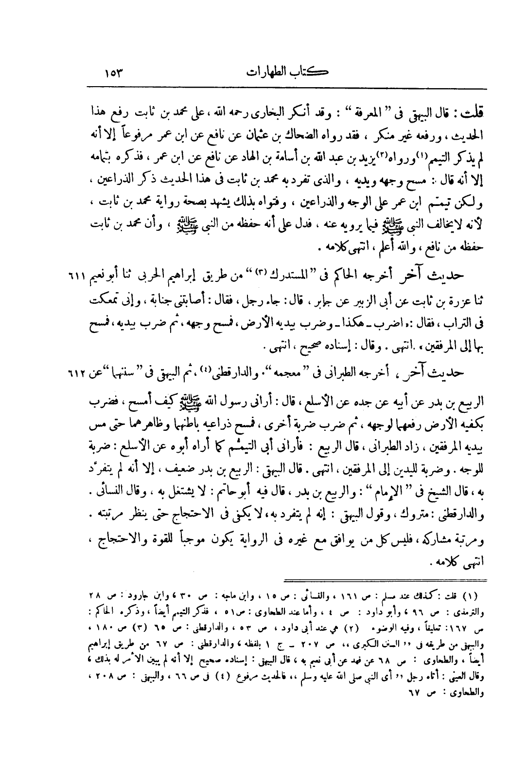 قُلْتُ: قَالَ الْبَيْهَقِيُّ فِي الْمَعْرِفَةِ: وَقَدْ أَنْكَرَ الْبُخَارِيُّ رحمه الله، على الْحَدِيثِ، وَرَفْعُهُ غَيْرُ مُنْكَرٍ، فَقَدْ رَوَاهُ الضَّحَّاكُ بْنُ عثمان محمد بن ثابت رفع هذا عَنْ نَافِعٍ عَنْ ابْنِ عُمَرَ مَرْفُوعًا إلَّا أَنَّهُ لَمْ يَذْكُرْ التَّيَمُّمَ1 وَرَوَاهُ2 يَزِيدُ بْنُ عَبْدِ اللَّهِ بْنِ أُسَامَةَ بْنِ الْهَادِ عَنْ نَافِعٍ عَنْ ابْنِ عُمَرَ، فَذَكَرَهُ بِتَمَامِهِ إلَّا أَنَّهُ قَالَ: مَسَحَ وَجْهَهُ وَيَدَيْهِ، وَاَلَّذِي تَفَرَّدَ بِهِ مُحَمَّدُ بْنُ ثَابِتٍ فِي هَذَا الْحَدِيثِ ذِكْرُ الذِّرَاعَيْنِ، وَلَكِنَّ تَيَمُّمَ ابْنِ عُمَرَ عَلَى الْوَجْهِ وَالذِّرَاعَيْنِ، وَفَتْوَاهُ بِذَلِكَ يَشْهَدُ بِصِحَّةِ رِوَايَةِ مُحَمَّدِ بْنِ ثَابِتٍ، لِأَنَّهُ لَا يُخَالِفُ النَّبِيَّ صَلَّى اللَّهُ عَلَيْهِ وَسَلَّمَ فِيمَا يَرْوِيه عَنْهُ، فَدَلَّ عَلَى أن حَفِظَهُ مِنْ النَّبِيِّ صَلَّى اللَّهُ عَلَيْهِ وَسَلَّمَ، وَأَنَّ مُحَمَّدَ بْنَ ثَابِتٍ حَفِظَهُ مِنْ نَافِعٍ، وَاَللَّهُ أَعْلَمُ، انْتَهَى كَلَامُهُ.