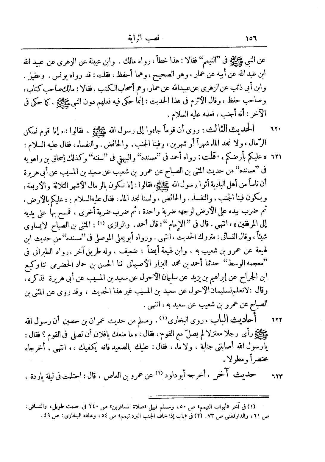 الْحَدِيثُ الثَّالِثُ: رُوِيَ أَنَّ قوماً جاؤوا إلَى رَسُولِ اللَّهِ صَلَّى اللَّهُ عَلَيْهِ وَسَلَّمَ، فَقَالُوا: إنا كنا قَوْمٌ نَسْكُنُ الرِّمَالَ، وَلَا نَجِدُ الْمَاءَ شَهْرًا أَوْ شَهْرَيْنِ، وَفِينَا الْجُنُبُ. وَالْحَائِضُ. وَالنُّفَسَاءُ، فَقَالَ عليه السلام: "عَلَيْكُمْ بِأَرْضِكُمْ"، قُلْتُ: رَوَاهُ أَحْمَدُ فِي مُسْنَدِهِ وَالْبَيْهَقِيُّ فِي سُنَنِهِ وَكَذَلِكَ إسْحَاقُ بْنُ رَاهْوَيْهِ فِي مُسْنَدِهِ مِنْ حَدِيثِ الْمُثَنَّى بْنِ الصَّبَّاحِ عَنْ عَمْرِو بْنِ شُعَيْبٍ عَنْ سَعِيدِ بْنِ الْمُسَيِّبِ عَنْ أَبِي هُرَيْرَةَ أَنَّ نَاسًا مِنْ أَهْلِ الْبَادِيَةِ أَتَوْا رَسُولَ اللَّهِ صَلَّى اللَّهُ عَلَيْهِ وَسَلَّمَ فَقَالُوا: إنَّا نَكُونُ بِالرِّمَالِ الْأَشْهُرَ الثَّلَاثَةَ وَالْأَرْبَعَةَ، وَيَكُونُ فِينَا الْجُنُبُ. وَالنُّفَسَاءُ. وَالْحَائِضُ، وَلَسْنَا نَجِدُ الْمَاءَ، فَقَالَ عليه السلام: "عَلَيْكُمْ بِالْأَرْضِ"، ثُمَّ ضَرَبَ بِيَدِهِ عَلَى الْأَرْضِ لِوَجْهِهِ ضَرْبَةً وَاحِدَةً ثُمَّ ضَرَبَ ضَرْبَةً أُخْرَى، فَمَسَحَ بِهَا عَلَى يَدَيْهِ إلَى الْمِرْفَقَيْنِ، انْتَهَى. قَالَ فِي الْإِمَامِ: قَالَ أَحْمَدُ والرازي1: الْمُثَنَّى بْنُ الصَّبَّاحِ لَا يُسَاوِي شَيْئًا، وَقَالَ النَّسَائِيّ: مَتْرُوكُ الْحَدِيثِ، انْتَهَى. وَرَوَاهُ أَبُو يَعْلَى الْمَوْصِلِيُّ فِي مُسْنَدِهِ مِنْ حَدِيثِ ابْنِ لَهِيعَةَ عَنْ عَمْرِو بْنِ شُعَيْبٍ بِهِ، وَابْنُ لَهِيعَةَ أَيْضًا: ضَعِيفٌ، وَلَهُ طَرِيقٌ آخَرُ، رَوَاهُ الطَّبَرَانِيُّ فِي مُعْجَمِهِ الْوَسَطِ حَدَّثَنَا أَحْمَدُ بْنُ مُحَمَّدٍ الْبَزَّارُ الْأَصْبَهَانِيُّ ثَنَا الْحَسَنُ بْنُ حَمَّادٍ الْحَضْرَمِيُّ ثَنَا وَكِيعُ بْنُ الْجَرَّاحِ عَنْ إبْرَاهِيمَ بْنِ يَزِيدَ عَنْ سُلَيْمَانَ الْأَحْوَلِ عَنْ سَعِيدِ بْنِ الْمُسَيِّبِ عَنْ أَبِي هُرَيْرَةَ فَذَكَرَهُ، وَقَالَ: لَا يُعْلَمُ لِسُلَيْمَانَ الْأَحْوَلِ عَنْ سَعِيدِ بْنِ الْمُسَيِّبِ غَيْرُ هَذَا الْحَدِيثِ، وَقَدْ رُوِيَ عَنْ الْمُثَنَّى بْنِ الصَّبَّاحِ عَنْ عَمْرِو بْنِ شُعَيْبٍ عَنْ سَعِيدٍ بِهِ، انْتَهَى.