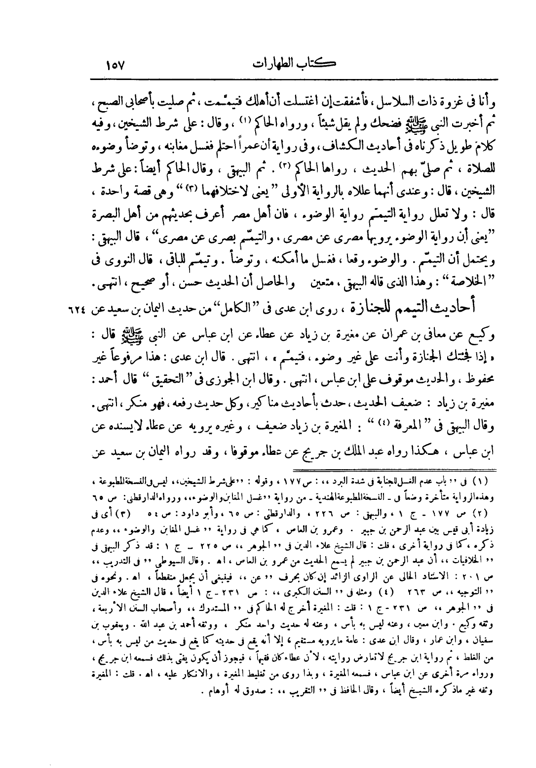 وَأَنَا فِي غَزْوَةِ ذَاتِ السَّلَاسِلِ، فَأَشْفَقْتُ إنْ اغْتَسَلْتُ أَنْ أَهْلِكَ فَتَيَمَّمْتُ، ثُمَّ صَلَّيْتُ بِأَصْحَابِي الصُّبْحَ، ثُمَّ أَخْبَرْتُ النَّبِيَّ صَلَّى اللَّهُ عَلَيْهِ وَسَلَّمَ فَضَحِكَ وَلَمْ يَقُلْ شَيْئًا، وَرَوَاهُ الْحَاكِمُ1. وَقَالَ: عَلَى شَرْطِ الشَّيْخَيْنِ، وَفِيهِ كَلَامٌ طَوِيلٌ ذَكَرْنَاهُ فِي أَحَادِيثِ الْكَشَّافِ، وَفِي رِوَايَةٍ أَنَّ عمر احْتَلَمَ فَغَسَلَ مَغَابِنَهُ وَتَوَضَّأَ وُضُوءَهُ لِلصَّلَاةِ، ثُمَّ صَلَّى بهذا الحديث، رواه الْحَاكِمُ2 ثُمَّ الْبَيْهَقِيُّ، وَقَالَ الْحَاكِمُ أَيْضًا: عَلَى شَرْطِ الشَّيْخَيْنِ، قَالَ: وَعِنْدِي أَنَّهُمَا عَلَّلَاهُ بِالرِّوَايَةِ الْأُولَى يَعْنِي لِاخْتِلَافِهِمَا3 وَهِيَ قِصَّةٌ وَاحِدَةٌ، قَالَ: وَلَا تُعَلِّلُ رِوَايَةُ التَّيَمُّمِ رِوَايَةَ الْوُضُوءِ، فَإِنَّ أَهْلَ مِصْرَ أَعْرَفُ بِحَدِيثِهِمْ مِنْ أَهْلِ الْبَصْرَةِ يَعْنِي أَنَّ رِوَايَةَ الْوُضُوءِ يَرْوِيهَا مِصْرِيٌّ عَنْ مِصْرِيٍّ، وَالتَّيَمُّمِ بَصْرِيٌّ عَنْ مِصْرِيٍّ، قَالَ الْبَيْهَقِيُّ: وَيُحْتَمَلُ أَنَّ التَّيَمُّمَ. وَالْوُضُوءَ وَقَعَا، فَغَسَلَ مَا أَمْكَنَهُ، وَتَوَضَّأَ. وَتَيَمَّمَ لِلْبَاقِي، قال النَّوَوِيُّ فِي "الْخُلَاصَةِ": وَهَذَا الَّذِي قَالَهُ الْبَيْهَقِيُّ، مُتَعَيِّنٌ. وَالْحَاصِلُ أَنَّ الْحَدِيثَ حَسَنٌ أَوْ صَحِيحٌ، انْتَهَى.