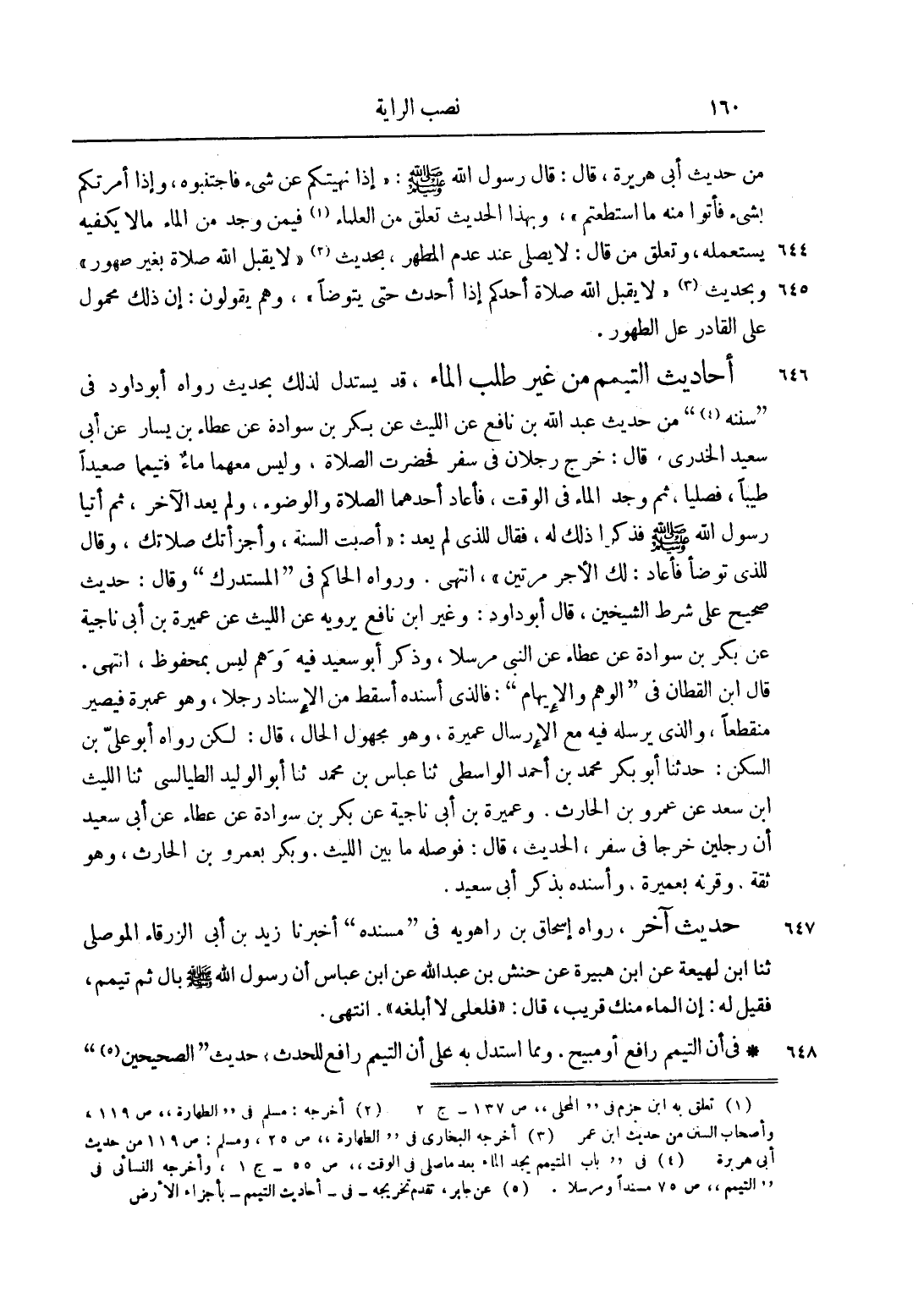 أَحَادِيثُ التَّيَمُّمِ مِنْ غَيْرِ طَلَبِ الْمَاءِ قَدْ يُسْتَدَلُّ لِذَلِكَ بِحَدِيثٍ رَوَاهُ أَبُو دَاوُد فِي سُنَنِهِ4 مِنْ حَدِيثِ عَبْدِ اللَّهِ بْنِ نَافِعٍ عَنْ اللَّيْثِ عَنْ بَكْرِ بْنِ سَوَادَةَ عَنْ عَطَاءِ بْنِ يَسَارٍ عَنْ أَبِي سَعِيدٍ الْخُدْرِيِّ، قَالَ: خَرَجَ رَجُلَانِ فِي سَفَرٍ فَحَضَرَتْ الصَّلَاةُ، وليس معهما ماءاً فَتَيَمَّمَا صَعِيدًا طَيِّبًا فَصَلَّيَا، ثم وجد الْمَاءَ فِي الْوَقْتِ، فَأَعَادَ أَحَدُهُمَا الصَّلَاةَ وَالْوُضُوءَ، وَلَمْ يُعِدْ الْآخَرُ، ثُمَّ أَتَيَا رَسُولَ اللَّهِ صَلَّى اللَّهُ عَلَيْهِ وَسَلَّمَ فَذَكَرَا ذَلِكَ لَهُ، فَقَالَ لِلَّذِي لَمْ يُعِدْ: "أَصَبْتَ السُّنَّةَ، وَأَجْزَأَتْكَ صَلَاتُكَ"، وَقَالَ لِلَّذِي تَوَضَّأَ فَأَعَادَ: "لَك الْأَجْرُ مَرَّتَيْنِ"، انْتَهَى. وَرَوَاهُ الْحَاكِمُ فِي الْمُسْتَدْرَكِ وَقَالَ: حَدِيثٌ صَحِيحٌ عَلَى شَرْطِ الشَّيْخَيْنِ، قَالَ أَبُو دَاوُد: وَغَيْرُ ابْنِ نَافِعٍ يَرْوِيهِ عَنْ اللَّيْثِ بن عَمِيرَةَ بْنِ أَبِي نَاجِيَةَ عَنْ بَكْرِ بْنِ سَوَادَةَ عَنْ عَطَاءٍ عَنْ النَّبِيِّ مرسلاً، وذكر أبو سَعِيدٍ فِيهِ وَهْمٌ لَيْسَ بِمَحْفُوظٍ، انْتَهَى. قَالَ ابْنُ الْقَطَّانِ فِي الْوَهْمِ وَالْإِيهَامِ: فَاَلَّذِي أَسْنَدَهُ أَسْقَطَ مِنْ الْإِسْنَادِ رَجُلًا، وَهُوَ عَمِيرَةُ فَيَصِيرُ مُنْقَطِعًا، وَاَلَّذِي يُرْسِلُهُ فِيهِ مَعَ الْإِرْسَالِ عَمِيرَةُ، وَهُوَ مَجْهُولُ الْحَالِ، قَالَ: لَكِنْ رَوَاهُ أَبُو عَلِيِّ بْنُ السَّكَنِ: حَدَّثَنَا أَبُو بَكْرٍ مُحَمَّدُ بْنُ أَحْمَدَ الْوَاسِطِيُّ ثَنَا عَبَّاسُ بْنُ مُحَمَّدٍ ثَنَا أَبُو الْوَلِيدِ الطَّيَالِسِيُّ ثَنَا اللَّيْثُ بْنُ سَعْدٍ عَنْ عَمْرِو بْنِ الْحَارِثِ. وَعَمِيرَةِ بْنِ أَبِي نَاجِيَةَ عَنْ بَكْرِ بْنِ سَوَادَةَ عَنْ عَطَاءٍ عَنْ أَبِي سَعِيدٍ أَنَّ رَجُلَيْنِ خَرَجَا فِي سَفَرٍ، الْحَدِيثُ قَالَ: فَوَصَلَهُ مَا بَيْنَ اللَّيْثِ. وَبَكْرٍ بِعَمْرِو بْنِ الْحَارِثِ، وَهُوَ ثِقَةٌ، وَقَرَنَهُ بِعَمِيرَةَ، وَأَسْنَدَهُ بِذِكْرِ أَبِي سَعِيدٍ.