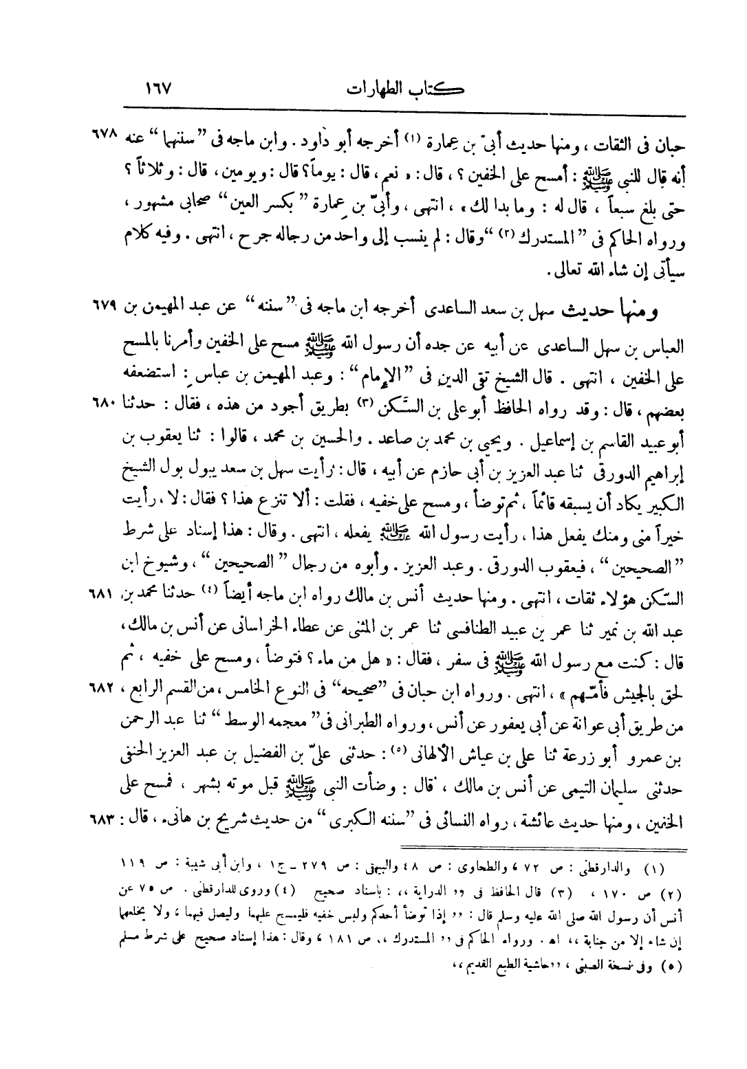 وَمِنْهَا حَدِيثُ سَهْلِ بْنِ سَعْدٍ السَّاعِدِيِّ أَخْرَجَهُ ابْنُ مَاجَهْ فِي سُنَنِهِ عَنْ عَبْدِ الْمُهَيْمِنِ بْنِ الْعَبَّاسِ بْنِ سَهْلٍ السَّاعِدِيِّ عَنْ أَبِيهِ عَنْ جَدِّهِ أَنَّ رَسُولَ اللَّهِ صَلَّى اللَّهُ عَلَيْهِ وَسَلَّمَ مَسَحَ عَلَى الْخُفَّيْنِ وَأَمَرَنَا بِالْمَسْحِ عَلَى الْخُفَّيْنِ، انْتَهَى. قَالَ الشَّيْخُ تَقِيُّ الدِّينِ فِي الْإِمَامِ: وَعَبْدُ الْمُهَيْمِنِ بْنِ عَبَّاسٍ: اسْتَضْعَفَهُ بَعْضُهُمْ، قَالَ: وَقَدْ رَوَاهُ الْحَافِظُ أَبُو عَلِيِّ بْنِ السَّكَنِ3 بِطَرِيقٍ أَجْوَدَ مِنْ هَذِهِ، فَقَالَ: حَدَّثَنَا أَبُو عُبَيْدٍ الْقَاسِمُ بْنُ إسْمَاعِيلَ. وَيَحْيَى بْنُ مُحَمَّدِ بْنِ صَاعِدٍ. وَالْحُسَيْنُ بْنُ مُحَمَّدٍ، قَالُوا: ثنا يَعْقُوبُ بْنُ إبْرَاهِيمَ الدَّوْرَقِيُّ ثنا عَبْدُ الْعَزِيزِ بْنُ أَبِي حَازِمٍ عَنْ أَبِيهِ، قَالَ: رَأَيْت سَهْلَ بْنَ سَعْدٍ يَبُولُ بَوْلَ الشَّيْخِ الْكَبِيرِ يَكَاد أَنْ يَسْبِقَهُ قَائِمًا، ثُمَّ تَوَضَّأَ، وَمَسَحَ عَلَى خُفَّيْهِ، فَقُلْت: أَلَا تَنْزِعُ هَذَا؟ فَقَالَ: لَا، رَأَيْت خَيْرًا مِنِّي وَمِنْك يَفْعَلُ هذا، رأيت رسول الله صَلَّى اللَّهُ عَلَيْهِ وَسَلَّمَ يفعله، وَقَالَ: هَذَا إسْنَادٌ عَلَى شَرْطِ الصَّحِيحَيْنِ، فَيَعْقُوبُ الدَّوْرَقِيُّ. وَعَبْدُ الْعَزِيزِ. وَأَبُوهُ مِنْ رِجَالِ الصَّحِيحَيْنِ، وَشُيُوخُ ابْنِ السَّكَنِ هَؤُلَاءِ ثِقَاتٌ، انْتَهَى. وَمِنْهَا حَدِيثُ أَنَسِ بْنِ مَالِكٍ رَوَاهُ ابْنُ مَاجَهْ أَيْضًا4 حَدَّثَنَا مُحَمَّدُ بْنُ عَبْدِ اللَّهِ بْنِ نُمَيْرٍ ثنا عُمَرُ بْنُ عُبَيْدٍ الطَّنَافِسِيُّ ثنا عُمَرُ بْنُ الْمُثَنَّى عَنْ عَطَاءٍ الْخُرَاسَانِيِّ عَنْ أَنَسِ بْنِ مَالِكٍ، قَالَ: كُنْت مَعَ رَسُولِ اللَّهِ صَلَّى اللَّهُ عَلَيْهِ وَسَلَّمَ فِي سَفَرٍ، فَقَالَ: "هَلْ مِنْ مَاءٍ؟ " فَتَوَضَّأَ، وَمَسَحَ عَلَى خُفَّيْهِ، ثُمَّ لَحِقَ بِالْجَيْشِ فَأَمَّهُمْ، انْتَهَى. وَرَوَاهُ ابْنُ حِبَّانَ فِي صَحِيحِهِ فِي النَّوْعِ الْخَامِسِ، مِنْ الْقِسْمِ الرَّابِعِ، مِنْ طَرِيقِ أَبِي عَوَانَةَ عَنْ أَبِي يَعْفُورٍ عَنْ أَنَسٍ، وَرَوَاهُ الطَّبَرَانِيُّ فِي مُعْجَمِهِ الْوَسَطِ ثنا عَبْدُ الرَّحْمَنِ ثنا عُمَرُ. وَأَبُو زُرْعَةَ ثنا عَلِيُّ بْنُ عَيَّاشٍ الْأَلْهَانِيُّ5: حَدَّثَنِي عَلِيُّ بْنُ الْفُضَيْلِ بْنِ عَبْدِ الْعَزِيزِ الحنفي حدثني سليمان التميمي عَنْ أَنَسِ بْنِ مَالِكٍ، قَالَ: وَضَّأْت النَّبِيَّ صَلَّى اللَّهُ عَلَيْهِ وَسَلَّمَ قَبْلَ مَوْتِهِ بِشَهْرٍ، فَمَسَحَ عَلَى الْخُفَّيْنِ، وَمِنْهَا حَدِيثُ عَائِشَةَ، رَوَاهُ النَّسَائِيُّ فِي سُنَنِهِ الْكُبْرَى مِنْ حَدِيثِ شُرَيْحِ بْنِ هَانِئٍ، قَالَ: