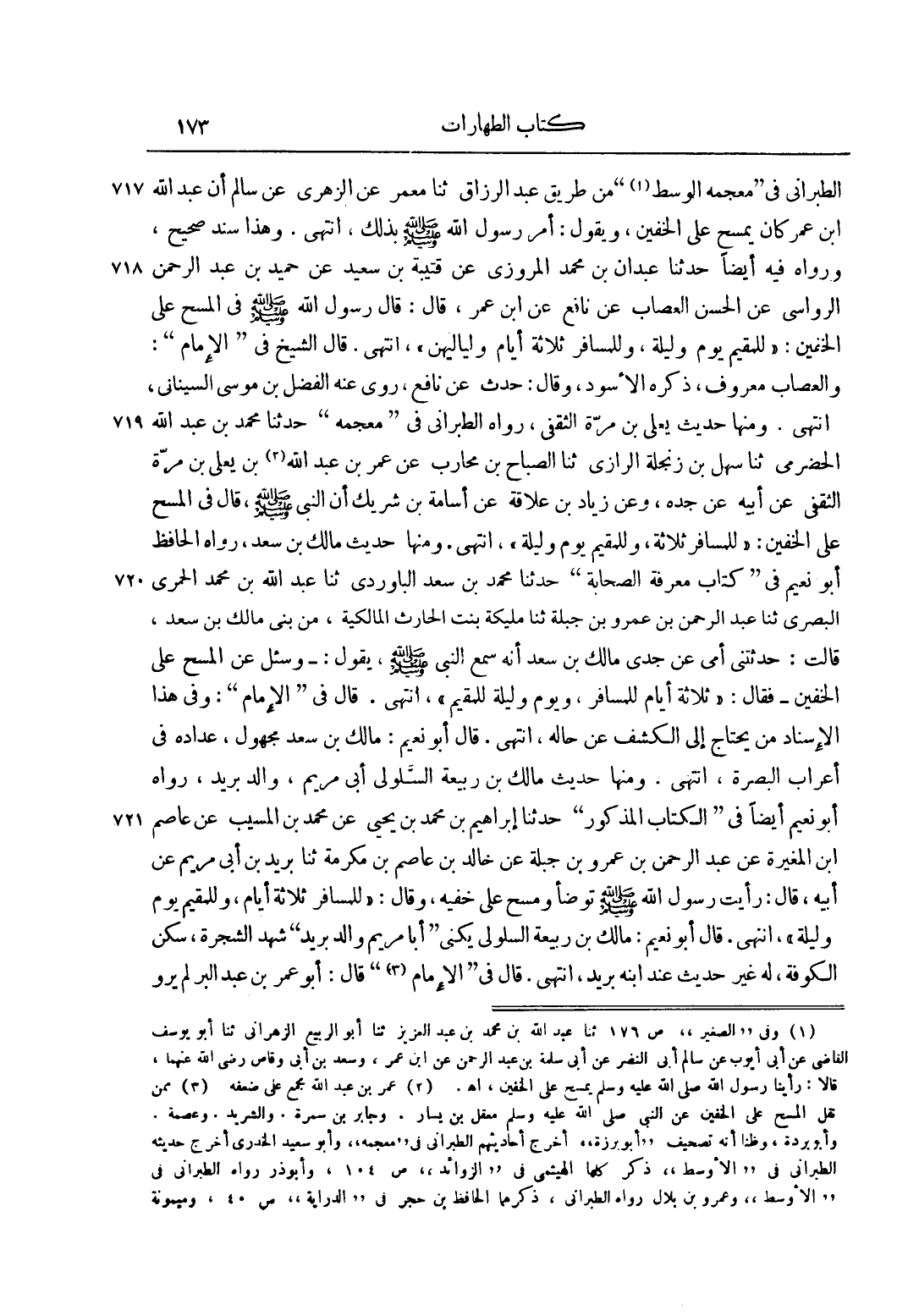 الطَّبَرَانِيُّ فِي مُعْجَمِهِ الْوَسَطِ1 مِنْ طَرِيقِ عَبْدِ الرَّزَّاقِ ثَنَا مَعْمَرٌ عَنْ الزُّهْرِيِّ عَنْ سَالِمٍ أَنَّ عَبْدَ اللَّهِ بْنَ عُمَرَ كَانَ يَمْسَحُ عَلَى الْخُفَّيْنِ، وَيَقُولُ: أَمَرَ رَسُولُ اللَّهِ صَلَّى اللَّهُ عَلَيْهِ وَسَلَّمَ بِذَلِكَ، انْتَهَى. وَهَذَا سَنَدٌ صَحِيحٌ، وَرَوَاهُ فِيهِ أَيْضًا حَدَّثَنَا عَبْدَانُ بْنُ مُحَمَّدٍ الْمَرْوَزِيِّ عَنْ قُتَيْبَةَ بْنِ سَعِيدٍ عَنْ حُمَيْدٍ بْنِ عبد الرحمن الرواسي عَنْ الْحَسَنِ الْعَصَّابِ عَنْ نَافِعٍ عَنْ ابْنِ عُمَرَ، قَالَ: قَالَ رَسُولُ اللَّهِ صَلَّى اللَّهُ عَلَيْهِ وَسَلَّمَ فِي الْمَسْحِ عَلَى الْخُفَّيْنِ: "لِلْمُقِيمِ يَوْمٌ وَلَيْلَةٌ، وَلِلْمُسَافِرِ ثَلَاثَةُ أَيَّامٍ وَلَيَالِيهِنَّ"، انْتَهَى. قَالَ الشَّيْخُ: فِي الْإِمَامِ: وَالْعَصَّابُ مَعْرُوفٌ، ذَكَرَهُ الْأَسْوَدُ، وَقَالَ: حَدَّثَ عَنْ نَافِعٍ، رَوَى عَنْهُ الْفَضْلُ بْنُ مُوسَى الشَّيْبَانِيُّ، انْتَهَى. وَمِنْهَا حَدِيثُ يَعْلَى بْنُ مُرَّةَ الثَّقَفِيُّ، رَوَاهُ الطَّبَرَانِيُّ فِي مُعْجَمِهِ حَدَّثَنَا مُحَمَّدُ بْنُ عَبْدِ اللَّهِ الْحَضْرَمِيُّ ثَنَا سَهْلُ بْنُ زَنْجَلَةَ الرَّازِيُّ ثَنَا الصَّبَّاحُ بْنُ مُحَارِبٍ عَنْ عُمَرَ بْنِ عَبْدِ اللَّهِ2 بْنِ يَعْلَى بْنِ مُرَّةَ الثَّقَفِيِّ عَنْ أَبِيهِ عَنْ جَدِّهِ، وَعَنْ زِيَادِ بْنِ عِلَاقَةَ عَنْ أُسَامَةَ بْنِ شَرِيكٍ أَنَّ النَّبِيَّ صَلَّى اللَّهُ عَلَيْهِ وَسَلَّمَ، قَالَ فِي الْمَسْحِ عَلَى الخفين: "للمسافر ثلاثة أيام، وللمقيم يوم وليلة"، وَمِنْهَا حَدِيثُ مَالِكِ بْنِ سَعْدٍ، رَوَاهُ الْحَافِظُ أَبُو نُعَيْمٍ فِي كِتَابِ مَعْرِفَةِ الصَّحَابَةِ حَدَّثَنَا مُحَمَّدُ بْنُ سعد الباردوي ثَنَا عَبْدُ اللَّهِ بْنُ مُحَمَّدٍ الْحُمْرِيُّ الْبَصْرِيُّ ثَنَا أَبُو عَبْدِ الرَّحْمَنِ بْنِ عَمْرِو بْنِ جَبَلَةَ ثَنَا مُلَيْكَةُ بِنْتُ الْحَارِثِ الْمَالِكِيَّةُ، مِنْ بَنِي مَالِكِ بْنِ سَعْدٍ، قَالَتْ: حَدَّثَتْنِي أُمِّي عَنْ جَدِّي مَالِكِ بْنِ سَعْدٍ أَنَّهُ سَمِعَ النَّبِيَّ صَلَّى اللَّهُ عَلَيْهِ وَسَلَّمَ، يَقُول: - وَسُئِلَ عَنْ الْمَسْحِ عَلَى الْخُفَّيْنِ - فَقَالَ: "ثَلَاثَةُ أَيَّامٍ لِلْمُسَافِرِ، وَيَوْمٌ وَلَيْلَةٌ لِلْمُقِيمِ"، انْتَهَى. قَالَ فِي الْإِمَامِ: وَفِي هَذَا الْإِسْنَادِ مَنْ يُحْتَاجُ إلَى الْكَشْفِ عَنْ حَالِهِ، انْتَهَى. قَالَ أَبُو نُعَيْمٍ: مَالِكُ بْنُ سَعْدٍ مَجْهُولٌ، عِدَادُهُ فِي أَعْرَابِ الْبَصْرَةِ، انْتَهَى. وَمِنْهَا حَدِيثُ مَالِكِ بْنِ رَبِيعَةَ السَّلُولِيِّ أَبِي مَرْيَمَ، وَالِدِ بُرَيْدٍ، رَوَاهُ أَبُو نُعَيْمٍ أَيْضًا فِي الْكِتَابِ الْمَذْكُورِ حَدَّثَنَا إبْرَاهِيمُ بْنُ مُحَمَّدِ بْنِ يَحْيَى عَنْ مُحَمَّدِ بْنِ الْمُسَيِّبِ عَنْ عَاصِمِ بْنِ الْمُغِيرَةِ عَنْ عَبْدِ الرَّحْمَنِ بْنِ عَمْرِو بْنِ جَبَلَةَ عَنْ خَالِدِ بْنِ عَاصِمِ بْنِ مُكْرَمَةَ ثَنَا بُرَيْدُ بْنُ أَبِي مَرْيَمَ عَنْ أَبِيهِ، قَالَ: رَأَيْت رَسُولَ اللَّهِ صَلَّى اللَّهُ عَلَيْهِ وَسَلَّمَ تَوَضَّأَ وَمَسَحَ عَلَى خُفَّيْهِ، وَقَالَ: "لِلْمُسَافِرِ ثَلَاثَةُ أَيَّامٍ، وَلِلْمُقِيمِ يَوْمٌ وَلَيْلَةٌ"، انْتَهَى. قَالَ أَبُو نُعَيْمٍ: مَالِكُ بْنُ رَبِيعَةَ السَّلُولِيُّ يُكْنَى أَبَا مَرْيَمَ وَالِدَ بُرَيْدٍ شَهِدَ الشَّجَرَةَ، سَكَنَ الْكُوفَةَ، لَهُ غَيْرُ حَدِيثٍ عِنْدَ ابْنِهِ بُرَيْدٍ، انْتَهَى. قَالَ فِي الْإِمَامِ3 قَالَ أَبُو عُمَرَ بْنُ عَبْدِ الْبَرِّ لَمْ يُرْوَ