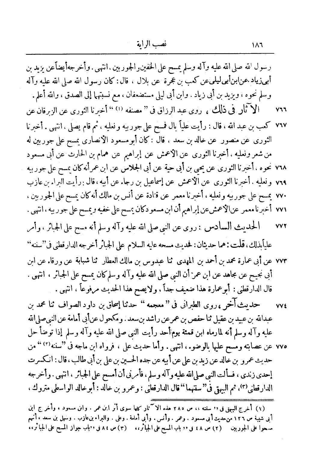 1 أخرج البيهقي في سننه ص 285 هذه الآثار كلها سوى أثر ابن عمر. وابن مسعود، وأخرج ابن أبي شيبة ص 126 من حديث أبي مسعود. وعمر. وأنس. وأبي أمامة. وعلي. والبراء بن عازب. وسهل بن سعد، أنهم مسحوا على الجوربين.