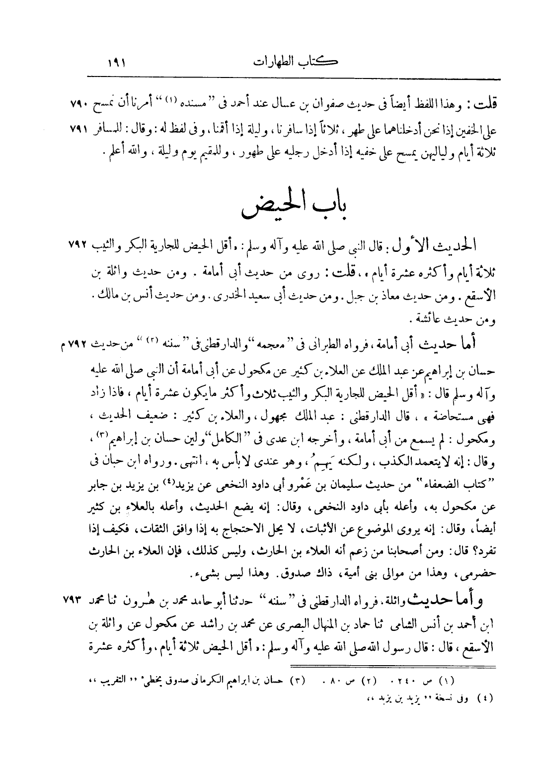 الْحَدِيثُ الْأَوَّلُ: قَالَ النَّبِيُّ صلى الله عليه وآله وسلم: "أَقَلُّ الْحَيْضِ لِلْجَارِيَةِ الْبِكْرِ وَالثَّيِّبِ ثَلَاثَةُ أَيَّامٍ وَأَكْثَرُهُ عَشَرَةُ أَيَّامٍ"، قُلْت: رُوِيَ مِنْ حَدِيثِ أَبِي أُمَامَةَ. وَمِنْ حَدِيثِ وَاثِلَةَ بْنِ الْأَسْقَعِ. وَمِنْ حَدِيثِ مُعَاذِ بْنِ جَبَلٍ. وَمِنْ حَدِيثِ أَبِي سَعِيدٍ الْخُدْرِيِّ. وَمِنْ حَدِيثِ أَنَسِ بْنِ مَالِكٍ. وَمِنْ حَدِيثِ عَائِشَةَ.