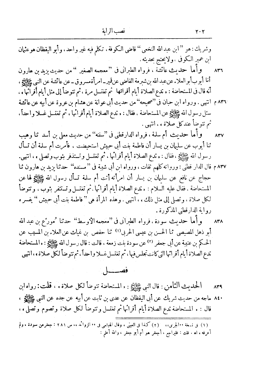 وَأَمَّا حَدِيثُ أُمِّ سَلَمَةَ، فَرَوَاهُ الدَّارَقُطْنِيُّ فِي سُنَنِهِ مِنْ حَدِيثِ مُعَلَّى بْنِ أَسَدٍ ثَنَا وُهَيْبٍ ثَنَا أَيُّوبُ عَنْ سُلَيْمَانَ بْنِ يَسَارٍ أَنَّ فَاطِمَةَ بِنْتَ أَبِي حُبَيْشٍ اُسْتُحِيضَتْ، فَأَمَرَتْ أُمَّ سَلَمَةَ أَنْ تَسْأَلَ رَسُولَ اللَّهِ صَلَّى اللَّهُ عَلَيْهِ وَسَلَّمَ، فَقَالَ: "تَدَعُ الصَّلَاةَ أَيَّامَ أَقْرَائِهَا، ثُمَّ تَغْتَسِلُ وَتَسْتَذْفِرُ بِثَوْبٍ وَتُصَلِّي"، انْتَهَى. قَالَ الدَّارَقُطْنِيُّ: رواته كلهم ثقات، رواه ابْنُ أَبِي شَيْبَةَ فِي مُسْنَدِهِ حَدَّثَنَا يَزِيدُ بْنُ هَارُونَ ثَنَا حَجَّاجٌ عَنْ نَافِعٍ عَنْ سُلَيْمَانَ بْنِ يَسَارٍ أَنَّ امْرَأَتَهُ أَتَتْ أُمَّ سَلَمَةَ تَسْأَلُ رَسُولَ اللَّهِ صَلَّى اللَّهُ عَلَيْهِ وَسَلَّمَ لَهَا عَنْ الْمُسْتَحَاضَةِ، فَقَالَ عليه السلام: "تَدَعُ الصَّلَاةَ أَيَّامَ أَقْرَائِهَا، ثُمَّ تغتسل وتستثفر بِثَوْبٍ، وَتَتَوَضَّأُ لِكُلِّ صَلَاةٍ وَتُصَلِّي إلَى مِثْلِ ذَلِكَ"، انْتَهَى. وَهَذِهِ الْمَرْأَةُ هِيَ فَاطِمَةُ بِنْتُ أَبِي حُبَيْشٍ يُفَسِّرُهُ رِوَايَةُ الدَّارَقُطْنِيِّ الْمَذْكُورَةُ.