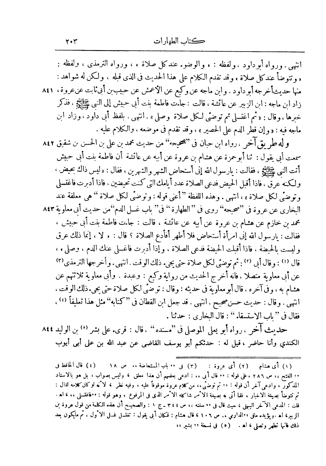 4 قال الحافظ في الفتح ص 286، على قوله: قال أبي: ادعى بعضهم أن هذا معلق، وليس بالصواب، بل هو بالإسناد المذكور، وادعى آخر أن قوله: ثم توضئي من كلام عروة موقوفاً عليه، وفيه نظر، لأنه لو كان كلامه لقال: ثم تتوضأ بصيغة الإخبار، فلما أتى به بصيغة الأمر شاكله الأمر الذي في المرفوع، وهو قوله: فاغتسلي اهـ. قلت: المدعي الآخر البيهقي، حيث قال في سننه ص 344 - ج 1: والصحيح أن هذه الكلمة من قول عروة بن الزبير، اهـ. ويؤيده ما في الدارمي ص 106، قال هشام: فكان أبي يقول: تغتسل الأولى، ثم ما يكون بعد ذلك فإنها تطهر وتصلي، اهـ.
