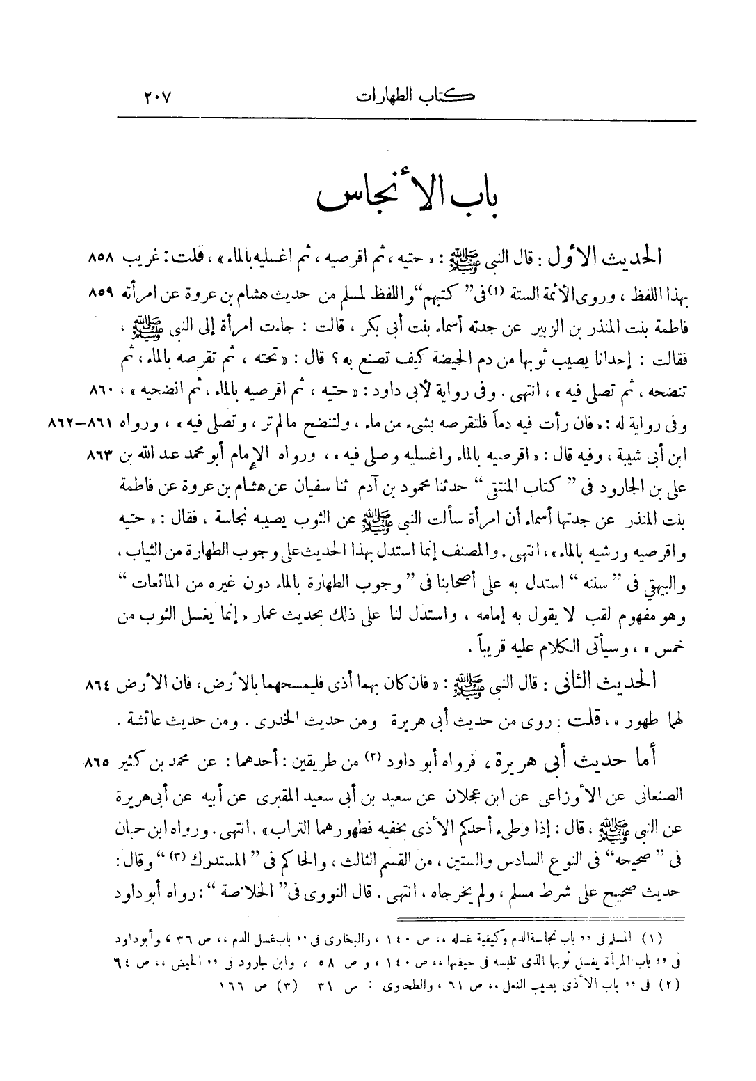 1 المسلم في باب نجاسة الدم وكيفية غسله ص 140، والبخاري في باب غسل الدم ص 36، وأبو داود في باب المرأة يغسل ثوبها الذي تلبسه في حيضها ص 140، وص 58، وابن جارود في الحيض ص 64.