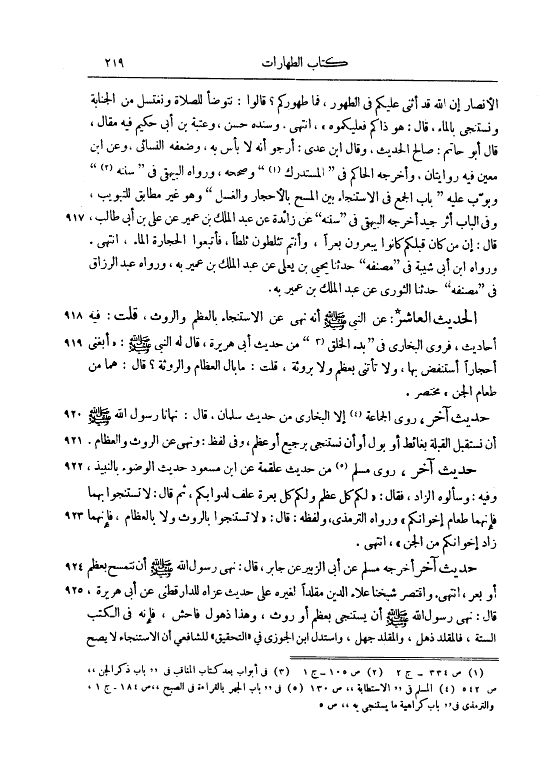 حَدِيثٌ آخَرُ أَخْرَجَهُ مُسْلِمٌ عَنْ أَبِي الزُّبَيْرِ عَنْ جَابِرٍ، قَالَ: نَهَى رَسُولُ اللَّهِ صَلَّى اللَّهُ عَلَيْهِ وَسَلَّمَ أَنَّ نَتَمَسَّحَ بِعَظْمٍ أَوْ بَعْرٍ، انْتَهَى. وَاقْتَصَرَ شَيْخُنَا عَلَاءُ الدِّينِ مُقَلِّدًا لِغَيْرِهِ عَلَى حَدِيثٍ عَزَاهُ الدَّارَقُطْنِيُّ عَنْ أَبِي هُرَيْرَةَ، قَالَ: نَهَى رَسُولُ اللَّهِ صَلَّى اللَّهُ عَلَيْهِ وَسَلَّمَ أَنْ يُسْتَنْجَى بِعَظْمٍ أَوْ رَوْثٍ، وَهَذَا ذُهُولٌ فَاحِشٌ، فَإِنَّهُ فِي الْكُتُبِ السِّتَّةِ، فَالْمُقَلَّدُ ذَهَلَ، وَالْمُقَلِّدُ جَهِلَ، وَاسْتَدَلَّ ابْنُ الْجَوْزِيِّ فِي التَّحْقِيقِ - لِلشَّافِعِيِّ أَنَّ الِاسْتِنْجَاءَ لَا يَصِحُّ