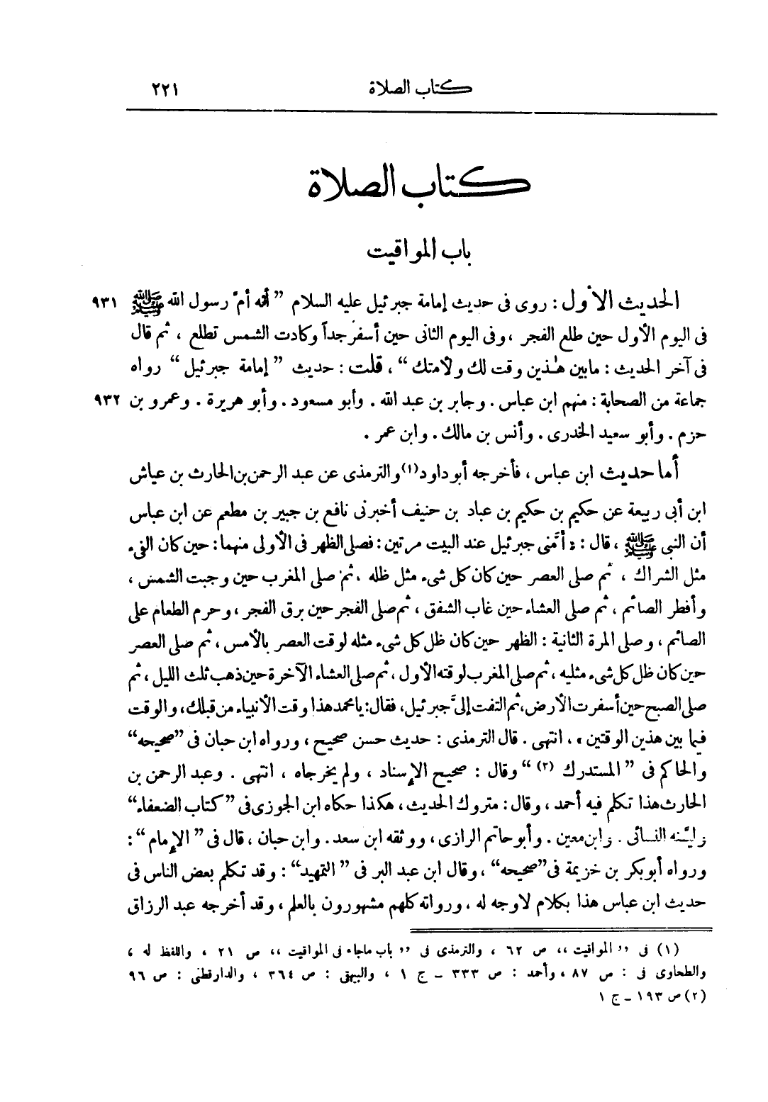 الْحَدِيثُ الْأَوَّلُ: رُوِيَ فِي حَدِيثِ إمَامَةِ جَبْرَائِيلَ عليه السلام أَنَّهُ أَمَّ رَسُولَ اللَّهِ صَلَّى اللَّهُ عَلَيْهِ وَسَلَّمَ فِي الْيَوْمِ الْأَوَّلِ حِينَ طَلَعَ الْفَجْرُ، وَفِي الْيَوْمِ الثَّانِي حِينَ أَسْفَرَ جِدًّا وَكَادَتْ الشَّمْسُ تَطْلُعُ، ثُمَّ قَالَ فِي آخَرِ الْحَدِيثِ: مَا بَيْنَ هَذَيْنِ وَقْتٌ لَك وَلِأُمَّتِكَ، قُلْت: حَدِيثُ إمامة جبريل رَوَاهُ جَمَاعَةٌ مِنْ الصَّحَابَةِ: مِنْهُمْ ابْنُ عَبَّاسٍ. وَجَابِرُ بْنُ عَبْدِ اللَّهِ. وَابْنُ مسعود. وأبي هُرَيْرَةَ. وَعَمْرُو بْنُ حَزْمٍ. وَأَبُو سَعِيدٍ الْخُدْرِيِّ. وَأَنَسُ بْنُ مَالِكٍ. وَابْنُ عُمَرَ.