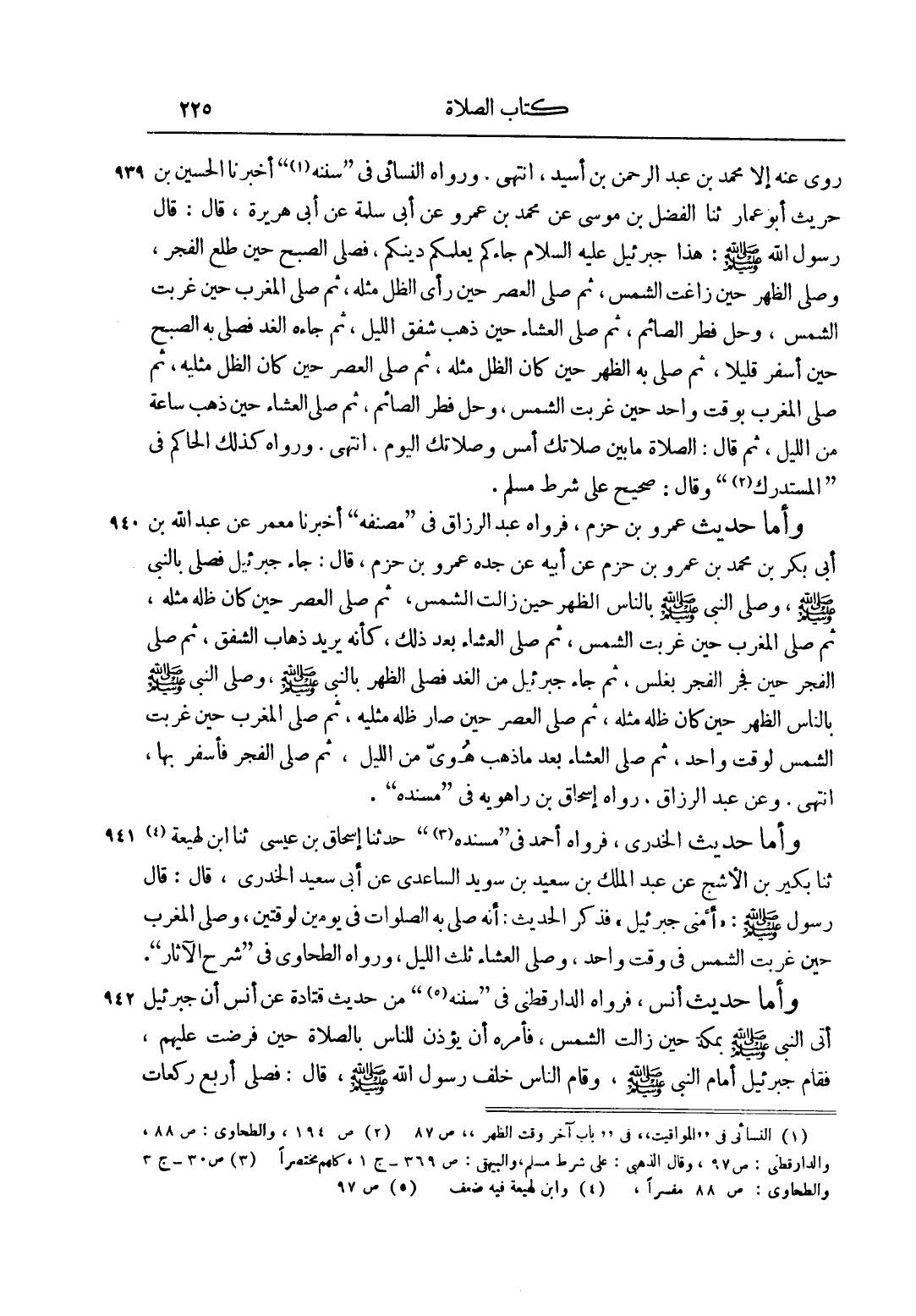 وَأَمَّا حَدِيثُ عَمْرِو بْنِ حَزْمٍ، فَرَوَاهُ عَبْدُ الرَّزَّاقِ فِي مُصَنَّفِهِ أَخْبَرَنَا مَعْمَرٌ عَنْ عَبْدِ اللَّهِ بْنِ أَبِي بَكْرِ بْنِ مُحَمَّدِ بْنِ عَمْرِو بْنِ حَزْمٍ عَنْ أَبِيهِ عَنْ جَدِّهِ عَمْرِو بْنِ حَزْمٍ، قال: جاء جبرئيل فَصَلَّى بِالنَّبِيِّ صَلَّى اللَّهُ عَلَيْهِ وَسَلَّمَ، وَصَلَّى النَّبِيُّ صَلَّى اللَّهُ عَلَيْهِ وَسَلَّمَ بِالنَّاسِ حِينَ زَالَتْ الشَّمْسُ الظُّهْرَ، ثُمَّ صَلَّى الْعَصْرَ حِينَ كَانَ ظِلُّهُ مِثْلَهُ، ثُمَّ صَلَّى الْمَغْرِبَ حِينَ غَرَبَتْ الشَّمْسُ، ثُمَّ صَلَّى الْعِشَاءَ بَعْدَ ذَلِكَ، كَأَنَّهُ يُرِيدُ ذَهَابَ الشَّفَقِ، ثُمَّ صَلَّى الْفَجْرَ حِينَ فَجَرَ الْفَجْرُ بِغَلَسٍ، ثُمَّ جَاءَ جبرئيل مِنْ الْغَدِ فَصَلَّى الظُّهْرَ بِالنَّبِيِّ صَلَّى اللَّهُ عَلَيْهِ وَسَلَّمَ، وَصَلَّى النَّبِيُّ بِالنَّاسِ الظُّهْرَ حِينَ كَانَ ظِلُّهُ مِثْلَهُ، ثُمَّ صَلَّى الْعَصْرَ حِينَ صَارَ ظِلُّهُ مِثْلَيْهِ، ثُمَّ صَلَّى الْمَغْرِبَ حِينَ غَرَبَتْ الشَّمْسُ لِوَقْتٍ وَاحِدٍ، ثم صلى العشاء بعد ما ذَهَبَ هَوِيٌّ مِنْ اللَّيْلِ، ثُمَّ صَلَّى الْفَجْرَ فَأَسْفَرَ بِهَا، انْتَهَى. وَعَنْ عَبْدِ الرَّزَّاقِ، رَوَاهُ إسْحَاقُ بْنُ رَاهْوَيْهِ فِي مُسْنَدِهِ.