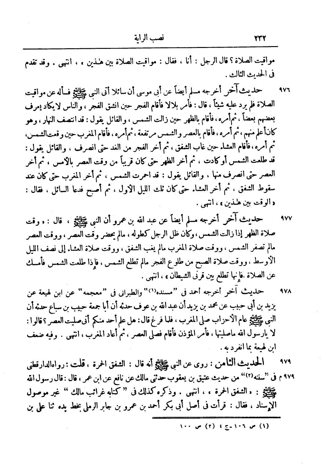 الْحَدِيثُ الثَّامِنُ: رُوِيَ عَنْ النَّبِيِّ صَلَّى اللَّهُ عَلَيْهِ وَسَلَّمَ أَنَّهُ قَالَ: "الشَّفَقُ الْحُمْرَةُ"، قُلْتُ: رَوَاهُ الدَّارَقُطْنِيُّ فِي سُنَنِهِ2 مِنْ حَدِيثِ عَتِيقِ بْنِ يَعْقُوبَ حَدَّثَنِي مَالِكٌ عَنْ نَافِعٍ عَنْ ابْنِ عُمَرَ، قَالَ: قَالَ رَسُولُ اللَّهِ صَلَّى اللَّهُ عَلَيْهِ وَسَلَّمَ: "الشَّفَقُ الْحُمْرَةُ"، انْتَهَى. وَذَكَرَهُ كَذَلِكَ فِي كِتَابِهِ غَرَائِبِ مَالِكٍ غَيْرَ مَوْصُولِ الْإِسْنَادِ، فَقَالَ: قَرَأْتُ فِي أَصْلِ أَبِي بَكْرٍ أَحْمَدَ بْنِ عَمْرِو بْنِ جَابِرٍ الرَّمْلِيِّ بِخَطِّ يَدِهِ ثَنَا عَلِيُّ بْنُ
