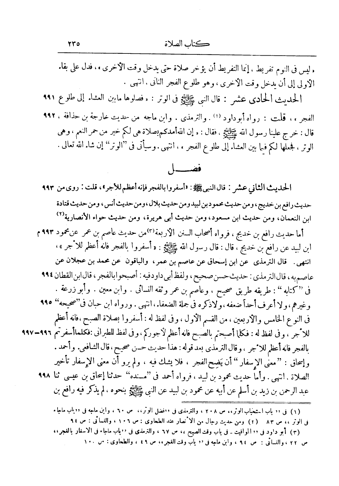 3 أبو داود في المواقيت - في باب وقت الصبح ص 67، والترمذي في باب ما جاء في الإسفار بالفجر ص 22، والنسائي: ص 94، وابن ماجه في باب وقت الفجر ص 49، والطحاوي: ص 105.