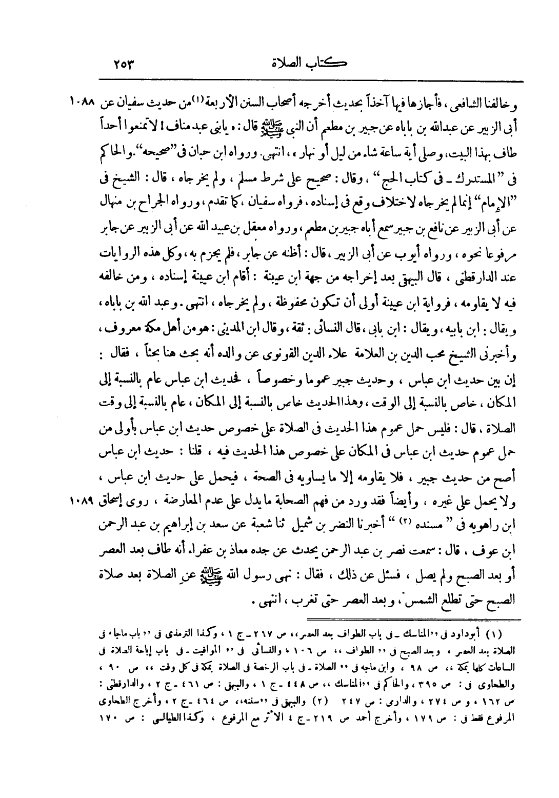 وَخَالَفَنَا الشَّافِعِيُّ، فَأَجَازَهَا فِيهَا آخِذًا بِحَدِيثٍ أَخْرَجَهُ أَصْحَابُ السُّنَنِ الْأَرْبَعَةِ1 مِنْ حَدِيثِ سُفْيَانَ عَنْ أَبِي الزُّبَيْرِ عَنْ عَبْدِ اللَّهِ بْنِ بَابَاهُ عَنْ جُبَيْرِ بْنِ مُطْعِمٍ أَنَّ النَّبِيَّ صَلَّى اللَّهُ عَلَيْهِ وَسَلَّمَ قَالَ: "يَا بَنِي عَبْدِ مَنَافٍ! لَا تَمْنَعُوا أَحَدًا طَافَ بِهَذَا الْبَيْتِ، وَصَلَّى أَيَّةَ سَاعَةٍ شَاءَ مِنْ لَيْلٍ أَوْ نَهَارٍ"، انْتَهَى. وَرَوَاهُ ابْنُ حِبَّانَ فِي صَحِيحِهِ وَالْحَاكِمُ فِي الْمُسْتَدْرَكِ - فِي كِتَابِ الْحَجِّ، وَقَالَ: صَحِيحٌ عَلَى شَرْطِ مُسْلِمٍ، وَلَمْ يُخْرِجَاهُ، قَالَ الشَّيْخُ فِي الْإِمَامِ: إنَّمَا لَمْ يُخْرِجَاهُ لِاخْتِلَافٍ وَقَعَ فِي إسْنَادِهِ، فَرَوَاهُ سُفْيَانُ كَمَا تَقَدَّمَ، وَرَوَاهُ الْجَرَّاحُ بْنُ مِنْهَالٍ عَنْ أَبِي الزُّبَيْرِ عَنْ نَافِعِ بْنِ جُبَيْرٍ سَمِعَ أَبَاهُ جُبَيْرَ بْنَ مُطْعِمٍ، وَرَوَاهُ مَعْقِلُ بْنُ عُبَيْدِ اللَّهِ عَنْ أَبِي الزُّبَيْرِ عَنْ جَابِرٍ مَرْفُوعًا نَحْوَهُ، وَرَوَاهُ أَيُّوبُ عَنْ أَبِي الزُّبَيْرِ، قَالَ: أَظُنُّهُ عَنْ جَابِرٍ، فَلَمْ يَجْزِمْ بِهِ، وَكُلُّ هَذِهِ الرِّوَايَاتِ عِنْدَ الدَّارَقُطْنِيِّ، قَالَ الْبَيْهَقِيُّ بَعْدَ إخْرَاجِهِ مِنْ جِهَةِ ابْنِ عُيَيْنَةَ: أَقَامَ ابْنُ عُيَيْنَةَ إسْنَادَهُ، وَمَنْ خَالَفَهُ فِيهِ لَا يُقَاوِمُهُ، فَرِوَايَةُ ابْنِ عُيَيْنَةَ أَوْلَى أَنْ تَكُونَ مَحْفُوظَةً، وَلَمْ يُخْرِجَاهُ، انْتَهَى. وَعَبْدُ اللَّهِ بْنُ بَابَاهُ، وَيُقَالُ: ابْنُ بَابَيْهِ، وَيُقَالُ: ابْنُ بَابِي، قَالَ النَّسَائِيُّ: ثِقَةٌ، وَقَالَ ابْنُ الْمَدِينِيِّ: هُوَ مِنْ أَهْلِ مَكَّةَ مَعْرُوفٌ، وَأَخْبَرَنِي الشَّيْخُ مُحِبُّ الدِّينِ بْنُ الْعَلَّامَةِ عَلَاءِ الدِّينِ الْقُونَوِيِّ عَنْ وَالِدِهِ أَنَّهُ بَحَثَ هُنَا بَحْثًا فَقَالَ: إنَّ بَيْنَ حَدِيثِ ابْنِ عَبَّاسٍ، وَحَدِيثِ جُبَيْرٍ عُمُومًا وَخُصُوصًا، فَحَدِيثُ ابْنِ عَبَّاسٍ عَامٌّ بِالنِّسْبَةِ إلَى الْمَكَانِ، خَاصٌّ بِالنِّسْبَةِ إلَى الْوَقْتِ، فَهَذَا الْحَدِيثُ خَاصٌّ بِالنِّسْبَةِ إلَى الْمَكَانِ، عَامٌّ بِالنِّسْبَةِ إلَى وَقْتِ الصَّلَاةِ، قَالَ: فَلَيْسَ حَمْلُ عُمُومِ هَذَا الْحَدِيثِ فِي الصَّلَاةِ عَلَى خُصُوصِ حَدِيثِ ابْنِ عَبَّاسٍ أولى مِنْ حَمْلِ عُمُومِ حَدِيثِ ابْنِ عَبَّاسٍ فِي الْمَكَانِ عَلَى خُصُوصِ هَذَا الْحَدِيثِ فِيهِ، قُلْنَا: حَدِيثُ ابْنِ عَبَّاسٍ أَصَحُّ مِنْ حَدِيثِ جُبَيْرٍ، فَلَا يُقَاوِمُهُ إلَّا مَا يُسَاوِيهِ فِي الصِّحَّةِ، فَيُحْمَلُ عَلَى حَدِيثِ ابْنِ عَبَّاسٍ، وَلَا يُحْمَلُ عَلَى غَيْرِهِ، وَأَيْضًا فَقَدْ وَرَدَ مِنْ فَهْمِ الصَّحَابَةِ مَا يَدُلُّ عَلَى عَدَمِ الْمُعَارَضَةِ، رَوَى إسْحَاقُ بْنُ رَاهْوَيْهِ فِي مُسْنَدِهِ2 أَخْبَرَنَا النَّضْرُ بْنُ شُمَيْلٍ ثنا شُعْبَةُ عَنْ سَعْدِ بْنِ إبْرَاهِيمَ بن عبد الرحمن بن عَوْفٍ، قَالَ: سَمِعْت نَصْرَ بْنَ عَبْدِ الرَّحْمَنِ يُحَدِّثُ عَنْ جَدِّهِ مُعَاذِ ابْنِ عَفْرَاءَ أَنَّهُ طَافَ بَعْدَ الْعَصْرِ أَوْ بَعْدَ الصُّبْحِ وَلَمْ يُصَلِّ، فَسُئِلَ عَنْ ذَلِكَ، فَقَالَ: نَهَى رَسُولُ الله صَلَّى اللَّهُ عَلَيْهِ وَسَلَّمَ عنِ صَلَاةِ الصُّبْحِ حَتَّى تَطْلُعَ الشَّمْسُ، وَبَعْدَ الْعَصْرِ حَتَّى تَغْرُبَ، انْتَهَى.