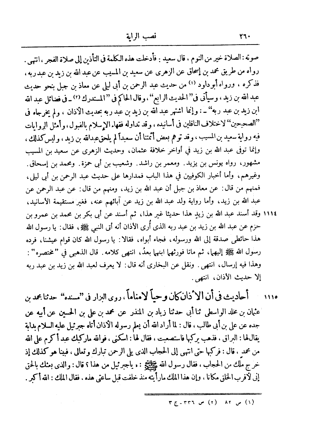 صَوْتِهِ: الصَّلَاةُ خَيْرٌ مِنْ النَّوْمِ، قَالَ سَعِيدٌ: فَأُدْخِلَتْ هَذِهِ الْكَلِمَةُ فِي التَّأْذِينِ إلَى صَلَاةِ الْفَجْرِ، انْتَهَى. رَوَاهُ مِنْ طَرِيقِ مُحَمَّدِ بْنِ إسْحَاقَ عَنْ الزُّهْرِيِّ عَنْ سَعِيدِ بْنِ الْمُسَيِّبِ عَنْ عَبْدِ اللَّهِ بْنِ زَيْدِ بْنِ عَبْدِ رَبِّهِ، فَذَكَرَهُ، وَرَوَاهُ أَبُو دَاوُد1 مِنْ حَدِيثِ عَبْدِ الرَّحْمَنِ بْنِ أَبِي لَيْلَى عَنْ مُعَاذِ بْنِ جَبَلٍ بِنَحْوِ حَدِيثِ عَبْدِ اللَّهِ بْنِ زَيْدٍ، وَسَيَأْتِي فِي الْحَدِيثِ الرَّابِعِ، وَقَالَ الْحَاكِمُ فِي الْمُسْتَدْرَكِ2 - فِي فَضَائِلِ عَبْدِ اللَّهِ بْنِ زَيْدِ بْنِ عَبْدِ رَبِّهِ -: وَإِنَّمَا اشْتَهَرَ عَبْدُ اللَّهِ بْنُ زَيْدِ بْنِ عَبْدِ رَبِّهِ بِحَدِيثِ الْأَذَانِ، وَلَمْ يُخَرِّجَاهُ فِي الصَّحِيحَيْنِ لِاخْتِلَافِ النَّاقِلِينَ فِي أَسَانِيدِهِ، وَقَدْ تَدَاوَلَهُ فُقَهَاءُ الْإِسْلَامِ بِالْقَبُولِ، وَأَمْثَلُ الرِّوَايَاتِ فِيهِ رِوَايَةُ سَعِيدِ بْنِ الْمُسَيِّبِ، وَقَدْ تَوَهَّمَ بَعْضُ أَئِمَّتِنَا أَنَّ سَعِيدًا لَمْ يُلْحِقْ عَبْدَ اللَّهِ بْنَ زَيْدٍ، وَلَيْسَ كَذَلِكَ، وَإِنَّمَا تُوُفِّيَ عَبْدُ اللَّهِ بْنُ زَيْدٍ فِي أَوَاخِرِ خِلَافَةِ عُثْمَانَ. حَدِيثُ الزُّهْرِيِّ عَنْ سَعِيدِ بْنِ الْمُسَيِّبِ مَشْهُورٌ، رَوَاهُ يُونُسُ بْنُ يَزِيدَ. وَمَعْمَرُ بْنُ رَاشِدٍ. وَشُعَيْبُ بْنُ أَبِي حَمْزَةَ. وَمُحَمَّدُ بْنُ إسْحَاقَ. وَغَيْرُهُمْ، وَأَمَّا أَخْبَارُ الْكُوفِيِّينَ فِي هَذَا الْبَابِ فَمَدَارُهَا عَلَى حَدِيثِ عَبْدِ الرَّحْمَنِ بْنِ أَبِي لَيْلَى، فَمِنْهُمْ مَنْ قَالَ: عَنْ مُعَاذِ بْنِ جَبَلٍ أَنَّ عَبْدَ اللَّهِ بْنَ زَيْدٍ، وَمِنْهُمْ مَنْ قَالَ: عَنْ عَبْدِ الرَّحْمَنِ عَنْ عَبْدِ اللَّهِ بْنِ زَيْدٍ، وَأَمَّا رِوَايَةُ وَلَدِ عَبْدِ اللَّهِ بْنِ زَيْدٍ عَنْ آبَائِهِمْ عَنْهُ، فَغَيْرُ مُسْتَقِيمَةِ الْأَسَانِيدِ، وَقَدْ أَسْنَدَ عَبْدُ اللَّهِ بْنُ زَيْدٍ هَذَا حَدِيثًا غَيْرَ هَذَا، ثُمَّ أَسْنَدَ عَنْ أَبِي بَكْرِ بْنِ مُحَمَّدِ بْنِ عَمْرِو بْنِ حَزْمٍ عَنْ عَبْدِ اللَّهِ بْنِ زَيْدِ بْنِ عَبْدِ رَبِّهِ الَّذِي أُرِيَ الْأَذَانَ أَنَّهُ أَتَى النَّبِيَّ صَلَّى اللَّهُ عَلَيْهِ وَسَلَّمَ، فَقَالَ: يَا رَسُولَ اللَّهِ هَذَا حَائِطِي صَدَقَةٌ إلَى اللَّهِ وَرَسُولِهِ، فَجَاءَ أَبَوَاهُ، فَقَالَا: يَا رَسُولَ اللَّهِ كَانَ قِوَامَ عَيْشِنَا، فَرَدَّهُ رَسُولُ اللَّهِ صَلَّى اللَّهُ عَلَيْهِ وَسَلَّمَ إلَيْهِمَا، ثُمَّ مَاتَا فَوَرِثَهُمَا ابْنُهُمَا بَعْدُ، انْتَهَى كَلَامُهُ. قَالَ الذَّهَبِيُّ فِي مُخْتَصَرِهِ: وَهَذَا فِيهِ إرْسَالٌ انْتَهَى. وَنُقِلَ عَنْ الْبُخَارِيِّ أَنَّهُ قَالَ: لَا يُعْرَفُ لِعَبْدِ اللَّهِ بْنِ زَيْدِ بْنِ عَبْدِ رَبِّهِ إلَّا حَدِيثُ الْأَذَانِ، انْتَهَى.