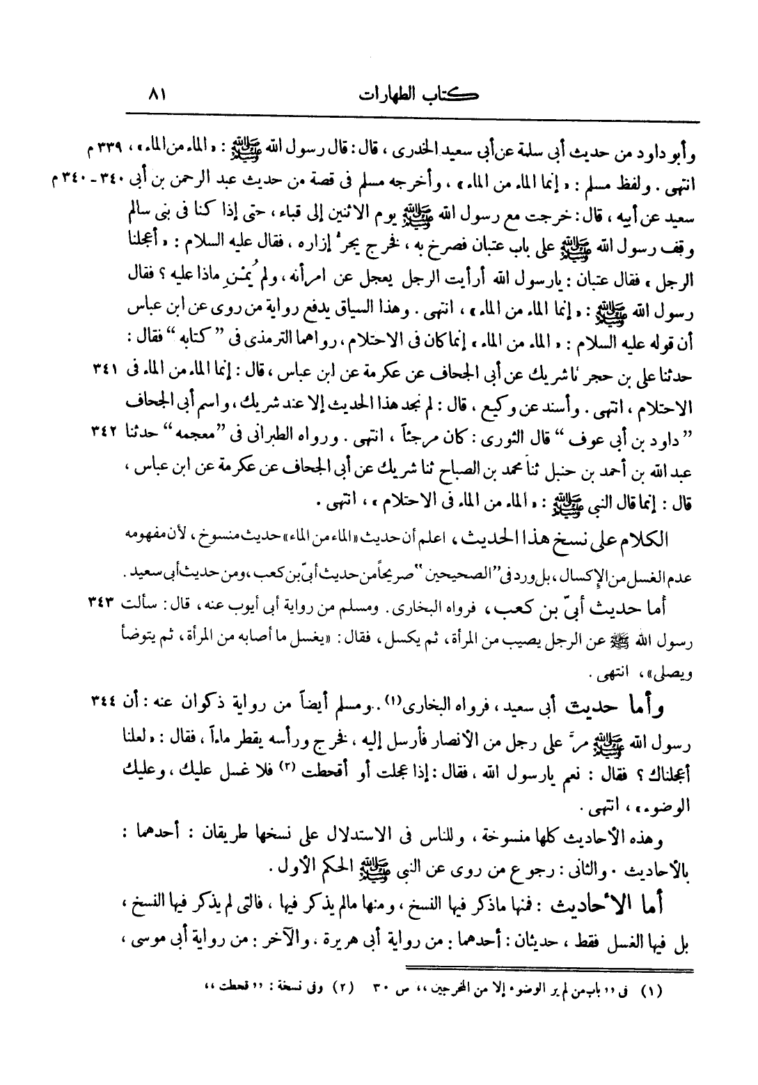 الْكَلَامُ عَلَى نَسْخِ هَذَا الْحَدِيثِ، اعْلَمْ أَنَّ حَدِيثَ الْمَاءُ مِنْ الْمَاءِ حَدِيثٌ مَنْسُوخٌ، لِأَنَّ مَفْهُومَهُ عَدَمُ الْغُسْلِ مِنْ الْإِكْسَالِ، بَلْ وَرَدَ فِي الصَّحِيحَيْنِ صَرِيحًا مِنْ حَدِيثِ أُبَيِّ بْنِ كَعْبٍ، وَمِنْ حَدِيثِ أَبِي سَعِيدٍ، أَمَّا حَدِيثُ أُبَيِّ بْنِ كَعْبٍ، فَرَوَاهُ الْبُخَارِيُّ. وَمُسْلِمٌ مِنْ رِوَايَةِ أَبِي أَيُّوبَ عَنْهُ، قَالَ: سَأَلْتُ رَسُولَ اللَّهِ صَلَّى اللَّهُ عَلَيْهِ وَسَلَّمَ عَنْ الرَّجُلِ يُصِيبُ مِنْ الْمَرْأَةِ، ثُمَّ يَكْسُلُ، فَقَالَ: "يَغْسِلُ مَا أَصَابَهُ مِنْ الْمَرْأَةِ، ثُمَّ يَتَوَضَّأُ وَيُصَلِّي"، انْتَهَى.