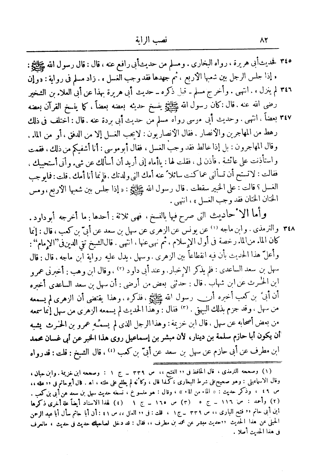 وَأَمَّا الْأَحَادِيثُ الَّتِي صُرِّحَ فِيهَا بِالنَّسْخِ، فهي ثلاثة: أحدهما: مَا أَخْرَجَهُ أَبُو دَاوُد. وَالتِّرْمِذِيُّ وَابْنُ مَاجَهْ1 عَنْ يُونُسَ عَنْ الزُّهْرِيِّ عَنْ سَهْلِ بْنِ سَعْدٍ عَنْ أُبَيِّ بْنِ كَعْبٍ، قَالَ: إنَّمَا كَانَ الْمَاءُ مِنْ الْمَاءِ رُخْصَةً فِي أَوَّلِ الْإِسْلَامِ، ثُمَّ نُهِيَ عَنْهَا، انْتَهَى. قَالَ الشَّيْخُ تَقِيُّ الدِّينِ فِي الْإِمَامِ: وَأُعِلَّ هَذَا الْحَدِيثُ بِأَنَّ فِيهِ انْقِطَاعًا بَيْنَ الزُّهْرِيِّ. وَسَهْلٍ، يَدُلُّ عَلَيْهِ رِوَايَةُ ابْنِ مَاجَهْ، قَالَ: قَالَ سَهْلُ بْنُ سَعْدٍ السَّاعِدِيُّ: فَلَمْ يذكر الإخبار، وعند أبو دَاوُد2، وَقَالَ ابْنُ وَهْبٍ: أَخْبَرَنِي عَمْرُو بْنُ الْحَارِثِ عَنْ ابْنِ شِهَابٍ، قَالَ: حَدَّثَنِي بَعْضُ مَنْ أَرْضَى: أَنَّ سَهْلَ بْنَ سَعْدٍ السَّاعِدِيَّ أَخْبَرَهُ أَنَّ أُبَيَّ بْنَ كَعْبٍ أَخْبَرَهُ أَنَّ رَسُولَ اللَّهِ صَلَّى اللَّهُ عَلَيْهِ وَسَلَّمَ، فَذَكَرَهُ، وَهَذَا يَقْتَضِي أَنَّ الزُّهْرِيَّ لَمْ يَسْمَعْهُ مِنْ سَهْلٍ، وَقَدْ جَزَمَ بِذَلِكَ الْبَيْهَقِيُّ، 3فَقَالَ: وَهَذَا الْحَدِيثُ لَمْ يَسْمَعْهُ الزُّهْرِيُّ مِنْ سَهْلٍ إنَّمَا سَمِعَهُ مِنْ بَعْضِ أَصْحَابِهِ عَنْ سَهْلٍ، قَالَ ابْنُ خُزَيْمَةَ: وَهَذَا الرَّجُلُ الَّذِي لَمْ يُسَمِّهِ عَمْرُو بْنُ الْحَارِثِ يُشْبِهُ أَنْ يَكُونَ أَبَا حَازِمِ بْنِ سَلَمَةَ بْنِ دِينَارٍ، لِأَنَّ مُبَشِّرَ بْنَ إسْمَاعِيلَ رَوَى هَذَا الْخَبَرَ عَنْ أَبِي غَسَّانَ مُحَمَّدِ بْنِ مُطَرِّفٍ عَنْ أَبِي حَازِمٍ عَنْ سَهْلِ بْنِ سَعْدٍ عَنْ أُبَيِّ بْنِ كَعْبٍ4 قَالَ الشَّيْخُ: قُلْتُ: قَدْ رَوَاهُ