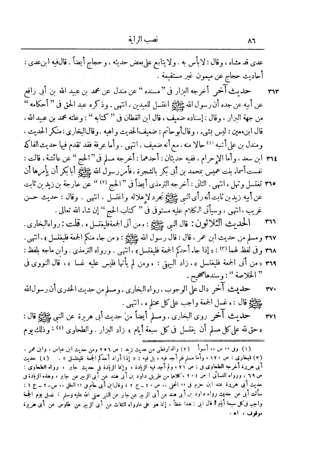 4 حديث أبي هريرة أخرجه الطحاوي في: ص 71، ولم أجد فيه الزيادة، وإنما الزيادة في حديث جابر، رواه الطحاوي: ص 69، ورواه النسائي: ص 204، كلاهما من طريق داود بن أبي هند عن أبي الزبير عن جابر، وهذه الزيادة في حديث أبي هريرة عند ابن حزم في المحلى ص 20 - ج 2، وقال ابن أبي حاتم في العلل ص 28 - ج 1: سألت أبي عن حديث رواه داود بن أبي هند عن أبي الزبير عن جابر عن النبي صَلَّى اللَّهُ عَلَيْهِ وَسَلَّمَ: غسل يوم الجمعة واجب في كل سبعة أيام؟ قال أبي: هذا خطأ، إنما هو على ما رواه الثقات عن أبي الزبير عن طاوس عن أبي هريرة موقوف، اهـ.