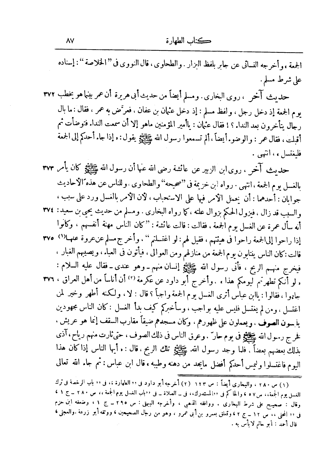 حَدِيثٌ آخَرُ، رَوَى ابْنُ الزُّبَيْرِ عَنْ عَائِشَةَ رضي الله عنها أَنَّ رَسُولَ اللَّهِ صَلَّى اللَّهُ عَلَيْهِ وَسَلَّمَ كَانَ يَأْمُرُ بِالْغُسْلِ يَوْمَ الْجُمُعَةِ، انْتَهَى. رَوَاهُ ابْنُ خُزَيْمَةَ فِي صَحِيحِهِ وَالطَّحَاوِيُّ، وَلِلنَّاسِ عَنْ هَذِهِ الْأَحَادِيثِ جَوَابَانِ: أَحَدُهُمَا: أَنْ يُحْمَلَ الْأَمْرُ فِيهَا عَلَى الِاسْتِحْبَابِ، لِأَنَّ الْأَمْرَ بِالْغُسْلِ وَرَدَ عَلَى سَبَبٍ، وَالسَّبَبُ قَدْ زَالَ، فَيَزُولُ الْحُكْمُ بِزَوَالِ عِلَّتِهِ، كَمَا رَوَاهُ الْبُخَارِيُّ. وَمُسْلِمٌ مِنْ حَدِيثِ يَحْيَى بْنِ سَعِيدٍ: أَنَّهُ سَأَلَ عَمْرَةَ عَنْ الْغُسْلِ يَوْمَ الْجُمُعَةِ، فَقَالَتْ: قَالَتْ عَائِشَةُ: كَانَ النَّاسُ مَهَنَةَ أَنْفُسِهِمْ، وَكَانُوا إذَا رَاحُوا إلَى الْجُمُعَةِ رَاحُوا فِي هَيْئَتِهِمْ، فَقِيلَ لَهُمْ: لَوْ اغْتَسَلْتُمْ، وَأَخْرَجَ مُسْلِمٌ عَنْ عروة عنهما1 قَالَتْ: كَانَ النَّاسُ يَنْتَابُونَ يَوْمَ الْجُمُعَةِ مِنْ مَنَازِلِهِمْ وَمِنْ الْعَوَالِي، فَيَأْتُونَ فِي الْعَبَاءِ، وَيُصِيبُهُمْ الْغُبَارُ، فَيَخْرُجُ مِنْهُمْ الرِّيحُ، فَأَتَى رَسُولَ اللَّهِ صَلَّى اللَّهُ عَلَيْهِ وَسَلَّمَ إنْسَانٌ مِنْهُمْ - وَهُوَ عِنْدِي - فَقَالَ عليه السلام: "لَوْ أَنَّكُمْ تَطَهَّرْتُمْ لِيَوْمِكُمْ هَذَا"، وَأَخْرَجَ أَبُو دَاوُد عَنْ عِكْرِمَةَ2 أَنَّ أُنَاسًا من أهل العراق، جاؤوا، فَقَالُوا: يَا ابْنَ عَبَّاسٍ أَتَرَى الْغُسْلَ يَوْمَ الْجُمُعَةِ وَاجِبًا؟ قَالَ: لَا، وَلَكِنَّهُ أَطْهَرُ وَخَيْرٌ لِمَنْ اغْتَسَلَ، وَمَنْ لَمْ يَغْتَسِلْ فَلَيْسَ عَلَيْهِ بِوَاجِبٍ، وَسَأُخْبِرُكُمْ كَيْفَ بَدَأَ الْغُسْلُ: كَانَ النَّاسُ مجهودين يلبسن الصُّوفَ، وَيَعْمَلُونَ عَلَى ظُهُورِهِمْ، وَكَانَ مَسْجِدُهُمْ ضَيِّقًا مُقَارِبَ السَّقْفِ إنَّمَا هُوَ عَرِيشٌ، فَخَرَجَ رَسُولُ اللَّهِ صَلَّى اللَّهُ عَلَيْهِ وَسَلَّمَ فِي يَوْمٍ حَارٍّ، وَعَرِقَ النَّاسُ فِي ذَلِكَ الصُّوفِ، حَتَّى ثَارَتْ مِنْهُمْ رِيَاحٌ، آذَى بِذَلِكَ بَعْضُهُمْ بَعْضًا، فَلَمَّا وَجَدَ رَسُولُ اللَّهِ صَلَّى اللَّهُ عَلَيْهِ وَسَلَّمَ تِلْكَ الرِّيحَ، قَالَ: "أَيُّهَا النَّاسُ إذَا كَانَ هَذَا الْيَوْمَ فَاغْتَسِلُوا وَلْيَمَسَّ أَحَدُكُمْ أَفْضَلَ مَا يَجِدُ مِنْ دُهْنِهِ وَطِيبِهِ" قَالَ ابْنُ عَبَّاسٍ: ثُمَّ جَاءَ اللَّهُ تَعَالَى