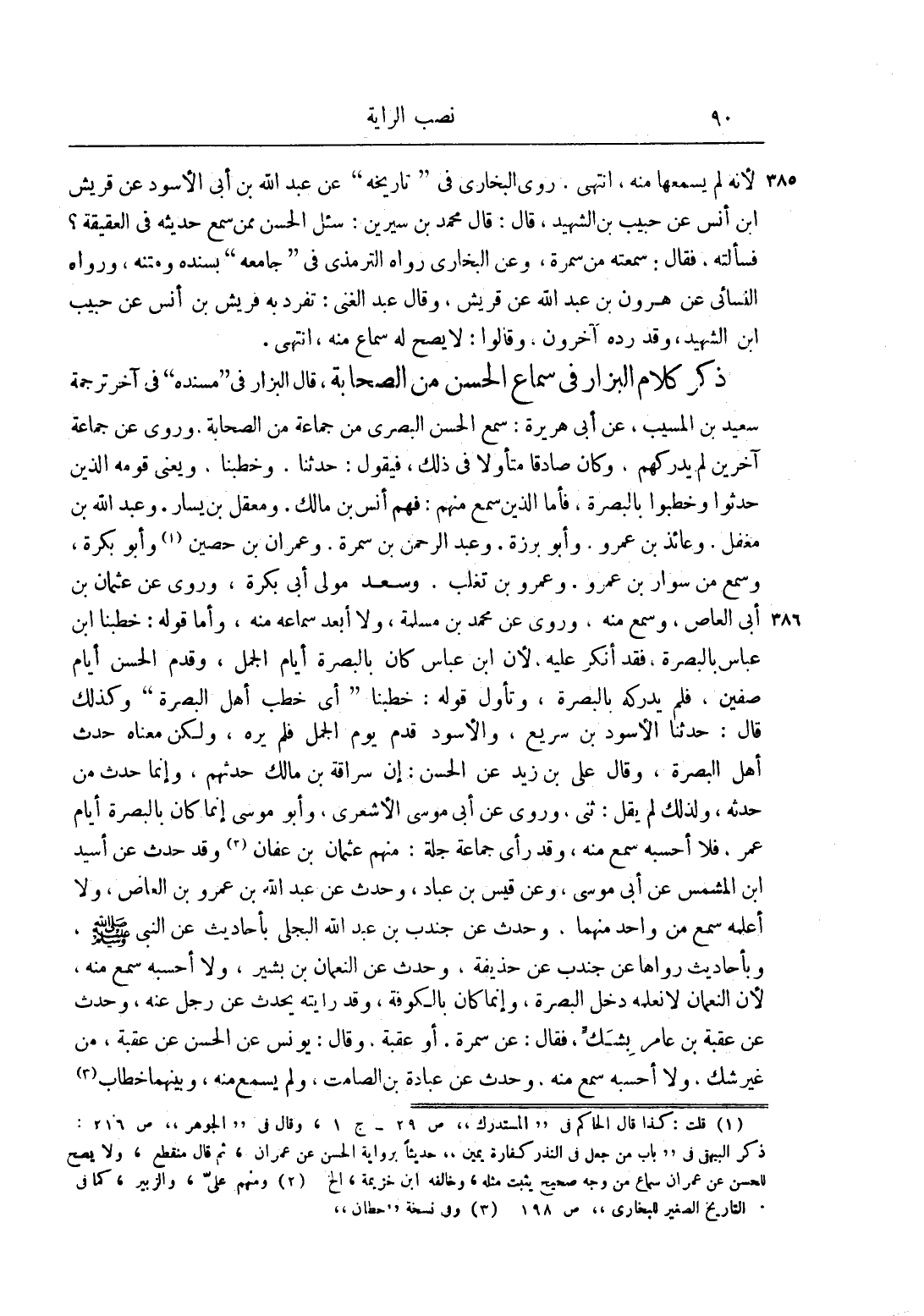 ذِكْرُ كَلَامِ الْبَزَّارِ فِي سَمَاعِ الْحَسَنِ مِنْ الصَّحَابَةِ، قَالَ الْبَزَّارُ فِي مُسْنَدِهِ فِي آخَرِ تَرْجَمَةِ سَعِيدِ بْنِ الْمُسَيِّبِ، عَنْ أَبِي هُرَيْرَةَ: سَمِعَ الْحَسَنُ الْبَصْرِيُّ مِنْ جَمَاعَةٍ مِنْ الصَّحَابَةِ، وَرَوَى عَنْ جَمَاعَةٍ آخَرِينَ لَمْ يُدْرِكْهُمْ، وَكَانَ صَادِقًا مُتَأَوِّلًا فِي ذَلِكَ، فَيَقُولُ: حَدَّثَنَا. وَخَطَبَنَا.، وَيَعْنِي قَوْمَهُ الَّذِينَ حَدَّثُوا وَخَطَبُوا بِالْبَصْرَةِ، فَأَمَّا الَّذِينَ سَمِعَ مِنْهُمْ: فَهُوَ أَنَسُ بْنُ مَالِكٍ. وَمَعْقِلُ بْنُ يَسَارٍ. وَعَبْدُ اللَّهِ بْنُ مُغَفَّلٍ. وَعَائِذُ بْنُ عَمْرٍو. وَأَبُو بَرْزَةَ. وَعَبْدُ الرَّحْمَنِ بْنُ سَمُرَةَ. وَعِمْرَانُ بْنُ حُصَيْنٍ1. وَأَبُو بَكْرَةَ، وَسَمِعَ مِنْ سَوَّارِ بْنِ عَمْرٍو. وَعَمْرِو بْنِ تَغْلِبَ. وَسَعْدٍ. مَوْلَى أَبِي بَكْرَةَ، وَرَوَى عَنْ عُثْمَانَ بْنِ أَبِي الْعَاصِ، وَسَمِعَ مِنْهُ، وَرَوَى عَنْ مُحَمَّدِ بْنِ مَسْلَمَةً، وَلَا أُبْعِدُ سَمَاعَهُ مِنْهُ، وَأَمَّا قَوْلُهُ: خَطَبَنَا ابْنُ عَبَّاسٍ بِالْبَصْرَةِ، فَقَدْ أُنْكِرُ عَلَيْهِ، لِأَنَّ ابْنَ عَبَّاسٍ كَانَ بِالْبَصْرَةِ أَيَّامَ الْجَمَلِ، وَقَدِمَ الْحَسَنُ أَيَّامَ صِفِّينَ، فَلَمْ يُدْرِكْهُ بِالْبَصْرَةِ، وَتَأَوَّلَ قَوْلَهُ: خَطَبَنَا أَيْ خَطَبَ أَهْلُ الْبَصْرَةِ وَكَذَلِكَ قَالَ: حَدَّثَنَا الْأَسْوَدُ بْنُ سَرِيعٍ، وَالْأَسْوَدُ قَدِمَ يَوْمَ الْجَمَلِ فَلَمْ يَرَهُ، وَلَكِنَّ مَعْنَاهُ حَدَّثَ أَهْلَ الْبَصْرَةِ، وَقَالَ عَلِيُّ بْنُ زَيْدٍ عَنْ الْحَسَنِ: إنَّ سُرَاقَةَ بْنَ مَالِكٍ حَدَّثَهُمْ، وَإِنَّمَا حَدَّثَ مَنْ حَدَّثَهُ، وَلِذَلِكَ لَمْ يَقُلْ: ثَنِيّ، وَرَوَى عَنْ أَبِي مُوسَى الْأَشْعَرِيِّ، وَأَبُو مُوسَى إنَّمَا كَانَ بِالْبَصْرَةِ أَيَّامَ عُمَرَ، فَلَا أَحْسَبُهُ سَمِعَ مِنْهُ، وَقَدْ رَأَى جَمَاعَةً جُلَّةً: مِنْهُمْ عُثْمَانُ بْنُ عَفَّانَ2 وَقَدْ حَدَّثَ عَنْ أَسِيد بْنِ المشمس عَنْ أَبِي مُوسَى، وَعَنْ قَيْسِ بْنِ عَبَّادٍ، وَحَدَّثَ عَنْ عَبْدِ اللَّهِ بْنِ عَمْرِو بْنِ الْعَاصِ، وَلَا أَعْلَمُهُ سَمِعَ مِنْ وَاحِدٍ مِنْهُمَا، وَحَدَّثَ عَنْ جُنْدُبِ بْنِ عَبْدِ اللَّهِ الْبَجَلِيِّ بِأَحَادِيثَ عَنْ النَّبِيِّ صَلَّى اللَّهُ عَلَيْهِ وَسَلَّمَ، وَبِأَحَادِيثَ رَوَاهَا عَنْ جُنْدُبٍ عَنْ حُذَيْفَةَ، وَحَدَّثَ عَنْ النُّعْمَانِ بْنِ بَشِيرٍ، وَلَا أَحْسَبُهُ سَمِعَ مِنْهُ، لِأَنَّ النُّعْمَانَ لَا نَعْلَمُهُ دَخَلَ الْبَصْرَةَ، وَإِنَّمَا كَانَ بِالْكُوفَةِ، وَقَدْ رَأَيْته يُحَدِّثُ عَنْ رَجُلٍ عَنْهُ، وَحَدَّثَ عَنْ عُقْبَةَ بْنِ عَامِرٍ بِشَكٍّ، فَقَالَ: عَنْ سَمُرَةَ. أَوْ عُقْبَةَ، وَقَالَ: يُونُسُ عَنْ الْحَسَنِ عَنْ عُقْبَةَ، مِنْ غَيْرِ شَكٍّ، وَلَا أَحْسَبُهُ سَمِعَ مِنْهُ، وَحَدَّثَ عَنْ عُبَادَةَ بْنِ الصَّامِتِ، وَلَمْ يَسْمَعْ مِنْهُ، وَبَيْنَهُمَا خَطَّابُ3