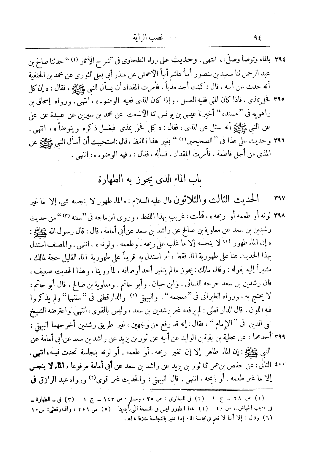الْحَدِيثُ الثَّالِثُ وَالثَّلَاثُونَ: قَالَ عليه السلام: "الْمَاءُ طَهُورٌ لَا يُنَجِّسُهُ شَيْءٌ إلَّا مَا غَيَّرَ لَوْنَهُ أَوْ طَعْمَهُ أَوْ رِيحَهُ"، قُلْت: غَرِيبٌ بِهَذَا اللَّفْظِ، وَرَوَى ابْنُ مَاجَهْ فِي سُنَنِهِ3 مِنْ حَدِيثِ رِشْدِينَ بْنِ سَعْدٍ عَنْ مُعَاوِيَةَ بْنِ صَالِحٍ عَنْ رَاشِدِ بْنِ سَعْدٍ عَنْ أَبِي أُمَامَةَ، قَالَ: قَالَ رَسُولُ اللَّهِ صَلَّى اللَّهُ عَلَيْهِ وَسَلَّمَ: "إنَّ الْمَاءَ طَهُورٌ4 لَا يُنَجِّسُهُ إلَّا مَا غَلَبَ عَلَى رِيحِهِ. وَطَعْمِهِ. وَلَوْنِهِ"، انْتَهَى. وَالْمُصَنِّفُ اسْتَدَلَّ بِهَذَا الْحَدِيثِ هُنَا عَلَى طَهُورِيَّةِ الْمَاءِ فَقَطْ، ثُمَّ اسْتَدَلَّ بِهِ قَرِيبًا عَلَى طَهُورِيَّةِ الْمَاءِ الْقَلِيلِ حُجَّةً لِمَالِكٍ، مُشِيرًا إلَيْهِ بِقَوْلِهِ: وَقَالَ مَالِكٌ: يَجُوزُ مَا لَمْ يَتَغَيَّرْ أَحَدُ أَوْصَافِهِ، لِمَا رَوَيْنَا، وَهَذَا الْحَدِيثُ ضَعِيفٌ، فَإِنَّ رِشْدِينَ بْنَ سَعْدٍ جَرَحَهُ النَّسَائِيّ. وَابْنُ حِبَّانَ. وَأَبُو حَاتِمٍ. وَمُعَاوِيَةُ بْنُ صَالِحٍ، قَالَ أَبُو حَاتِمٍ: لَا يُحْتَجُّ بِهِ، وَرَوَاهُ الطَّبَرَانِيُّ فِي مُعْجَمِهِ، وَالْبَيْهَقِيُّ5 والدارقطني فِي سُنَنِهِمَا وَلَمْ يَذْكُرُوا فِيهِ اللَّوْنَ، قَالَ الدَّارَقُطْنِيُّ: لَمْ يَرْفَعْهُ غَيْرُ رِشْدِينَ بْنِ سَعْدٍ، وَلَيْسَ بِالْقَوِيِّ، انْتَهَى. وَاعْتَرَضَهُ الشَّيْخُ تَقِيُّ الدِّينِ فِي الْإِمَامِ، فَقَالَ: إنَّهُ قَدْ رُفِعَ مِنْ وَجْهَيْنِ، غَيْرِ طَرِيقِ رِشْدِينَ أَخْرَجَهُمَا الْبَيْهَقِيُّ: أَحَدُهُمَا: عَنْ عَطِيَّةَ بْنِ بَقِيَّةَ بْنِ الْوَلِيدِ عَنْ أَبِيهِ عَنْ ثَوْرِ بْنِ يَزِيدَ عَنْ رَاشِدِ بْنِ سَعْدٍ عَنْ أَبِي أُمَامَةَ عَنْ النَّبِيِّ صَلَّى اللَّهُ عَلَيْهِ وَسَلَّمَ: "أَنَّ الْمَاءَ طَاهِرٌ إلَّا إنْ تَغَيَّرَ رِيحُهُ. أَوْ طَعْمُهُ. أَوْ لَوْنُهُ بِنَجَاسَةٍ تَحْدُثُ فِيهَا"، انْتَهَى. الثَّانِي: عَنْ حَفْصِ بن عُمَرُ ثَنَا ثَوْرُ بْنُ يَزِيدَ عَنْ رَاشِدِ بْنِ سَعْدٍ عَنْ أَبِي أُمَامَةَ مَرْفُوعًا الْمَاءُ لَا يَنْجُسُ إلَّا مَا غُيِّرَ طَعْمُهُ. أَوْ رِيحُهُ انْتَهَى. قَالَ الْبَيْهَقِيُّ: وَالْحَدِيثُ غَيْرُ قَوِيٍّ6 وَرَوَاهُ عَبْدُ الرَّزَّاقِ فِي