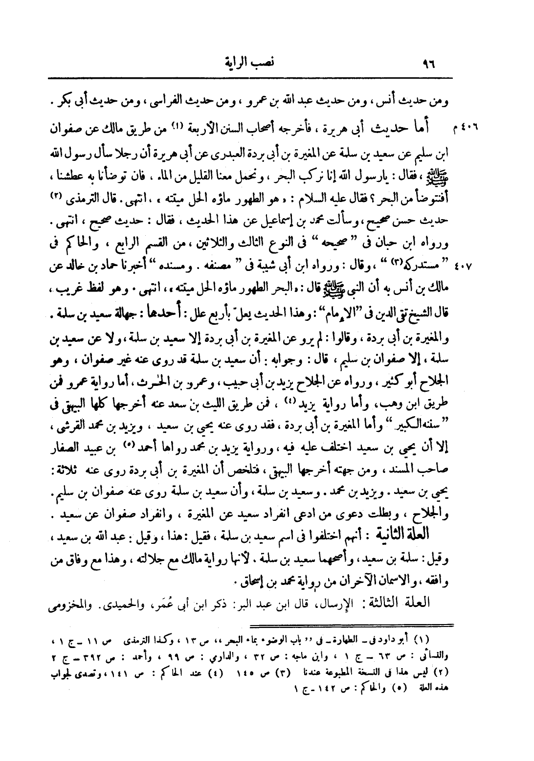 أَمَّا حَدِيثُ أَبِي هُرَيْرَةَ، فَأَخْرَجَهُ أَصْحَابُ السُّنَنِ الْأَرْبَعَةِ1 مِنْ طَرِيقِ مَالِكٍ عَنْ صَفْوَانَ بْنِ سُلَيْمٍ عَنْ سَعِيدِ بْنِ سَلَمَةَ عَنْ الْمُغِيرَةِ بْنِ أَبِي بُرْدَةَ الْعَبْدَرِيِّ عَنْ أَبِي هُرَيْرَةَ أَنَّ رَجُلًا سَأَلَ رَسُولَ اللَّهِ صَلَّى اللَّهُ عَلَيْهِ وَسَلَّمَ، فَقَالَ: يَا رَسُولَ اللَّهِ إنَّا نَرْكَبُ الْبَحْرَ، وَنَحْمِلُ مَعَنَا الْقَلِيلَ مِنْ الْمَاءِ، فَإِنْ تَوَضَّأْنَا بِهِ عَطِشْنَا، أَفَنَتَوَضَّأُ مِنْ الْبَحْرِ؟ فَقَالَ عليه السلام: "هُوَ الطَّهُورُ مَاؤُهُ الْحِلُّ مَيْتَتُهُ"، انْتَهَى. قَالَ التِّرْمِذِيُّ2: حَدِيثٌ حَسَنٌ صَحِيحٌ، وَسَأَلْت مُحَمَّدَ بْنَ إسْمَاعِيلَ عَنْ هَذَا الْحَدِيثِ، فَقَالَ: حَدِيثٌ صَحِيحٌ، انْتَهَى. وَرَوَاهُ ابْنُ حِبَّانَ فِي صَحِيحِهِ فِي النَّوْعِ الثَّالِثِ وَالثَّلَاثِينَ، مِنْ الْقِسْمِ الرَّابِعِ، وَالْحَاكِمُ فِي مستدركه3، وقال: رواه ابْنُ أَبِي شَيْبَةَ فِي مُصَنَّفِهِ. وَمُسْنَدِهِ أَخْبَرَنَا حَمَّادُ بْنُ خَالِدٍ عَنْ مَالِكِ بْنِ أَنَسٍ بِهِ أَنَّ النَّبِيَّ صَلَّى اللَّهُ عَلَيْهِ وَسَلَّمَ قَالَ: "الْبَحْرُ الطَّهُورُ مَاؤُهُ الْحِلُّ مَيْتَتُهُ" انْتَهَى. وَهُوَ لَفْظٌ غَرِيبٌ، قَالَ الشَّيْخُ تَقِيُّ الدِّينِ فِي الْإِمَامِ: وَهَذَا الْحَدِيثُ يُعَلُّ بِأَرْبَعِ عِلَلٍ: أَحَدُهَا: جَهَالَةُ سَعِيدِ بْنِ سَلَمَةَ. وَالْمُغِيرَةِ بْنِ أَبِي بُرْدَةَ، وَقَالُوا: لَمْ يَرْوِ عَنْ الْمُغِيرَةِ بْنِ أَبِي بُرْدَةَ إلَّا سَعِيدُ بْنُ سَلَمَةَ، وَلَا عَنْ سَعِيدِ بْنِ سَلَمَةَ، إلَّا صَفْوَانُ بْنُ سُلَيْمٍ، قَالَ: وَجَوَابُهُ: أَنَّ سَعِيدَ بْنَ سَلَمَةَ قَدْ رَوَى عَنْهُ غَيْرُ صَفْوَانَ، وَهُوَ الْجُلَاحُ أَبُو كَثِيرٍ، وَرَوَاهُ عَنْ الْجُلَاحِ يَزِيدُ بْنُ أَبِي حَبِيبٍ، وَعَمْرُو بْنُ الْحَارِثِ، أَمَّا رِوَايَةُ عَمْرٍو فَمِنْ طَرِيقِ ابْنِ وَهْبٍ، وَأَمَّا رِوَايَةُ يَزِيدَ4، فَمِنْ طَرِيقِ اللَّيْثِ بْنِ سَعْدٍ عَنْهُ أَخْرَجَهَا كُلَّهَا الْبَيْهَقِيُّ فِي سُنَنِهِ الْكَبِيرِ وَأَمَّا الْمُغِيرَةُ بْنُ أَبِي بُرْدَةَ، فَقَدْ رَوَى عَنْهُ يَحْيَى بن سعيد، وَيَزِيدُ بْنُ مُحَمَّدٍ الْقُرَشِيُّ، إلَّا أَنَّ يَحْيَى بْنَ سَعِيدٍ اُخْتُلِفَ عَلَيْهِ فِيهِ، وَرِوَايَةُ يَزِيدَ بْنِ مُحَمَّدٍ رَوَاهَا أَحْمَدُ5 بْنُ عُبَيْدٍ الصَّفَّارُ صَاحِبُ الْمُسْنَدِ، وَمِنْ جِهَتِهِ أَخْرَجَهَا الْبَيْهَقِيُّ، فَتَلَخَّصَ أَنَّ الْمُغِيرَةَ بْنَ أَبِي بُرْدَةَ رَوَى عَنْهُ ثَلَاثَةٌ: يحيى بن سعيد. وَيَزِيدُ بْنُ مُحَمَّدٍ. وَسَعِيدُ بْنُ سَلَمَةَ، وَأَنَّ سَعِيدَ بْنَ سَلَمَةَ رَوَى عَنْهُ صَفْوَانُ بْنُ سُلَيْمٍ. وَالْجُلَاحُ، وَبَطَلَتْ دَعْوَى مَنْ ادَّعَى انْفِرَادَ سَعِيدٍ عَنْ الْمُغِيرَةِ، وانفرد صَفْوَانَ عَنْ سَعِيدٍ.