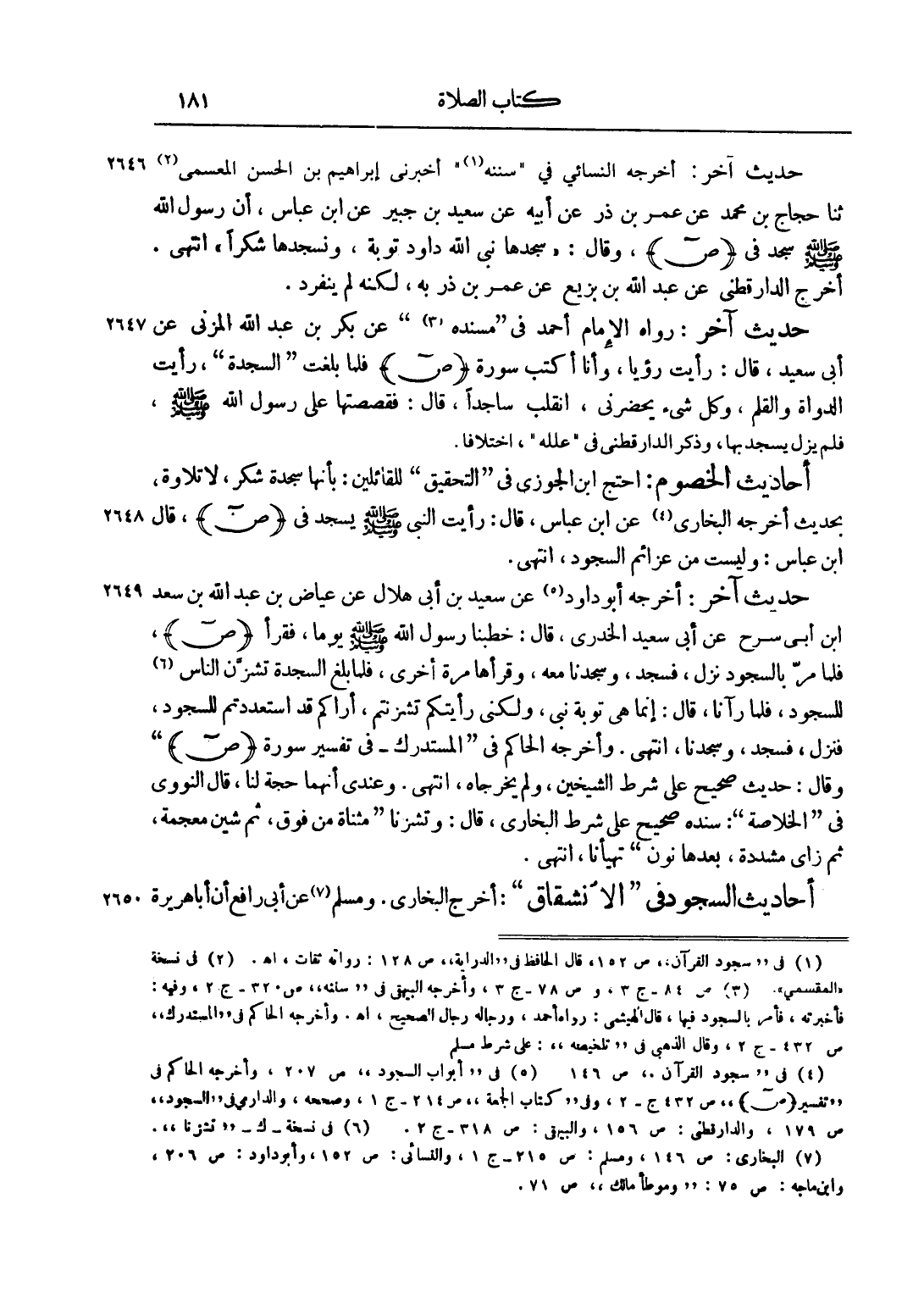 أَحَادِيثُ الْخُصُومِ: احْتَجَّ ابْنُ الْجَوْزِيِّ فِي "التَّحْقِيقِ" لِلْقَائِلِينَ: بِأَنَّهَا سَجْدَةُ شُكْرٍ، لَا تِلَاوَةٍ بِحَدِيثٍ أَخْرَجَهُ الْبُخَارِيُّ4 عَنْ ابْنِ عَبَّاسٍ، قَالَ: رَأَيْت النَّبِيَّ صَلَّى اللَّهُ عَلَيْهِ وَسَلَّمَ يَسْجُدُ فِي {ص} ، قَالَ ابْنُ عباس: وليست مِنْ عَزَائِمِ السُّجُودِ، انْتَهَى.