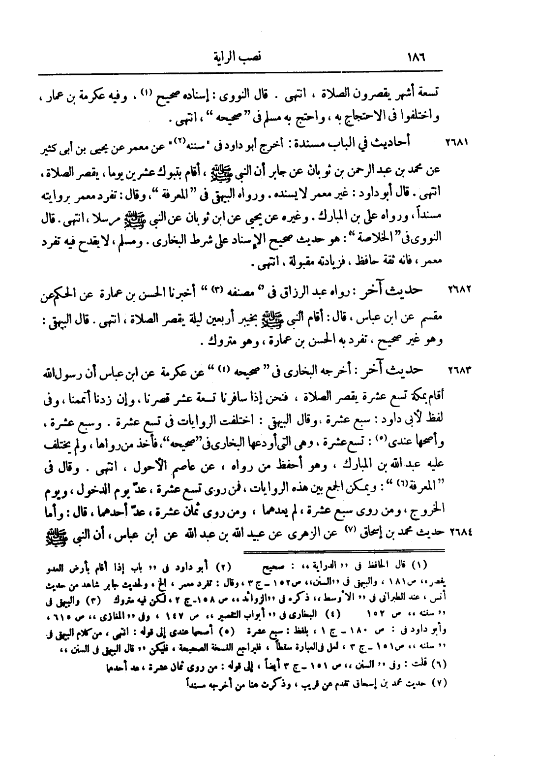 أَحَادِيثُ الْبَابِ، مُسْنَدَةٌ: أَخْرَجَ أَبُو دَاوُد فِي "سُنَنِهِ2" عَنْ مَعْمَرٍ عَنْ يَحْيَى بْنِ أَبِي كَثِيرٍ عَنْ مُحَمَّدِ بْنِ عَبْدِ الرَّحْمَنِ بْنِ ثَوْبَانَ عَنْ جَابِرٍ أَنَّ النَّبِيَّ صَلَّى اللَّهُ عَلَيْهِ وَسَلَّمَ، أَقَامَ بِتَبُوكَ عِشْرِينَ يَوْمًا، يَقْصُرُ الصَّلَاةَ، انْتَهَى. قَالَ أَبُو دَاوُد: غَيْرُ مَعْمَرٍ لَا يُسْنِدُهُ. وَرَوَاهُ الْبَيْهَقِيُّ فِي "الْمَعْرِفَةِ"، وَقَالَ: تَفَرَّدَ مَعْمَرٌ بِرِوَايَتِهِ مُسْنَدًا، وَرَوَاهُ عَلِيُّ بْنُ الْمُبَارَكِ. وَغَيْرُهُ عَنْ يَحْيَى عَنْ ابْنِ ثَوْبَانَ عَنْ النَّبِيِّ صَلَّى اللَّهُ عَلَيْهِ وَسَلَّمَ مُرْسَلًا، انْتَهَى. قَالَ النَّوَوِيُّ فِي "الْخُلَاصَةِ": هُوَ حَدِيثٌ صَحِيحُ الْإِسْنَادِ عَلَى شَرْطِ الْبُخَارِيِّ. وَمُسْلِمٍ، لَا يَقْدَحُ فِيهِ تَفَرُّدُ مَعْمَرٍ، فَإِنَّهُ ثِقَةٌ حَافِظٌ، فَزِيَادَتُهُ مَقْبُولَةٌ، انْتَهَى.