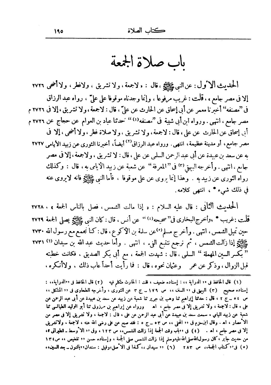 الْحَدِيثُ الْأَوَّلُ: عَنْ النَّبِيِّ صَلَّى اللَّهُ عَلَيْهِ وَسَلَّمَ قَالَ: "لَا جُمُعَةَ، وَلَا تَشْرِيقَ، وَلَا فِطْرَ، وَلَا أَضْحَى إلَّا فِي مِصْرٍ جَامِعٍ"،قُلْت: غَرِيبٌ مَرْفُوعًا، وَإِنَّمَا وَجَدْنَاهُ موقوفاً على عليّ، رواه عَبْدُ الرَّزَّاقِ فِي "مُصَنَّفِهِ" أَخْبَرَنَا مَعْمَرٌ عَنْ أَبِي إسْحَاقَ عَنْ الْحَارِثِ عَنْ عَلِيٍّ، قَالَ: لَا جُمُعَةَ، وَلَا تَشْرِيقَ، إلَّا فِي مِصْرٍ جَامِعٍ، انْتَهَى. وَرَوَاهُ ابْنُ أَبِي شَيْبَةَ فِي "مُصَنَّفِهِ1" حَدَّثَنَا عَبَّادُ بْنُ الْعَوَّامِ عَنْ حَجَّاجٍ عَنْ أَبِي إسْحَاقَ عَنْ الْحَارِثِ عَنْ عَلِيٍّ، قَالَ: لَا جُمُعَةَ، وَلَا تَشْرِيقَ، وَلَا صَلَاةَ فِطْرٍ، وَلَا أَضْحَى، إلَّا فِي مِصْرٍ جَامِعٍ، أَوْ مَدِينَةٍ عَظِيمَةِ، انْتَهَى. وَرَوَاهُ عَبْدُ الرَّزَّاقِ2 أَيْضًا، أنبأنا الثوري عن زبيد الأيامي بِهِ عَنْ سَعْدِ بْنِ عُبَيْدَةَ عَنْ أَبِي عَبْدِ الرَّحْمَنِ السُّلَمِيُّ عَنْ عَلِيٍّ، قَالَ: لَا تَشْرِيقَ، وَلَا جُمُعَةَ، إلَّا فِي مِصْرٍ جَامِعٍ، انْتَهَى. وَأَخْرَجَهُ الْبَيْهَقِيُّ3 فِي "الْمَعْرِفَةِ" عَنْ شُعْبَةَ عن زبيد الأيامي بِهِ، قَالَ: وَكَذَلِكَ رَوَاهُ الثَّوْرِيُّ عَنْ زُبَيْدٍ بِهِ: وَهَذَا إنَّمَا يُرْوَى عَنْ عَلِيٍّ مَوْقُوفًا، فَأَمَّا النَّبِيُّ صَلَّى اللَّهُ عَلَيْهِ وَسَلَّمَ فَإِنَّهُ لَا يُرْوَى عَنْهُ فِي ذَلِكَ شَيْءٌ، انْتَهَى كَلَامُهُ.