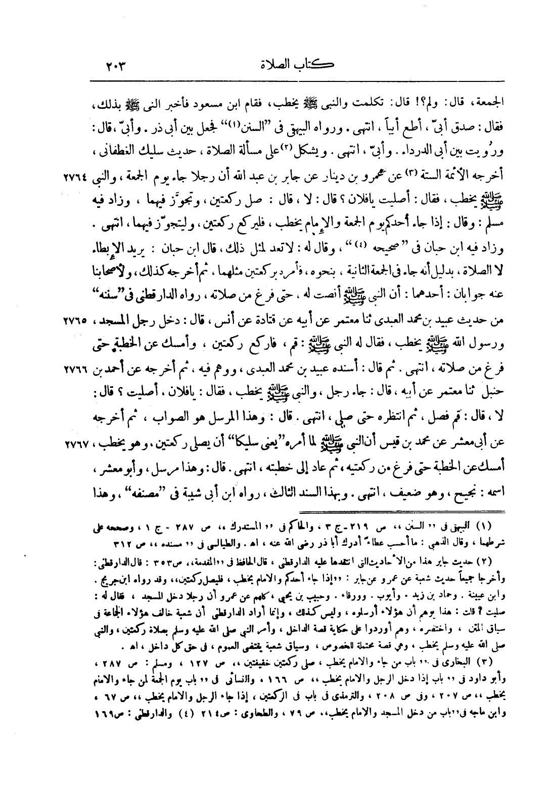 2 حديث جابر هذا من الأحاديث التي انتقدها عليه الدارقطني، قال الحافظ في "المقدمة" ص 353: قال الدارقطني: وأخرجا جميعاً حديث شعبة عن عمرو عن جابر: "إذا جاء أحدكم والإِمام يخطب، فليصل ركعتين" وقد رواه ابن جريج وابن عيينة. وحماد بن زيد. وأيوب. وورقاء. وحبيب بن يحيى، كلهم عن عمرو أن رجلا دخل المسجد، فقال له: صليت؟ قلت: هذا يوهم أن هؤلاء أرسلوه، وليس كذلك، وإنما أراد الدارقطني أن شعبة خالف هؤلاء الجماعة في سياق المتن، واختصره، وهم أوردوا على حكاية قصة الداخل، وأمر النبي صَلَّى اللَّهُ عَلَيْهِ وَسَلَّمَ بصلاة ركعتين، والنبي صَلَّى اللَّهُ عَلَيْهِ وَسَلَّمَ يخطب، وهي قصة محتملة للخصوص، وسياق شعبة يقتضي العموم، في حق كل داخل، اهـ.