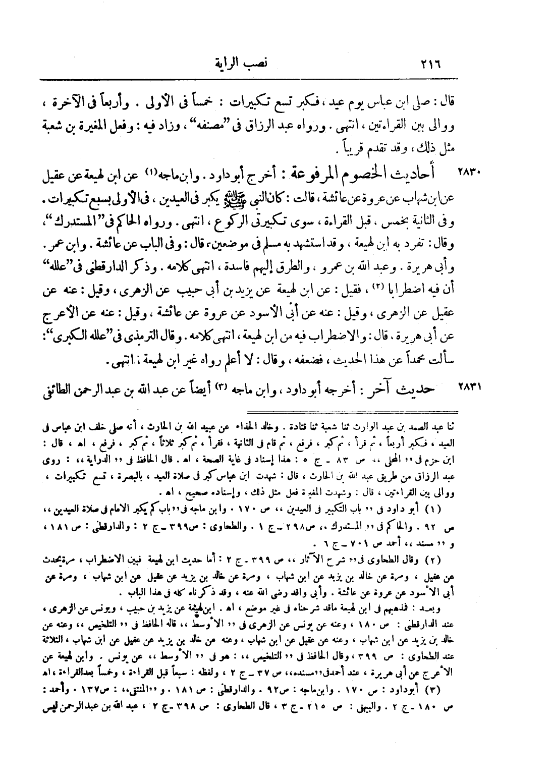 أَحَادِيثُ الْخُصُومِ الْمَرْفُوعَةِ: أَخْرَجَ أَبُو دَاوُد. وَابْنُ مَاجَهْ1 عَنْ ابْنِ لَهِيعَةَ عَنْ عُقَيْلٍ عَنْ ابْنِ شِهَابٍ عَنْ عُرْوَةَ عَنْ عَائِشَةَ، قَالَتْ: كَانَ النَّبِيُّ صَلَّى اللَّهُ عَلَيْهِ وَسَلَّمَ يُكَبِّرُ فِي الْعِيدَيْنِ، فِي الْأُولَى بِسَبْعِ تَكْبِيرَاتٍ. وَفِي الثَّانِيَةِ بِخَمْسٍ، قَبْلَ الْقِرَاءَةِ، سِوَى تَكْبِيرَتَيْ الرُّكُوعِ، انْتَهَى. وَرَوَاهُ الْحَاكِمُ فِي "الْمُسْتَدْرَكِ"، وَقَالَ: تَفَرَّدَ بِهِ ابْنُ لَهِيعَةَ، وَقَدْ اسْتَشْهَدَ بِهِ مُسْلِمٌ فِي مَوْضِعَيْنِ، قَالَ: وَفِي الْبَابِ عَنْ عَائِشَةَ. وَابْنُ عُمَرَ. وَأَبِي هُرَيْرَةَ. وَعَبْدَ اللَّهِ بْنَ عَمْرِو، وَالطُّرُقُ إلَيْهِمْ فَاسِدَةٌ، انْتَهَى كَلَامُهُ. وَذَكَرَ الدَّارَقُطْنِيُّ فِي "عِلَلِهِ" أَنَّ فِيهِ اضْطِرَابًا2، فَقِيلَ: عَنْ ابْنِ لَهِيعَةَ عَنْ يَزِيدَ بْنِ أَبِي حَبِيبٍ عَنْ الزُّهْرِيِّ، وَقِيلَ: عَنْهُ عَنْ عُقَيْلٍ عَنْ الزُّهْرِيِّ، وَقِيلَ: عَنْهُ عَنْ أَبِي الْأَسْوَدِ عَنْ عُرْوَةَ عَنْ عَائِشَةَ، وَقِيلَ: عَنْهُ عَنْ الْأَعْرَجِ عَنْ أَبِي هُرَيْرَةَ، قَالَ: وَالِاضْطِرَابُ فِيهِ مِنْ ابْنِ لَهِيعَةَ، انْتَهَى كَلَامُهُ. وَقَالَ التِّرْمِذِيُّ فِي "عِلَلِهِ الْكُبْرَى": سَأَلْت مُحَمَّدًا عَنْ هَذَا الْحَدِيثِ، فَضَعَّفَهُ، وَقَالَ: لَا أَعْلَمُ رَوَاهُ غَيْرَ ابْنِ لَهِيعَةَ، انْتَهَى.