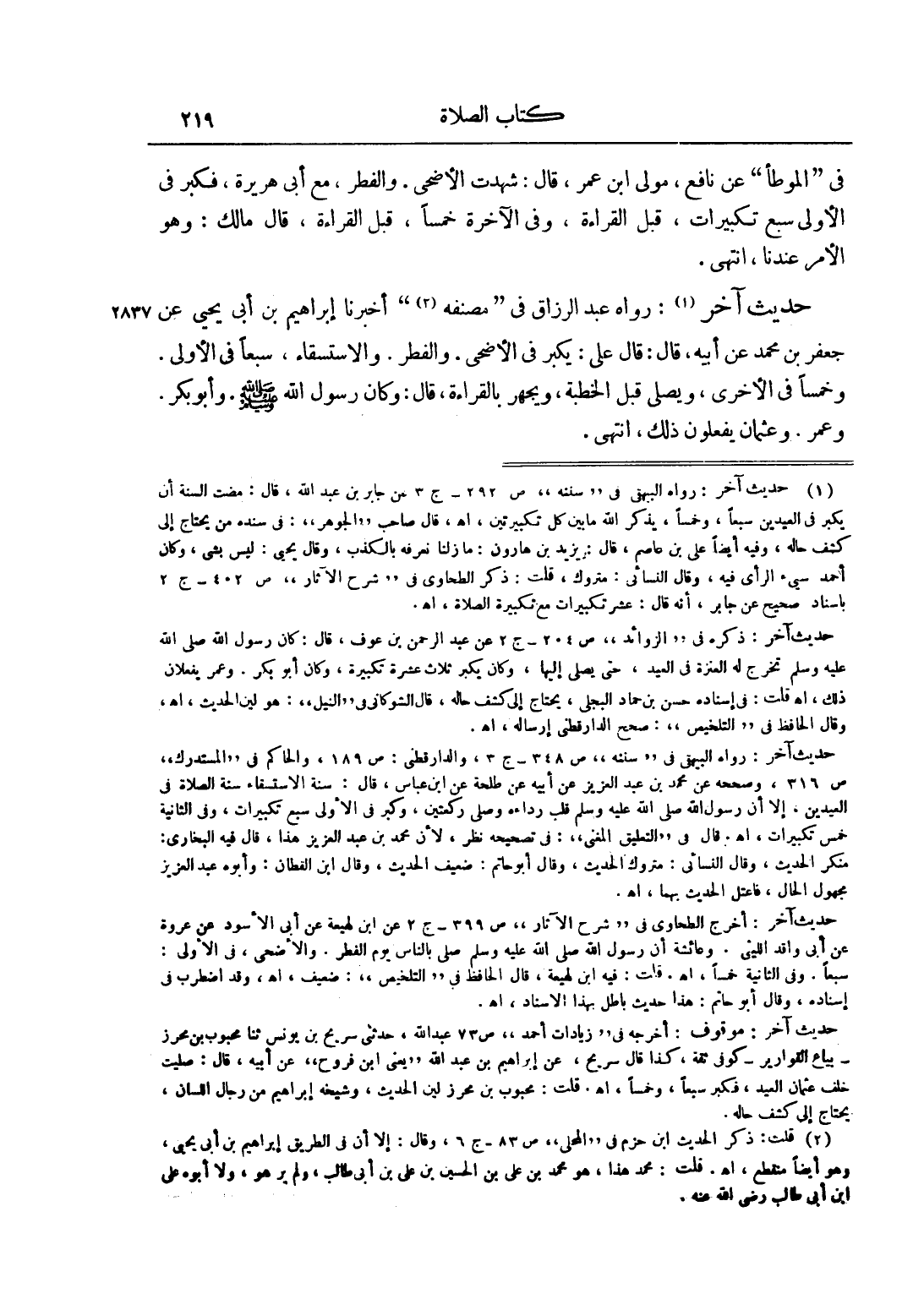 حديث آخر: موقوف: أخرجه في "زيادات أحمد" ص 73 عبد الله، حدثني سريح بن يونس حدثنا محبوب بن محرز بياع القوارير كوفي ثقة، كذا قال سريح، عن إبراهيم بن عبد الله "يعني ابن فروح" عن أبيه، قال: صليت خلف عثمان العيد، فكبر سبعاً، وخمساً، اهـ. قلت: محبوب بن محرز لين الحديث، وشيخه إبراهيم من رجال اللسان يحتاج إلى كشف حاله.