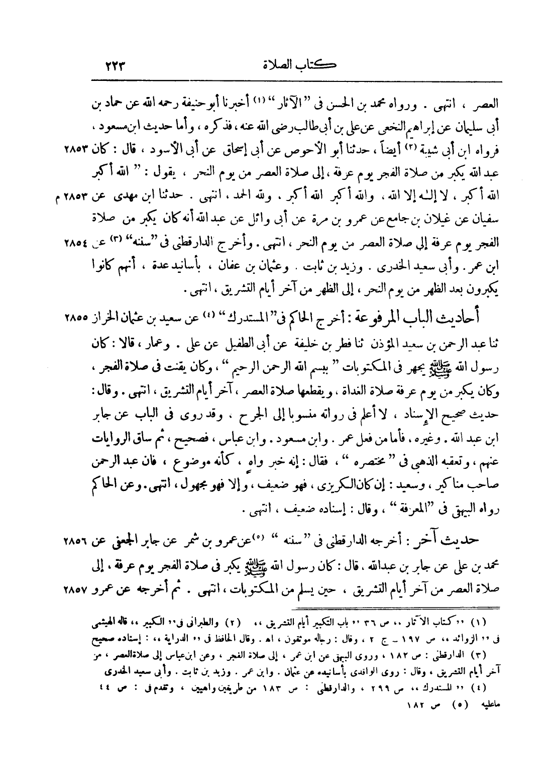 أَحَادِيثُ الْبَابِ الْمَرْفُوعَةِ: أَخْرَجَ الْحَاكِمُ فِي "الْمُسْتَدْرَكِ"4 عَنْ سَعِيدِ بْنِ عُثْمَانَ الْخَرَّازِ ثَنَا عَبْدُ الرَّحْمَنِ بْنُ سَعِيدٍ الْمُؤَذِّنُ ثَنَا فِطْرُ بْنُ خَلِيفَةَ عَنْ أَبِي الطُّفَيْلِ عَنْ عَلِيٍّ. وَعَمَّارٍ، قَالَا: كَانَ رَسُولُ اللَّهِ صَلَّى اللَّهُ عَلَيْهِ وَسَلَّمَ يَجْهَرُ فِي الْمَكْتُوبَاتِ "بِبِسْمِ اللَّهِ الرَّحْمَنِ الرَّحِيمِ"، وَكَانَ يَقْنُتُ فِي صَلَاةِ الْفَجْرِ، وَكَانَ يُكَبِّرُ مِنْ يَوْمِ عَرَفَةَ صَلَاةَ الْغَدَاةِ، وَيَقْطَعُهَا صَلَاةَ الْعَصْرِ، آخِرَ أَيَّامِ التَّشْرِيقِ، انْتَهَى. وَقَالَ: حَدِيثٌ صَحِيحُ الْإِسْنَادِ، لَا أَعْلَمُ فِي رُوَاتِهِ مَنْسُوبًا إلَى الْجَرْحِ، وَقَدْ رَوَى فِي الْبَابِ عَنْ جَابِرِ بْنِ عَبْدِ اللَّهِ. وَغَيْرِهِ، فَأَمَّا مِنْ فِعْلِ عُمَرَ. وَابْنِ مَسْعُودٍ. وَابْنِ عَبَّاسٍ. فَصَحِيحٌ، ثُمَّ سَاقَ الرِّوَايَاتِ عَنْهُمْ، وَتَعَقَّبَهُ الذَّهَبِيُّ فِي "مُخْتَصَرِهِ"، فَقَالَ: إنَّهُ خَبَرٌ وَاهٍ، كَأَنَّهُ مَوْضُوعٌ، فَإِنَّ عَبْدَ الرَّحْمَنِ صَاحِبُ مَنَاكِيرَ، وَسَعِيدَ: إنْ كَانَ الْكُرَيْزِيُّ، فَهُوَ ضَعِيفٌ، وَإِلَّا فَهُوَ مَجْهُولٌ، انْتَهَى. وَعَنْ الْحَاكِمِ رَوَاهُ الْبَيْهَقِيُّ فِي "الْمَعْرِفَةِ"، وَقَالَ: إسْنَادُهُ ضَعِيفٌ، انْتَهَى.