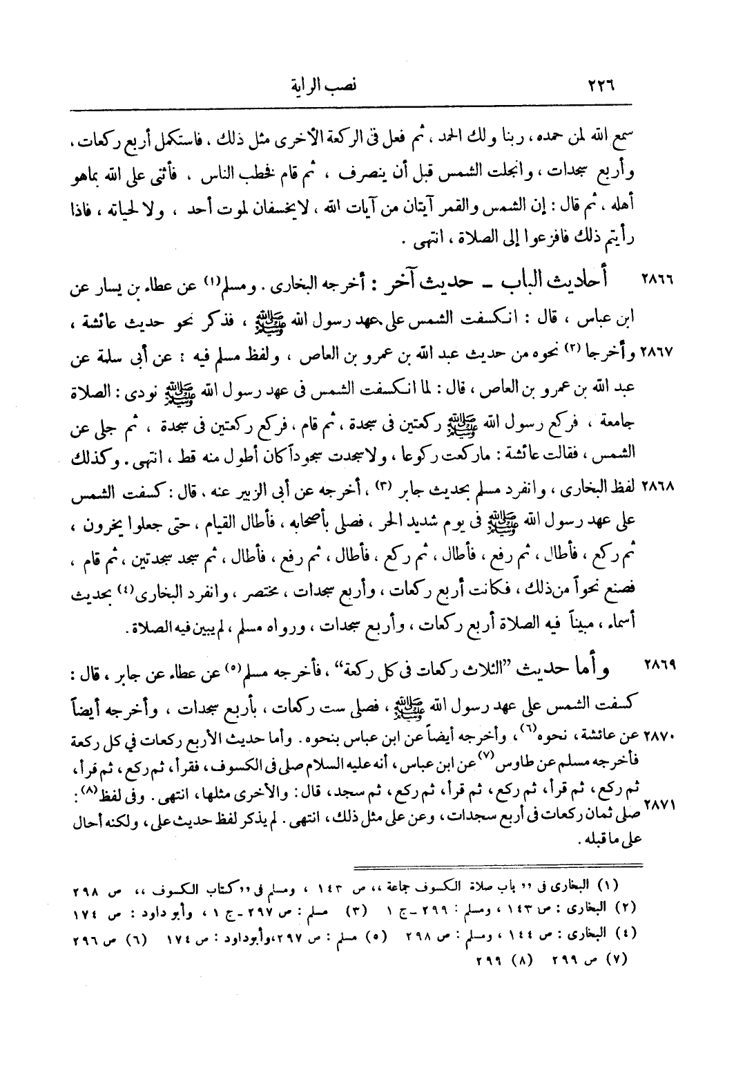 أَحَادِيثُ الْبَابِ حَدِيثٌ آخَرُ: أَخْرَجَهُ الْبُخَارِيُّ. وَمُسْلِمٌ1 عَنْ عَطَاءِ بْنِ يَسَارٍ عَنْ ابْنِ عَبَّاسٍ، قَالَ: انْكَسَفَتْ الشَّمْسُ عَلَى عَهْدِ رَسُولِ اللَّهِ صَلَّى اللَّهُ عَلَيْهِ وَسَلَّمَ، فَذَكَرَ نَحْوَ حَدِيثِ عَائِشَةَ، وَأَخْرَجَا2 نَحْوَهُ مِنْ حَدِيثِ عَبْدِ اللَّهِ بْنِ عَمْرِو بْنِ الْعَاصِ، وَلَفْظُ مُسْلِمٍ فِيهِ: عَنْ أَبِي سَلَمَةَ عَنْ عَبْدِ اللَّهِ بْنِ عَمْرِو بْنِ الْعَاصِ، قَالَ: لَمَّا انْكَسَفَتْ الشَّمْسُ فِي عَهْدِ رَسُولِ اللَّهِ صَلَّى اللَّهُ عَلَيْهِ وَسَلَّمَ نُودِيَ: الصَّلَاةُ جَامِعَةٌ، فَرَكَعَ رَسُولُ اللَّهِ صَلَّى اللَّهُ عَلَيْهِ وَسَلَّمَ رَكْعَتَيْنِ فِي سَجْدَةٍ، ثُمَّ قَامَ، فَرَكَعَ رَكْعَتَيْنِ فِي سَجْدَةٍ، ثُمَّ جَلَى عَنْ الشَّمْسِ، فَقَالَتْ عَائِشَةُ: مَا رَكَعْتُ رُكُوعًا، وَلَا سَجَدْتُ سُجُودًا كَانَ أَطْوَلَ مِنْهُ قَطُّ، انْتَهَى. وَكَذَلِكَ لَفْظُ الْبُخَارِيِّ، وَانْفَرَدَ مُسْلِمٌ بِحَدِيثِ جَابِرٍ3، أَخْرَجَهُ عَنْ أَبِي الزُّبَيْرِ عَنْهُ، قَالَ: كَسَفَتْ الشَّمْسُ عَلَى عَهْدِ رَسُولِ اللَّهِ صَلَّى اللَّهُ عَلَيْهِ وَسَلَّمَ فِي يَوْمٍ شَدِيدِ الْحَرِّ، فَصَلَّى بِأَصْحَابِهِ، فَأَطَالَ الْقِيَامَ، حَتَّى جَعَلُوا يَخِرُّونَ، ثُمَّ رَكَعَ، فَأَطَالَ، ثُمَّ رَفَعَ، فَأَطَالَ، ثُمَّ رَكَعَ، فَأَطَالَ، ثُمَّ رَفَعَ، فَأَطَالَ، ثُمَّ سَجَدَ سَجْدَتَيْنِ، ثُمَّ قَامَ، فَصَنَعَ نَحْوًا مِنْ ذَلِكَ، فَكَانَتْ أَرْبَعَ رَكَعَاتٍ، وَأَرْبَعَ سَجَدَاتٍ، مُخْتَصَرٌ، وَانْفَرَدَ الْبُخَارِيُّ4 بِحَدِيثِ أَسْمَاءَ، مُبِينًا فِيهِ الصَّلَاةَ أَرْبَعَ رَكَعَاتِ، وَأَرْبَعَ سَجَدَاتٍ، وَرَوَاهُ مُسْلِمٌ، يُبَيِّنُ فِيهِ الصَّلَاةَ.