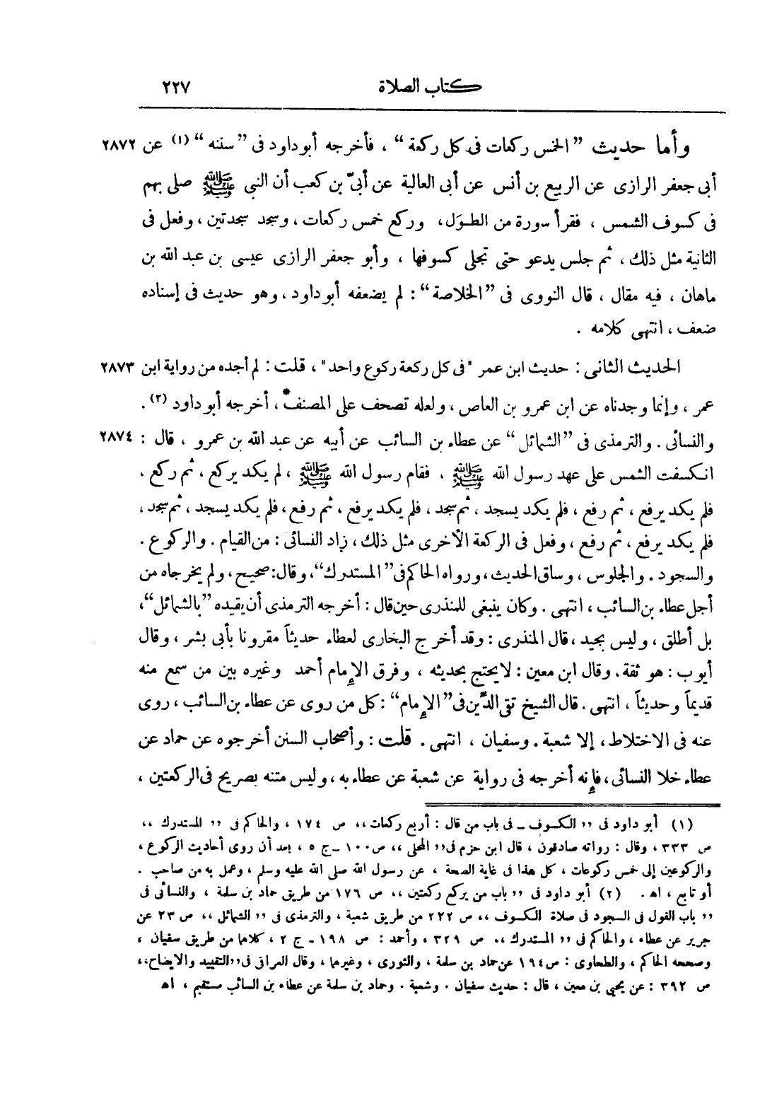 وَأَمَّا حَدِيثُ "الْخَمْسُ رَكَعَاتٍ فِي كُلِّ رَكْعَةٍ"، فَأَخْرَجَهُ أَبُو دَاوُد فِي "سُنَنِهِ"1 عَنْ أَبِي جَعْفَرٍ الرَّازِيُّ عَنْ الرَّبِيعِ بْنِ أَنَسٍ عَنْ أَبِي الْعَالِيَةِ عَنْ أُبَيِّ بْنِ كَعْبٍ أَنَّ النَّبِيَّ صَلَّى اللَّهُ عَلَيْهِ وَسَلَّمَ صَلَّى بِهِمْ فِي كُسُوفِ الشَّمْسِ، فَقَرَأَ سُورَةً مِنْ الطِّوَالِ، وَرَكَعَ خَمْسَ رَكَعَاتٍ، وَسَجَدَ سَجْدَتَيْنِ، وَفَعَلَ فِي الثَّانِيَةِ مِثْلَ ذَلِكَ، ثُمَّ جَلَسَ يَدْعُو حَتَّى تَجَلَّى كُسُوفُهَا، وَأَبُو جَعْفَرٍ الرَّازِيُّ عِيسَى بْنُ عَبْدِ اللَّهِ بْنِ مَاهَانَ، فِيهِ مَقَالٌ، قَالَ النَّوَوِيُّ فِي "الْخُلَاصَةِ": لَمْ يُضَعِّفْهُ أَبُو دَاوُد، وَهُوَ حَدِيثٌ فِي إسْنَادِهِ ضَعْفٌ، انْتَهَى كَلَامُهُ.