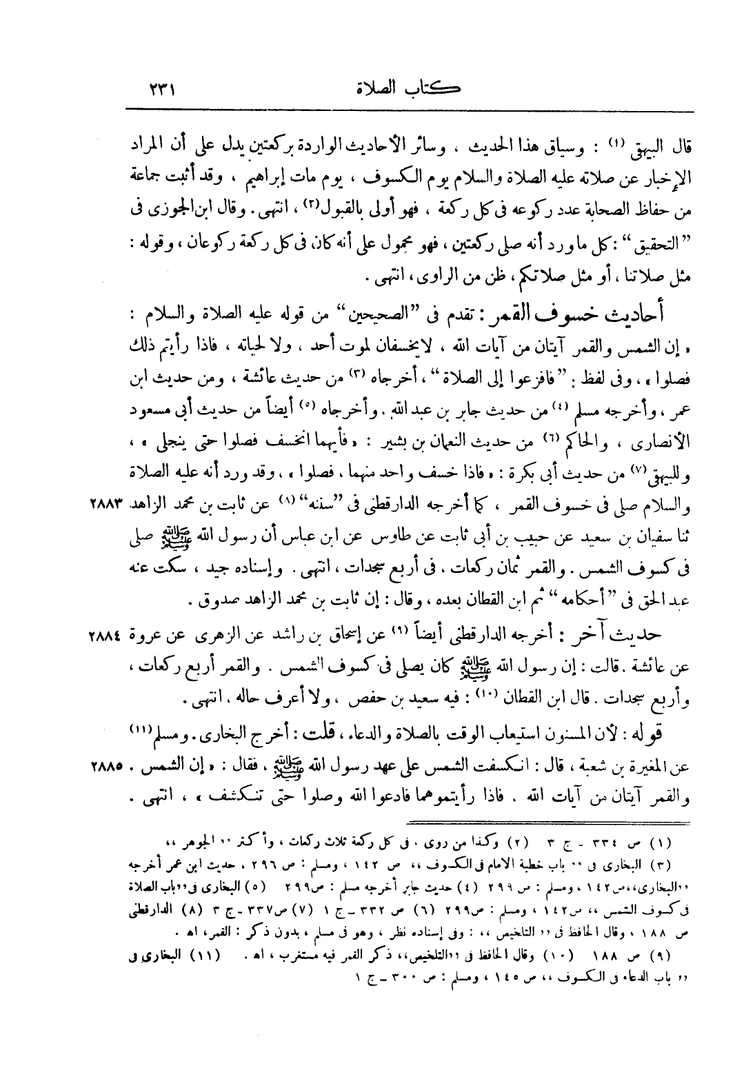 أَحَادِيثُ خُسُوفِ الْقَمَرِ: تَقَدَّمَ فِي "الصَّحِيحَيْنِ" مِنْ قَوْلِهِ عليه الصلاة والسلام: "إنَّ الشَّمْسَ وَالْقَمَرَ آيَتَانِ مِنْ آيَاتِ اللَّهِ، لَا يُخْسَفَانِ لِمَوْتِ أَحَدٍ، وَلَا لِحَيَاتِهِ، فَإِذَا رَأَيْتُمْ ذَلِكَ فَصَلُّوا"، وَفِي لَفْظٍ: "فَافْزَعُوا إلَى الصَّلَاةِ"، أَخْرَجَاهُ3 مِنْ حَدِيثِ عَائِشَةَ، وَمِنْ حَدِيثِ ابْنِ عُمَرَ وَأَخْرَجَهُ مُسْلِمٌ4 مِنْ حَدِيثِ جَابِرِ بْنِ عَبْدِ اللَّهِ وَأَخْرَجَاهُ5 أيضا حَدِيثِ أَبِي مَسْعُودٍ الْأَنْصَارِيِّ، وَالْحَاكِمُ6 مِنْ حَدِيثِ النُّعْمَانِ بْنِ بَشِيرٍ: "فَأَيُّهُمَا انْخَسَفَ فَصَلُّوا حَتَّى يَنْجَلِيَ"، وَلِلْبَيْهَقِيِّ7 مِنْ حَدِيثِ أَبِي بَكْرَةَ: "فَإِذَا خَسَفَ وَاحِدٌ مِنْهُمَا، فَصَلُّوا"، وَقَدْ وَرَدَ أَنَّهُ عليه الصلاة والسلام صَلَّى فِي خُسُوفِ الْقَمَرِ، كَمَا أَخْرَجَهُ الدَّارَقُطْنِيُّ فِي "سُنَنِهِ"8 عَنْ ثَابِتِ بْنِ مُحَمَّدٍ الزَّاهِدِ ثَنَا سُفْيَانُ بْنُ سَعِيدٍ عَنْ حَبِيبِ بْنِ أَبِي ثَابِتٍ عَنْ طَاوُسٍ عَنْ ابْنِ عَبَّاسٍ أَنَّ رَسُولَ اللَّهِ صَلَّى اللَّهُ عَلَيْهِ وَسَلَّمَ صَلَّى فِي كُسُوفِ الشَّمْسِ. وَالْقَمَرِ ثَمَانِ رَكَعَاتٍ فِي أَرْبَعِ سَجَدَاتٍ. انْتَهَى. وَإِسْنَادُهُ جَيِّدٌ، سَكَتَ عَنْهُ عَبْدُ الْحَقِّ فِي "أَحْكَامِهِ" ثُمَّ ابْنُ الْقَطَّانِ بَعْدَهُ، وَقَالَ: إنَّ ثَابِتَ بْنَ مُحَمَّدٍ الزَّاهِدَ صَدُوقٌ.