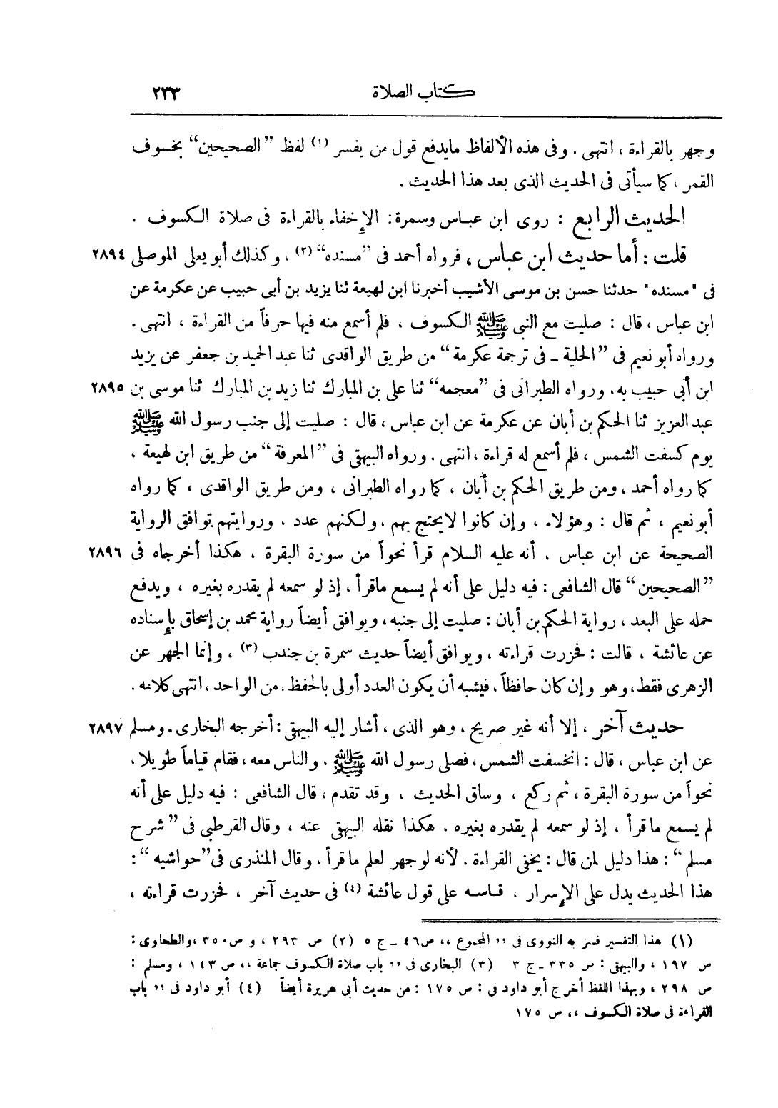 قُلْت: أَمَّا حَدِيثُ ابْنِ عَبَّاسٍ، فَرَوَاهُ أَحْمَدُ فِي "مُسْنَدِهِ"2، وَكَذَلِكَ أَبُو يَعْلَى الْمَوْصِلِيُّ فِي "مُسْنَدِهِ" حدثنا حسن بن مُوسَى الْأَشْيَبِ أَنْبَأَ ابْنُ لَهِيعَةَ ثَنَا يَزِيدُ بْنُ أَبِي حَبِيبٍ عَنْ عِكْرِمَةَ عَنْ ابْنِ عَبَّاسٍ، قَالَ: صَلَّيْت مَعَ النَّبِيِّ صَلَّى اللَّهُ عَلَيْهِ وَسَلَّمَ الْكُسُوفَ، فَلَمْ أَسْمَعْ مِنْهُ فِيهَا حَرْفًا مِنْ الْقِرَاءَةِ، انْتَهَى. وَرَوَاهُ أَبُو نُعَيْمٍ فِي "الْحِلْيَةِ فِي تَرْجَمَةِ عِكْرِمَةَ" مِنْ طَرِيقِ الْوَاقِدِيِّ ثَنَا عَبْدُ الْحَمِيدِ بْنُ جَعْفَرٍ عَنْ يَزِيدَ بْنِ أَبِي حَبِيبٍ بِهِ، وَرَوَاهُ الطَّبَرَانِيُّ فِي "مُعْجَمِهِ" ثَنَا عَلِيُّ بْنُ الْمُبَارَكِ ثَنَا زَيْدُ بْنُ الْمُبَارَكِ ثَنَا مُوسَى بْنُ عَبْدِ الْعَزِيزِ ثَنَا الْحَكَمُ بْنُ أَبَانَ عَنْ عِكْرِمَةَ عَنْ ابْنِ عَبَّاسٍ، قَالَ: صَلَّيْت إلَى جَنْبِ رَسُولِ اللَّهِ صَلَّى اللَّهُ عَلَيْهِ وَسَلَّمَ يَوْمَ كَسَفَتْ الشَّمْسُ، فَلَمْ أَسْمَعْ لَهُ قِرَاءَةً، انْتَهَى. وَرَوَاهُ الْبَيْهَقِيُّ فِي "الْمَعْرِفَةِ" مِنْ طَرِيقِ ابْنِ لَهِيعَةَ، كَمَا رَوَاهُ أَحْمَدُ، وَمِنْ طَرِيقِ الْحَكَمِ بْنِ أَبَانَ، كَمَا رَوَاهُ الطَّبَرَانِيُّ، وَمِنْ طَرِيقِ الْوَاقِدِيِّ، كَمَا رَوَاهُ أَبُو نُعَيْمٍ، ثُمَّ قَالَ: وَهَؤُلَاءِ، وَإِنْ كَانُوا لَا يُحْتَجُّ بِهِمْ، وَلَكِنَّهُمْ عَدَدٌ، وَرِوَايَتُهُمْ تُوَافِقُ الرِّوَايَةَ الصَّحِيحَةَ عَنْ ابْنِ عَبَّاسٍ، أَنَّهُ عليه السلام قَرَأَ نَحْوًا مِنْ سُورَةِ الْبَقَرَةِ، هَكَذَا أَخْرَجَاهُ فِي "الصَّحِيحَيْنِ" قَالَ الشَّافِعِيُّ: فِيهِ دَلِيلٌ عَلَى أَنَّهُ لَمْ يَسْمَعْ مَا قَرَأَ، إذْ لَوْ سَمِعَهُ لَمْ يُقَدِّرْهُ بِغَيْرِهِ، وَيَدْفَعُ حَمْلَهُ عَلَى الْبَعْدِ، رِوَايَةُ الْحَكَمِ بْنِ أَبَانَ: صَلَّيْت إلَى جَنْبِهِ، وَيُوَافِقُ أَيْضًا رِوَايَةَ مُحَمَّدِ بْنِ إسْحَاقَ بِإِسْنَادِهِ عَنْ عَائِشَةَ، قَالَتْ: فَحَزَرْتُ قِرَاءَتَهُ، وَيُوَافِقُ أَيْضًا حَدِيثَ سَمُرَةَ بْنِ جُنْدُبٍ3، وَإِنَّمَا الْجَهْرُ عَنْ الزُّهْرِيِّ فَقَطْ، وَهُوَ وَإِنْ كَانَ حَافِظًا، فَيُشْبِهُ أَنْ يَكُونَ الْعَدَدُ أَوْلَى بِالْحِفْظِ، مِنْ الْوَاحِدِ، انْتَهَى كَلَامُهُ.