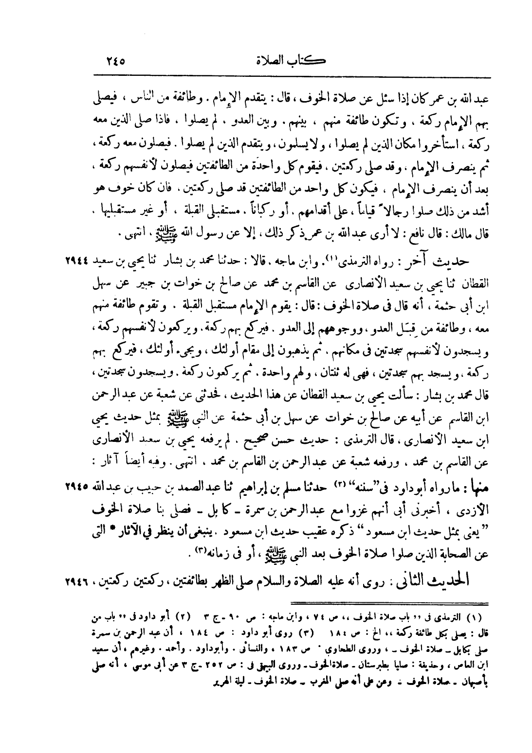 3 روى أبو داود: ص 184، أن عبد الرحمن بن سمرة صلى بكابل صلاة الخوف، وروى الطحاوي. ص 183، والنسائي. وأبو داود. وأحمد. وغيرهم، أن سعيد ابن العاص، وحذيفة: صليا بطبرستان صلاة الخوف وروى البيهقي في: ص 252 ج 3 عن أبي موسى، أنه صلى بأصبهان صلاة الخوف وعن علي أنه صلى المغرب صلاة الخوف ليلة الهرير.
