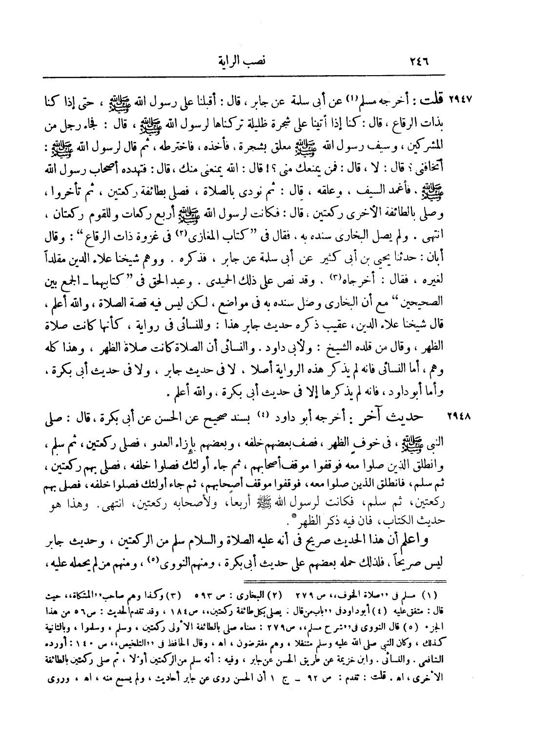 قُلْت: أَخْرَجَهُ مُسْلِمٌ1 عَنْ أَبِي سَلَمَةَ عَنْ جَابِرٍ، قَالَ: أَقْبَلْنَا عَلَى رَسُولِ اللَّهِ صَلَّى اللَّهُ عَلَيْهِ وَسَلَّمَ، حَتَّى إذَا كُنَّا بِذَاتِ الرِّقَاعِ، قَالَ: كُنَّا إذَا أَتَيْنَا عَلَى شَجَرَةٍ ظَلِيلَةٍ لِرَسُولِ اللَّهِ صَلَّى اللَّهُ عَلَيْهِ وَسَلَّمَ، قَالَ: فَجَاءَ رَجُلٌ مِنْ الْمُشْرِكِينَ، وَسَيْفُ رَسُولِ اللَّهِ صَلَّى اللَّهُ عَلَيْهِ وَسَلَّمَ مُعَلَّقٌ بِشَجَرَةٍ، فَأَخَذَهُ، فَاخْتَرَطَهُ، ثُمَّ قَالَ لِرَسُولِ اللَّهِ صَلَّى اللَّهُ عَلَيْهِ وَسَلَّمَ: أَتَخَافُنِي؟ قَالَ: "لَا"، قَالَ: فَمَنْ يَمْنَعُكَ مِنِّي؟! قَالَ: "اللَّهُ يَمْنَعُنِي مِنْك"، قَالَ: فَتَهَدَّدَهُ أَصْحَابُ رسول الله صَلَّى اللَّهُ عَلَيْهِ وَسَلَّمَن فَأَغْمَدَ السَّيْفَ، وَعَلَّقَهُ، قَالَ: ثُمَّ نُودِيَ بِالصَّلَاةِ، فَصَلَّى بِطَائِفَةٍ رَكْعَتَيْنِ، ثُمَّ تَأَخَّرُوا، وَصَلَّى بِالطَّائِفَةِ الْأُخْرَى رَكْعَتَيْنِ، قَالَ: فَكَانَتْ لِرَسُولِ اللَّهِ صَلَّى اللَّهُ عَلَيْهِ وَسَلَّمَ أَرْبَعُ رَكَعَاتٍ وَلِلْقَوْمِ رَكْعَتَانِ، انْتَهَى. وَلَمْ يَصِلْ الْبُخَارِيُّ سَنَدَهُ بِهِ، فَقَالَ فِي "كِتَابِ الْمَغَازِي2 فِي غَزْوَةِ ذَاتِ الرِّقَاعِ": وَقَالَ أَبَانُ: حَدَّثَنَا يَحْيَى بْنُ أَبِي كَثِيرٍ عَنْ أَبِي سَلَمَةَ عَنْ جَابِرٍ، فَذَكَرَهُ. وَوَهَمَ شَيْخُنَا عَلَاءُ الدِّينِ مُقَلِّدًا لِغَيْرِهِ، فَقَالَ: أَخْرَجَاهُ3، وَقَدْ نَصَّ عَلَى ذَلِكَ الْحُمَيْدِيُّ. وَعَبْدُ الْحَقِّ فِي "كِتَابَيْهِمَا الْجَمْعُ بَيْنَ الصَّحِيحَيْنِ" مَعَ أَنَّ الْبُخَارِيَّ وَصَلَ سَنَدَهُ بِهِ فِي مَوَاضِعَ، لَكِنْ لَيْسَ فِيهِ قِصَّةُ الصَّلَاةِ، وَاَللَّهُ أَعْلَمُ، قَالَ شَيْخُنَا عَلَاءُ الدِّينِ، عَقِيبَ ذِكْرِهِ حَدِيثَ جَابِرٍ هَذَا: وَلِلنَّسَائِيِّ فِي رِوَايَةٍ، كَأَنَّهَا كَانَتْ صَلَاةَ الظُّهْرِ، وَقَالَ مَنْ قَلَّدَهُ الشَّيْخُ: وَلِأَبِي دَاوُد. وَالنَّسَائِيُّ أَنَّ الصَّلَاةَ كَانَتْ صَلَاةَ الظُّهْرِ، وَهَذَا كُلُّهُ وَهْمٌ، أَمَّا النَّسَائِيُّ فَإِنَّهُ لَمْ يَذْكُرْ هَذِهِ الرِّوَايَةَ أَصْلًا، لَا فِي حَدِيثِ جَابِرٍ، وَلَا فِي حَدِيثِ أَبِي بَكْرَةَ، وَأَمَّا أَبُو دَاوُد، فَإِنَّهُ لَمْ يَذْكُرْهَا إلَّا فِي حَدِيثِ أَبِي بَكْرَةَ، وَاَللَّهُ أَعْلَمُ.